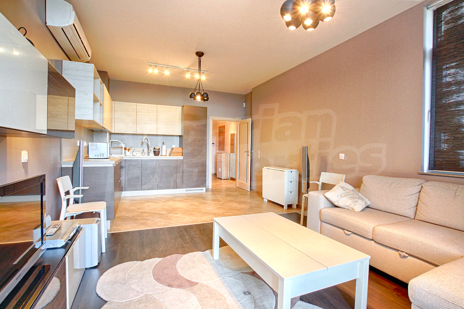 Имотът се предлага напълно завършен с качествена PVC дограма, интериорни врати, подове с висок клас паркет и стени боядисани с латекс. Отоплението е с централен ТЕЦ и климатик във всяка стая. Интериорът е модерен и освен красивата визия създава усещането за уникален уют и спокойствие. Жилището е обзаведено с всичко необходимо и очаква своите нови наематели.