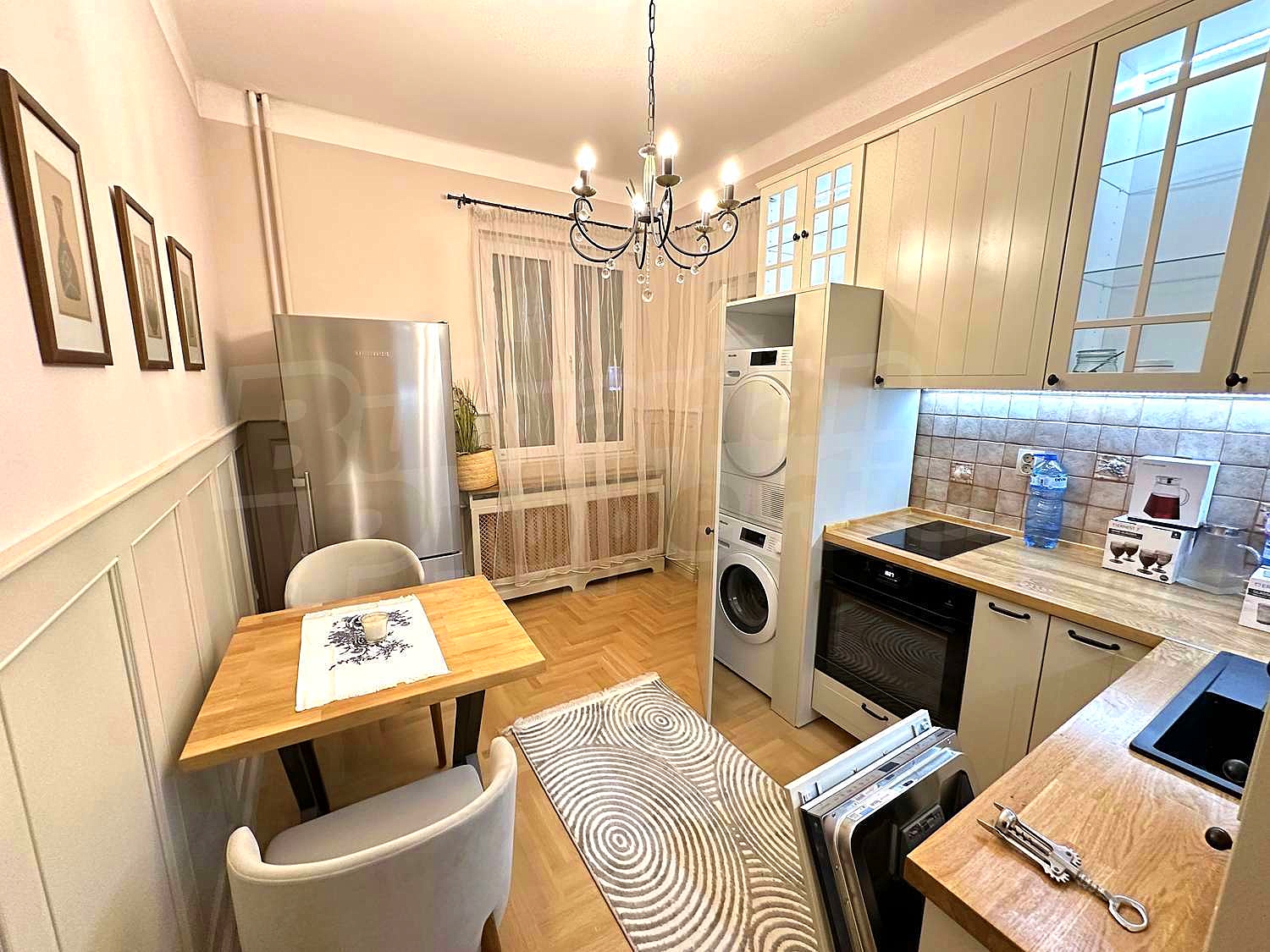 Добре дошли в този изискан, луксозно обзаведен апартамент с 2 спални, разположен в сърцето на София, очакващ своите първи наематели. Модерно обзаведеното жилище се характеризира с топ локация в центъра на София, до Петте кьошета, бул. Патриарх Евтимий, бул. Христо Ботев, Руски паметник, бул. Прага, бул. Ген. Скобелев, Софийски районен съд, градинки, църква, магазини, с удобен достъп до НДК, на 550 м до метростанция Медицински университет и редица други ежедневни удобства и услуги.