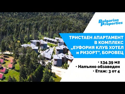 Уникална възможност да сте собственик на ваканционен имот сред боровите гори на Рила планина в прекрасния ски курорт Боровец, разположен само на около 72 км от столицата (един час път с кола). Апартаментът е готов за нанасяне и е част от модерния затворен комплекс „Еуфория Клуб Хотел и Ризорт“, построен сред тишина, спокойствие и зеленина, с лесен достъп до модерни ски съоръжения, в район, подходящ не само за зимни спортове, но и за летен туризъм, привличащ български и чуждестранни туристи през цялата година.