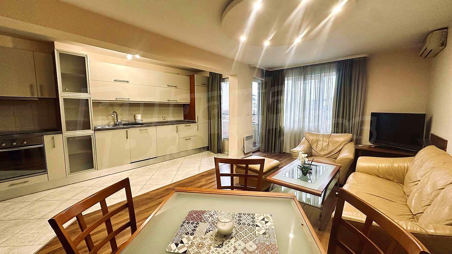 Апартаментът е обзаведен с качествени мебели и стилни интериорни решения, които създават усещане за уют и изисканост. Всяко помещение е изпълнено с естествена светлина благодарение на източното и западното изложение. Отоплението е решено с климатици.