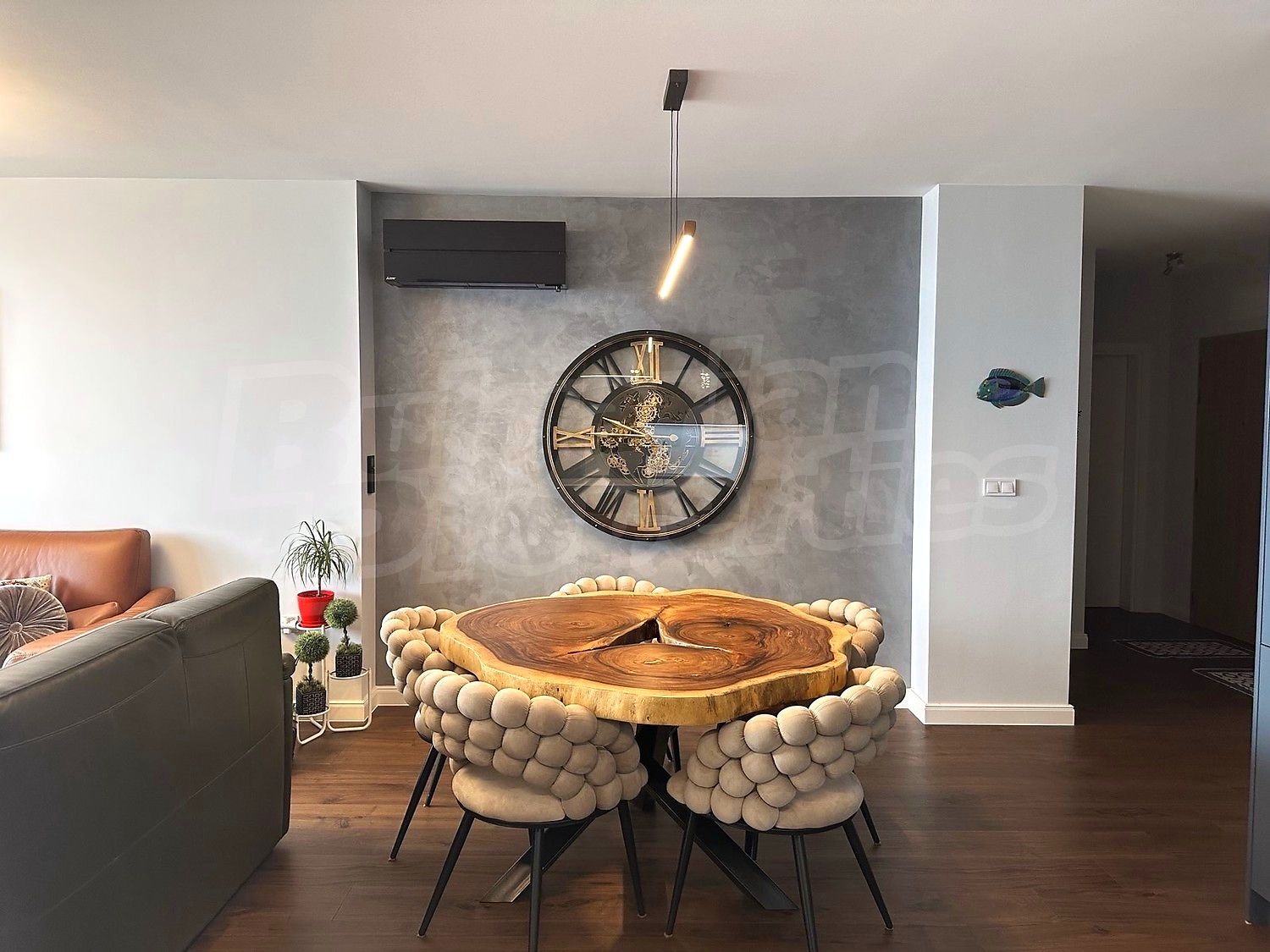 Апартаментът е напълно обзаведен и оборудван с висок клас мебели и електроуреди, подбрани с внимание към детайла, стил и комфорт.