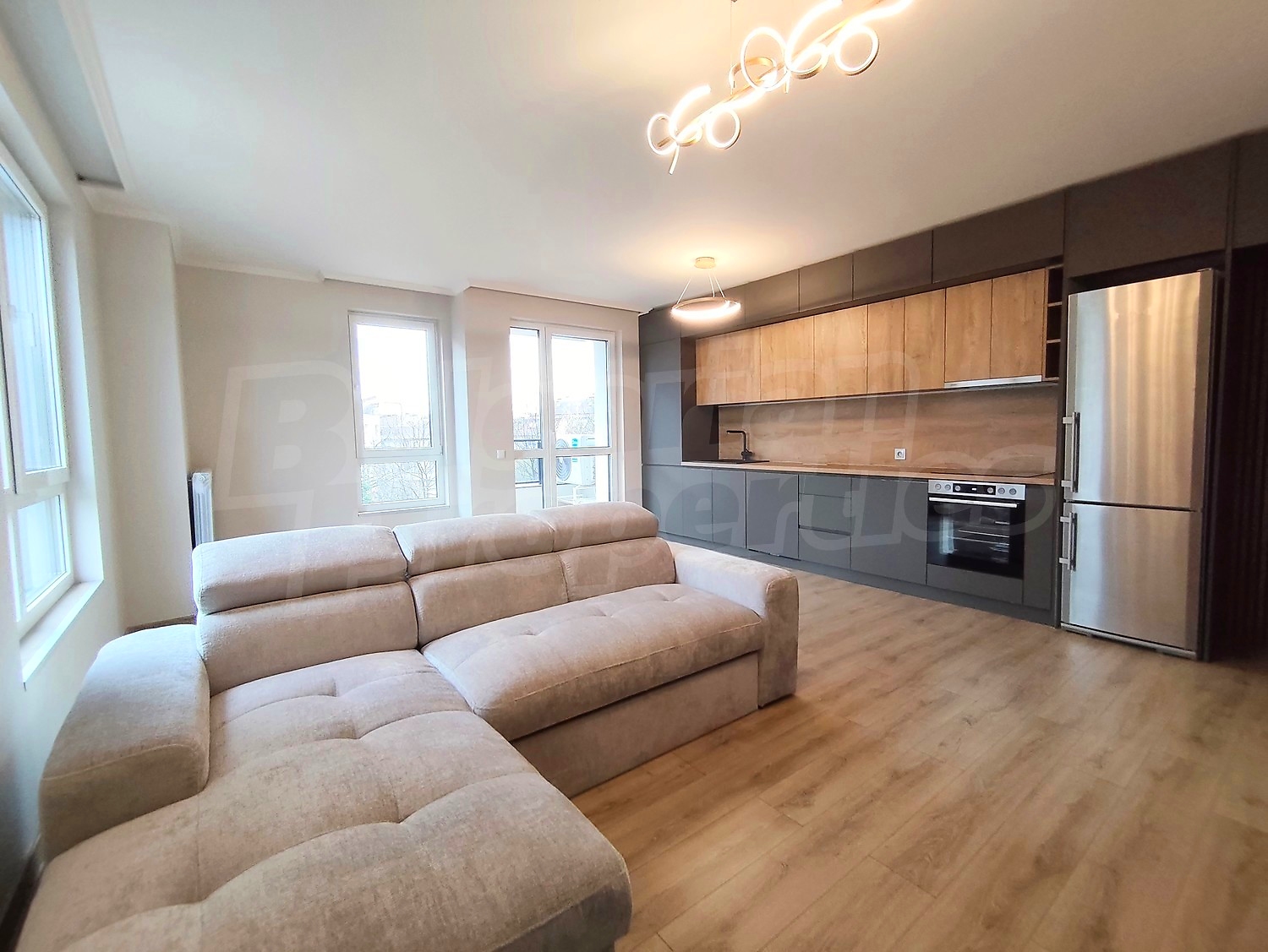 Жилището впечатлява с светла дневна зона тип „отворен план“, в която са хармонично съчетани хол и модерна кухня. Големите прозорци осигуряват изобилие от естествена светлина и създават усещане за простор и уют. Кухнята е изпълнена с внимание към детайла – изчистени фронтове в графитено сиво и дървесен декор, оборудвана с вградени електроуреди. Удобният ъглов диван оформя приятна зона за отдих и срещи с близки.