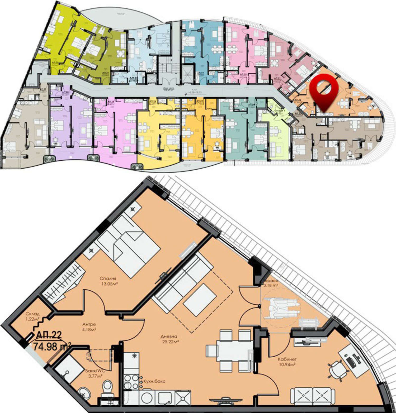 (2 250 €/м2) (4 400,62 лв./м2)Площ: 77.99 м2 Етаж: 4