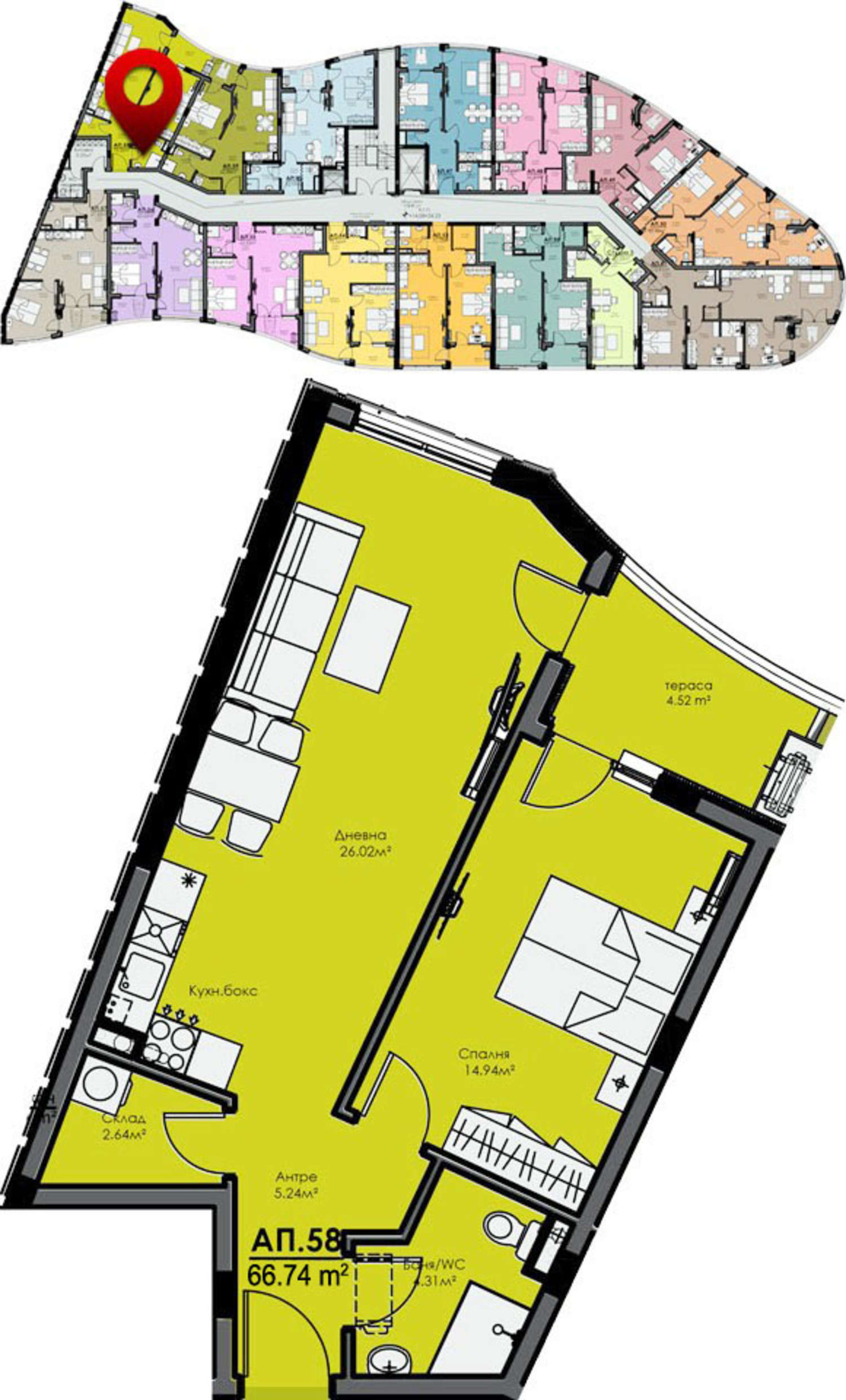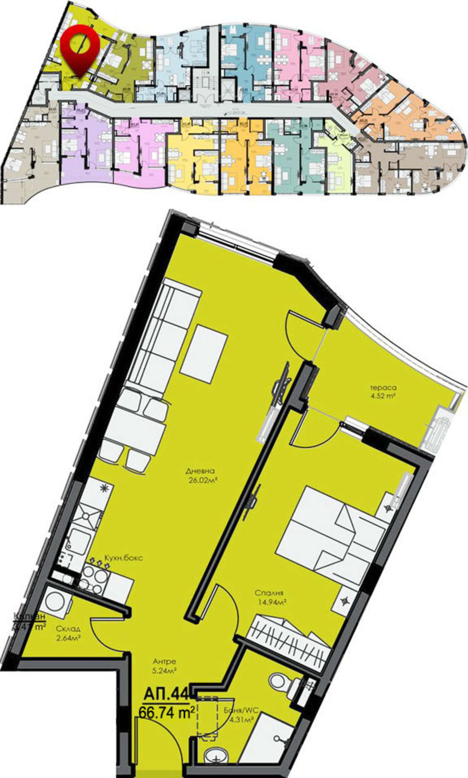 (2 249 €/м2) (4 398,66 лв./м2)Площ: 64.24 м2 Етаж: 4