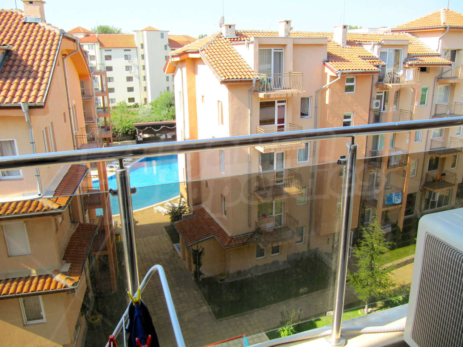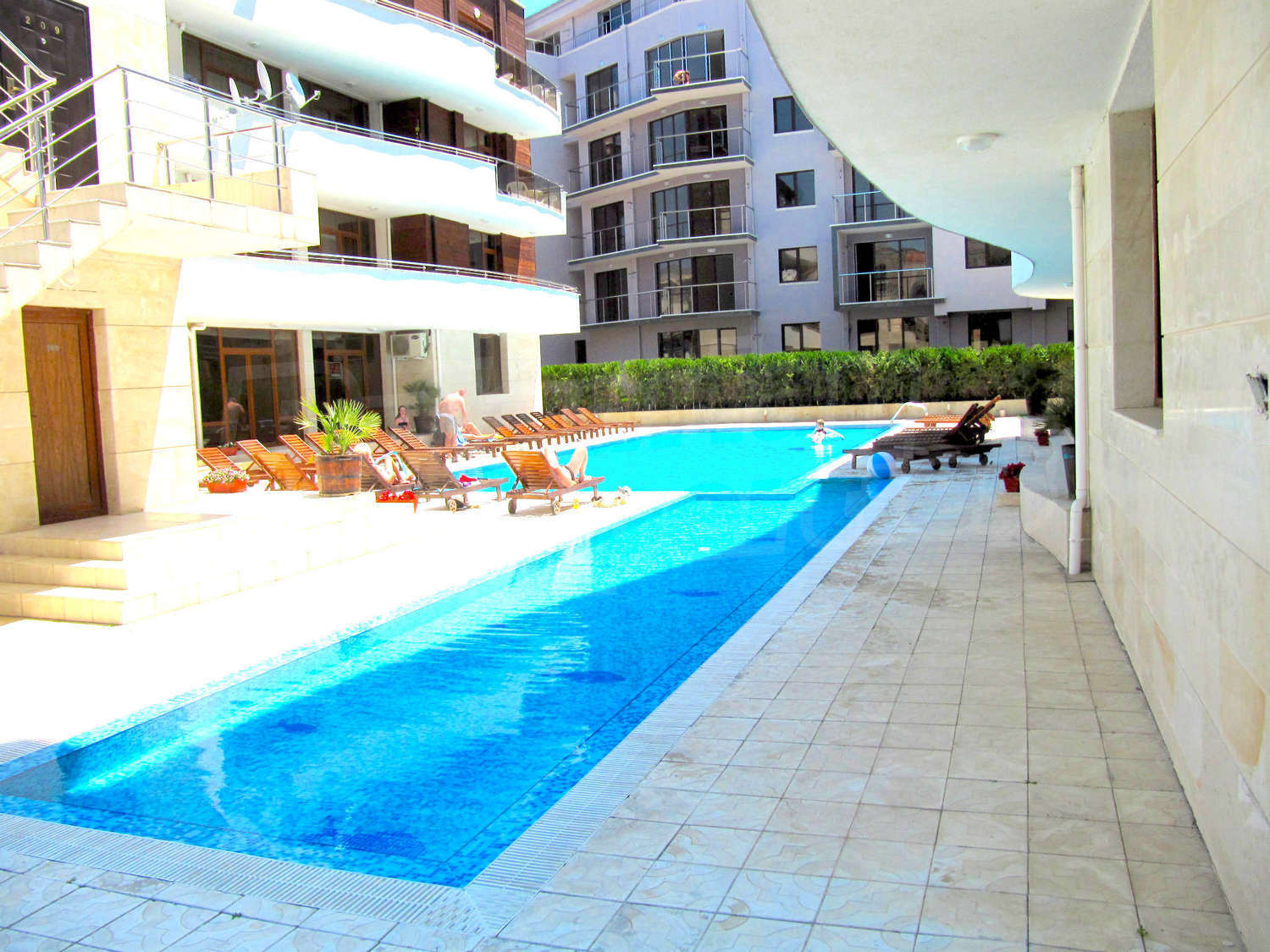 Апартаментът се намира на 5 етаж, в 6 етажната сграда, с удобен асансьор, басейн с детска секция и добре поддържан двор.