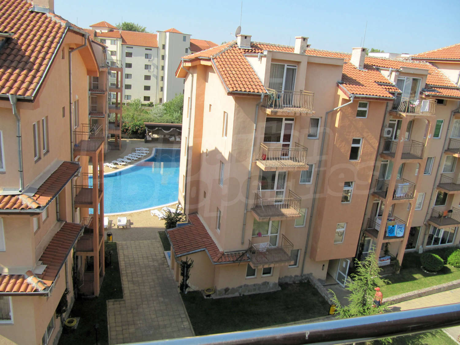 Апартаментът се намира на 5 етаж, в 6 етажната сграда, с удобен асансьор, басейн с детска секция и добре поддържан двор.