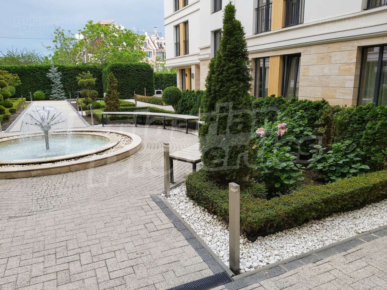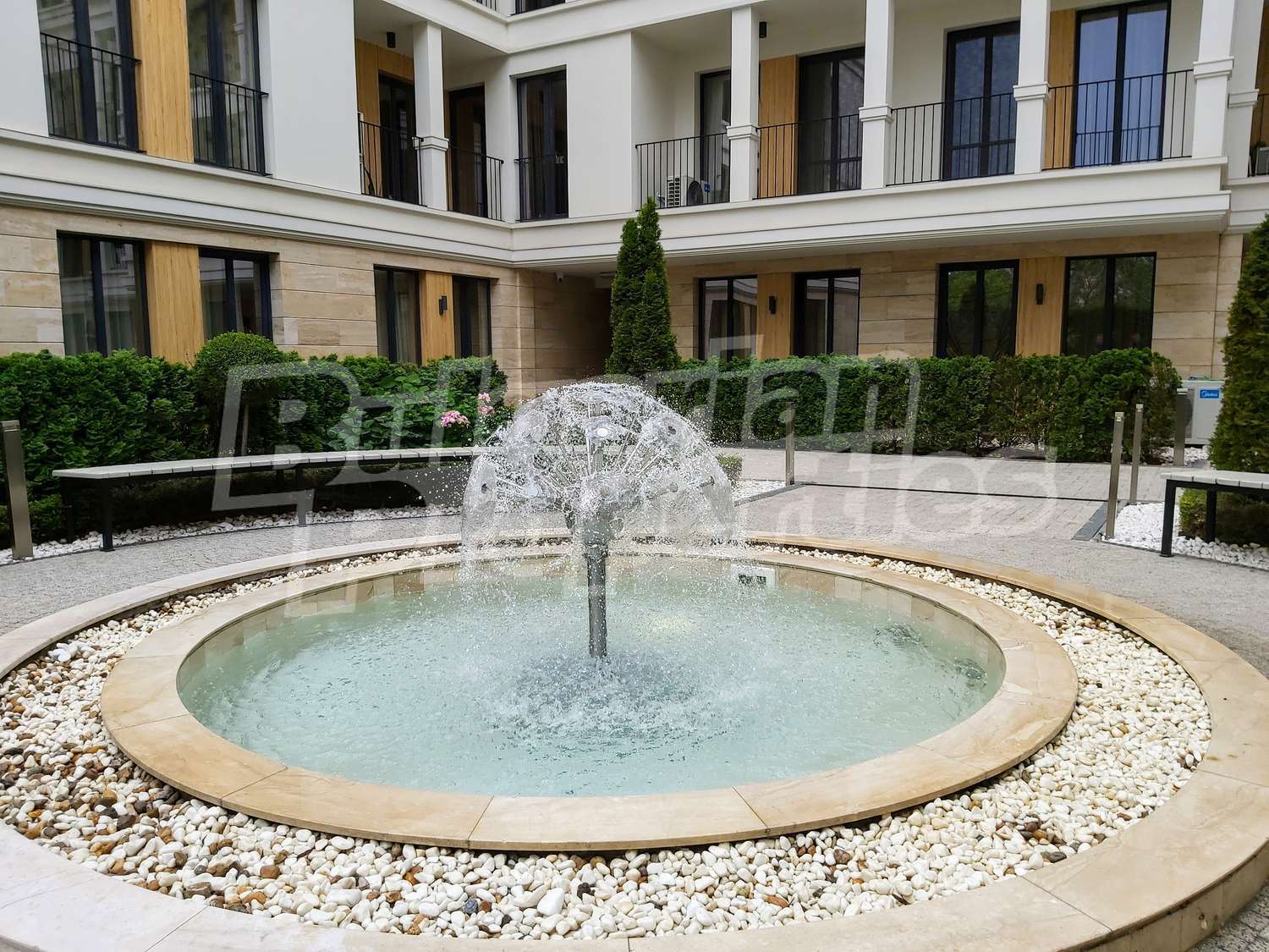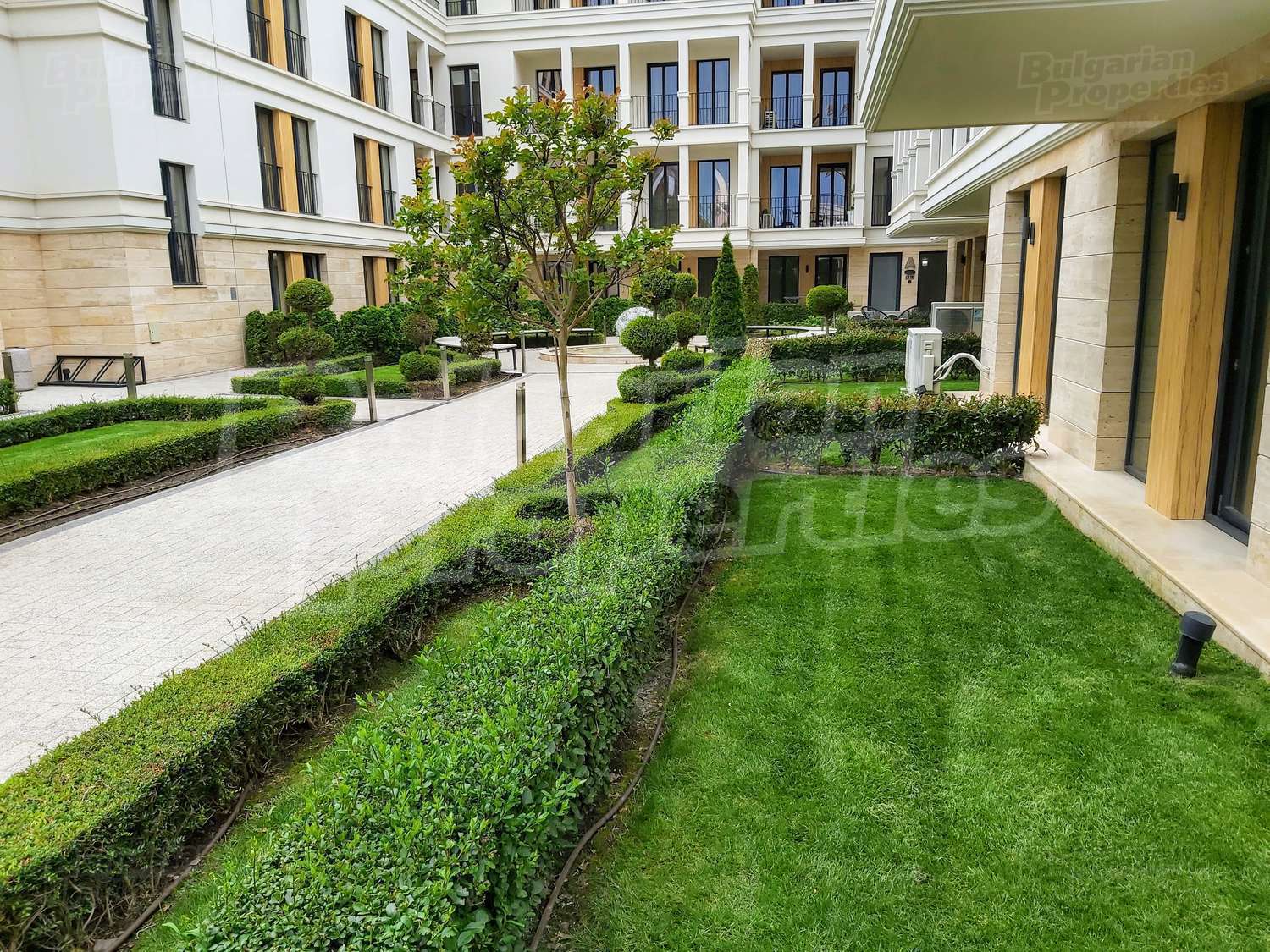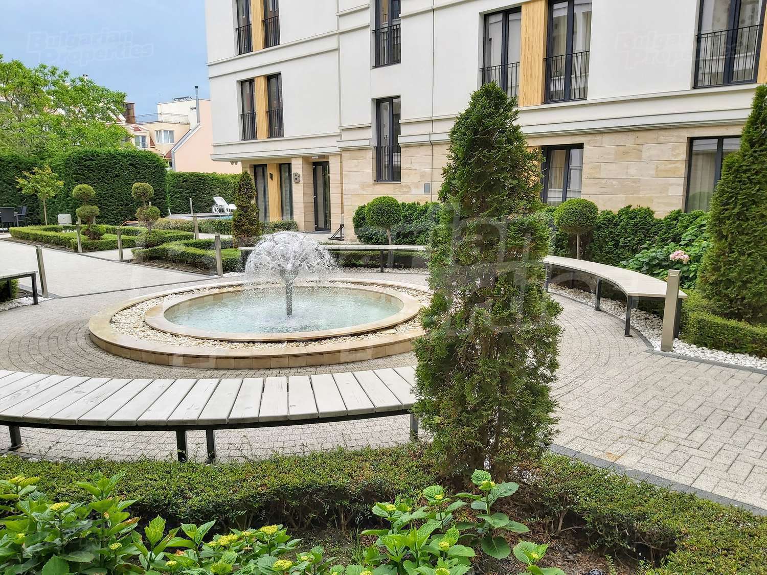 Богатото озеленяване на сградата и двора, включва овощни и вечнозелени дървета, ниски храсти и жив плет, създавайки уникално усещане за единство с природата. Автоматичната система за напояване се снабдява с вода директно от кладенеца в двора на комплекса, което гарантира перфектното състояние на растителността, дори и през най-горещите летни месеци. От същото място ще се водоснабдяват фонтана и открития плувен басейн. Около басейна всеки собственик ще може да се възползва от шезлонг. На негово разположение са също барбекюто и детската площадка, а на покривната тераса на сградата можете да се насладите на гледката от панорамното кафене или да отморите с игра скай - мини голф. Уникалното фасадно осветление ще подчертава силуета на комплекса през нощта.