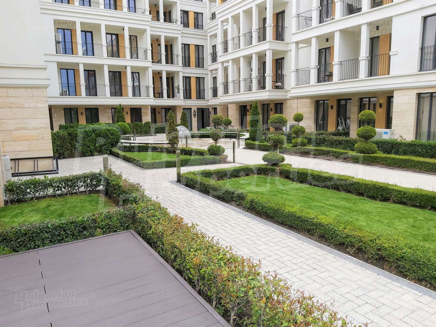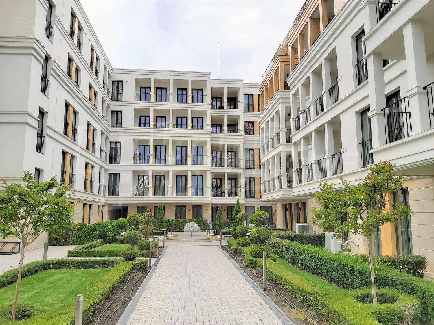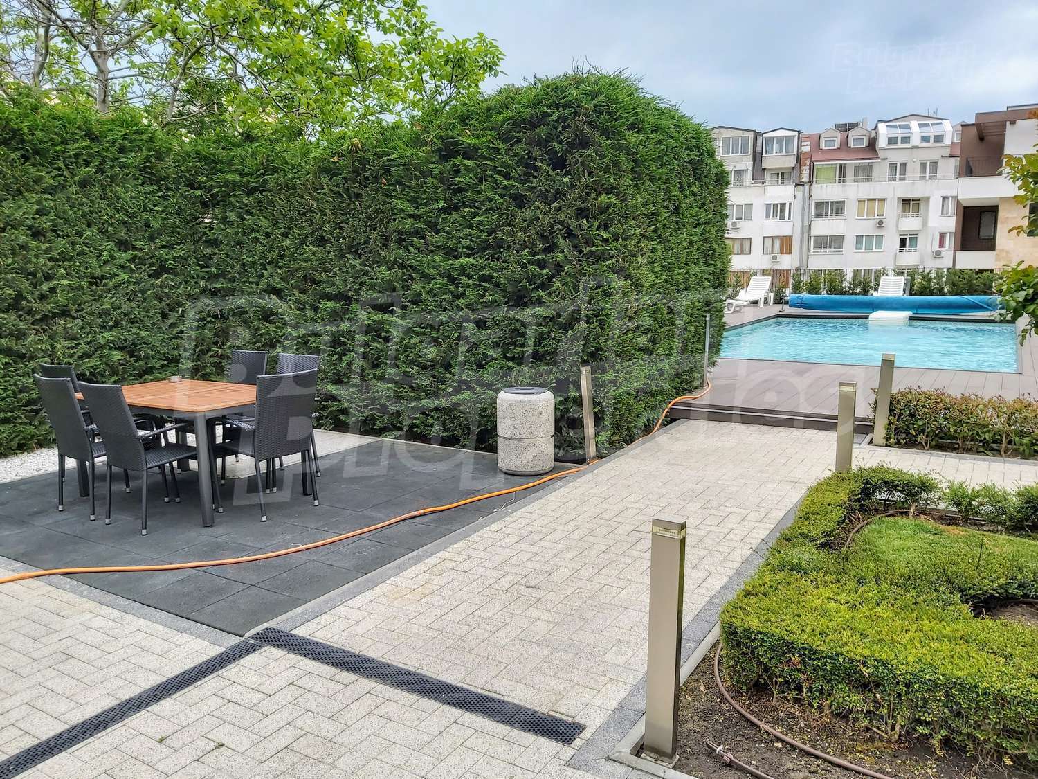 Богатото озеленяване на сградата и двора, включва овощни и вечнозелени дървета, ниски храсти и жив плет, създавайки уникално усещане за единство с природата. Автоматичната система за напояване се снабдява с вода директно от кладенеца в двора на комплекса, което гарантира перфектното състояние на растителността, дори и през най-горещите летни месеци. От същото място ще се водоснабдяват фонтана и открития плувен басейн. Около басейна всеки собственик ще може да се възползва от шезлонг. На негово разположение са също барбекюто и детската площадка, а на покривната тераса на сградата можете да се насладите на гледката от панорамното кафене или да отморите с игра скай - мини голф. Уникалното фасадно осветление ще подчертава силуета на комплекса през нощта.