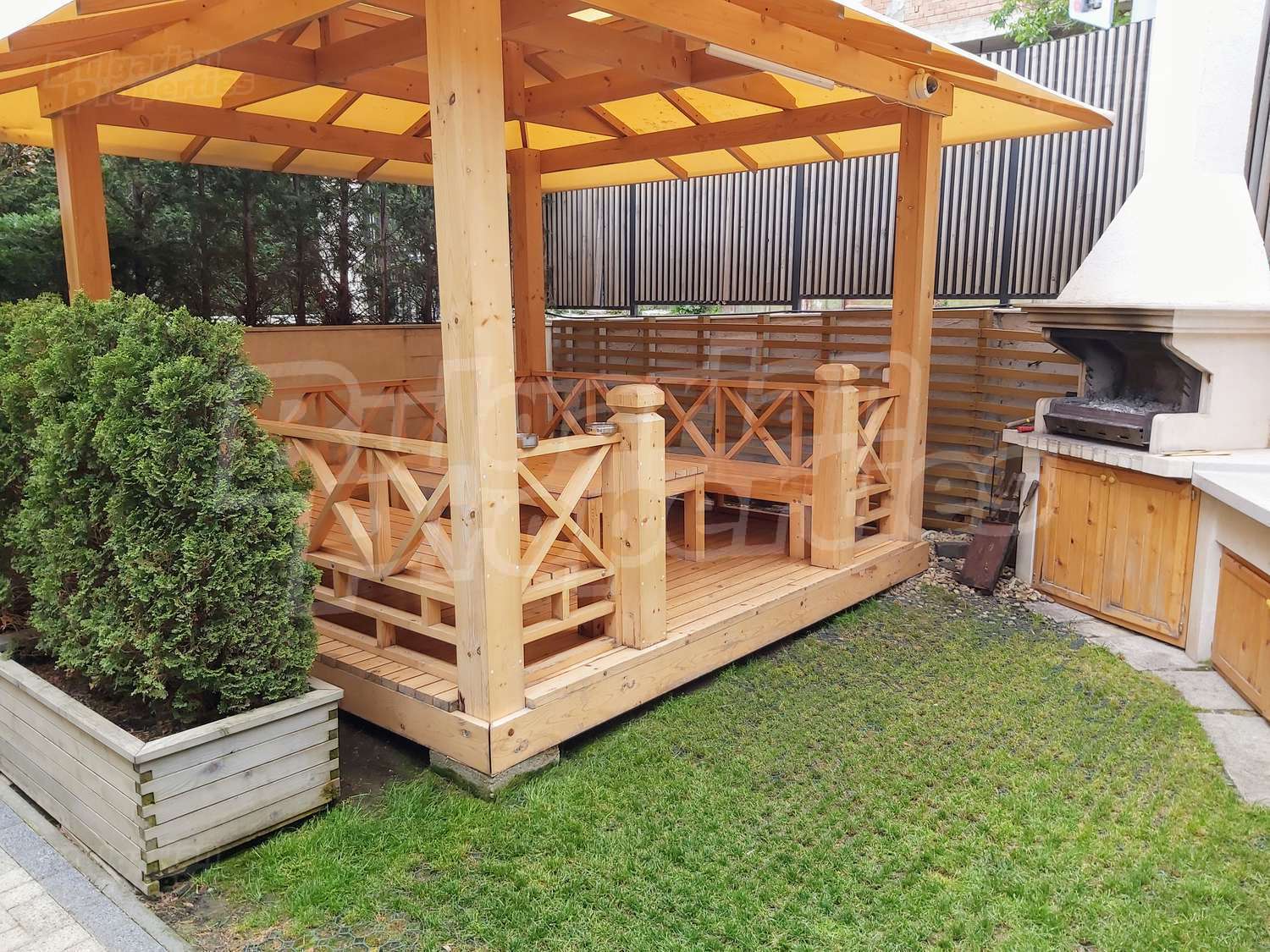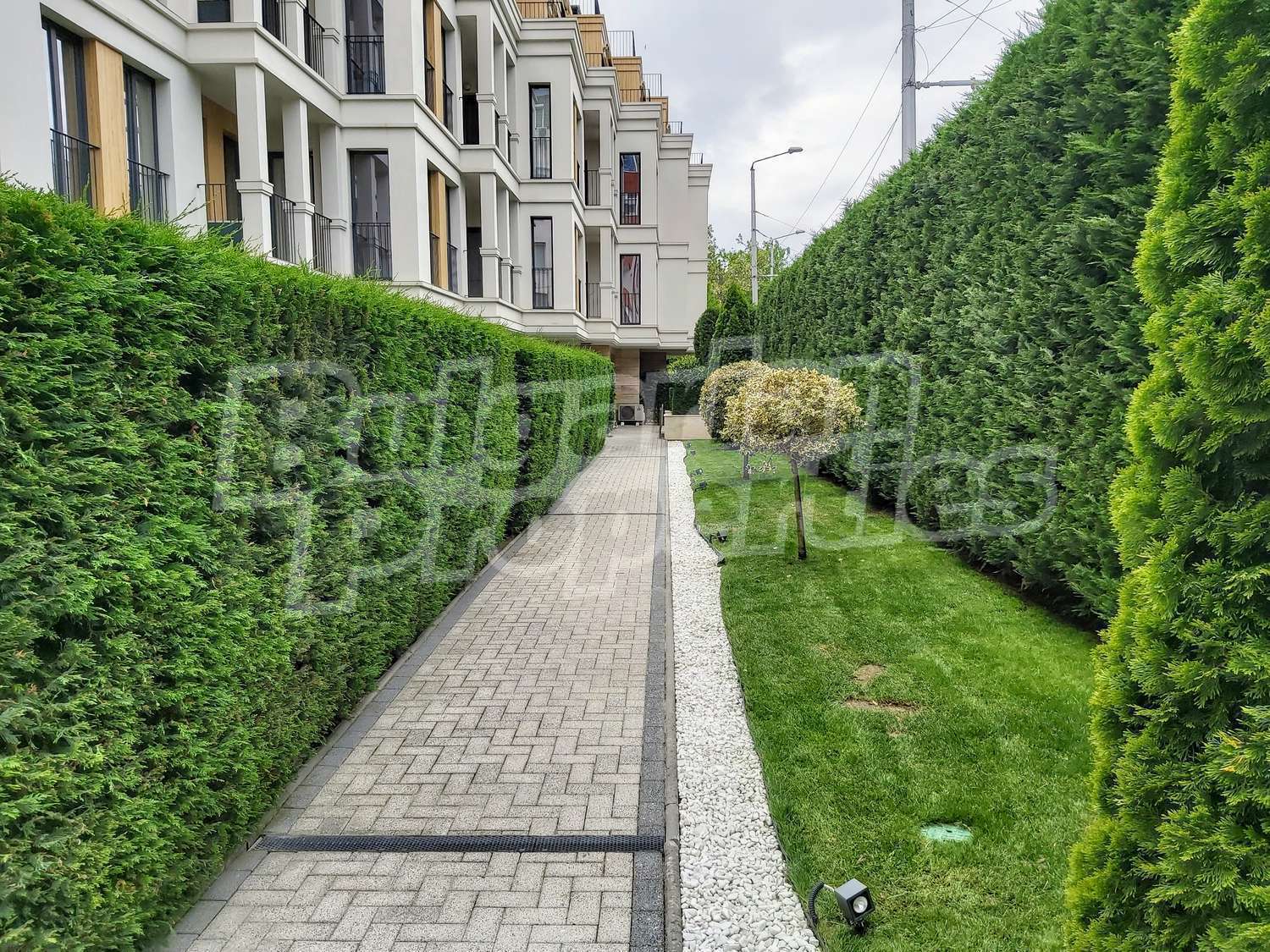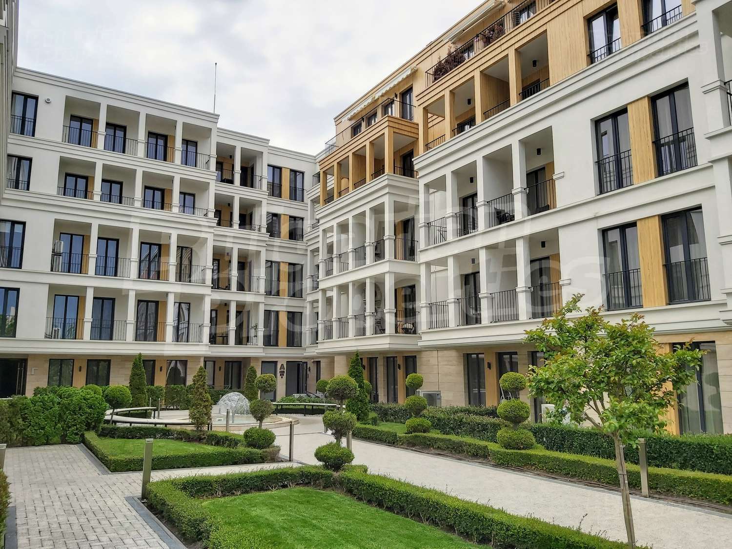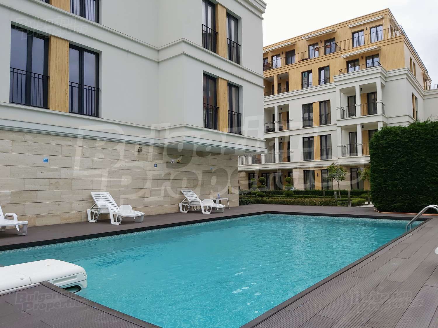 Богатото озеленяване на сградата и двора, включва овощни и вечнозелени дървета, ниски храсти и жив плет, създавайки уникално усещане за единство с природата. Автоматичната система за напояване се снабдява с вода директно от кладенеца в двора на комплекса, което гарантира перфектното състояние на растителността, дори и през най-горещите летни месеци. От същото място ще се водоснабдяват фонтана и открития плувен басейн. Около басейна всеки собственик ще може да се възползва от шезлонг. На негово разположение са също барбекюто и детската площадка, а на покривната тераса на сградата можете да се насладите на гледката от панорамното кафене или да отморите с игра скай - мини голф. Уникалното фасадно осветление ще подчертава силуета на комплекса през нощта.