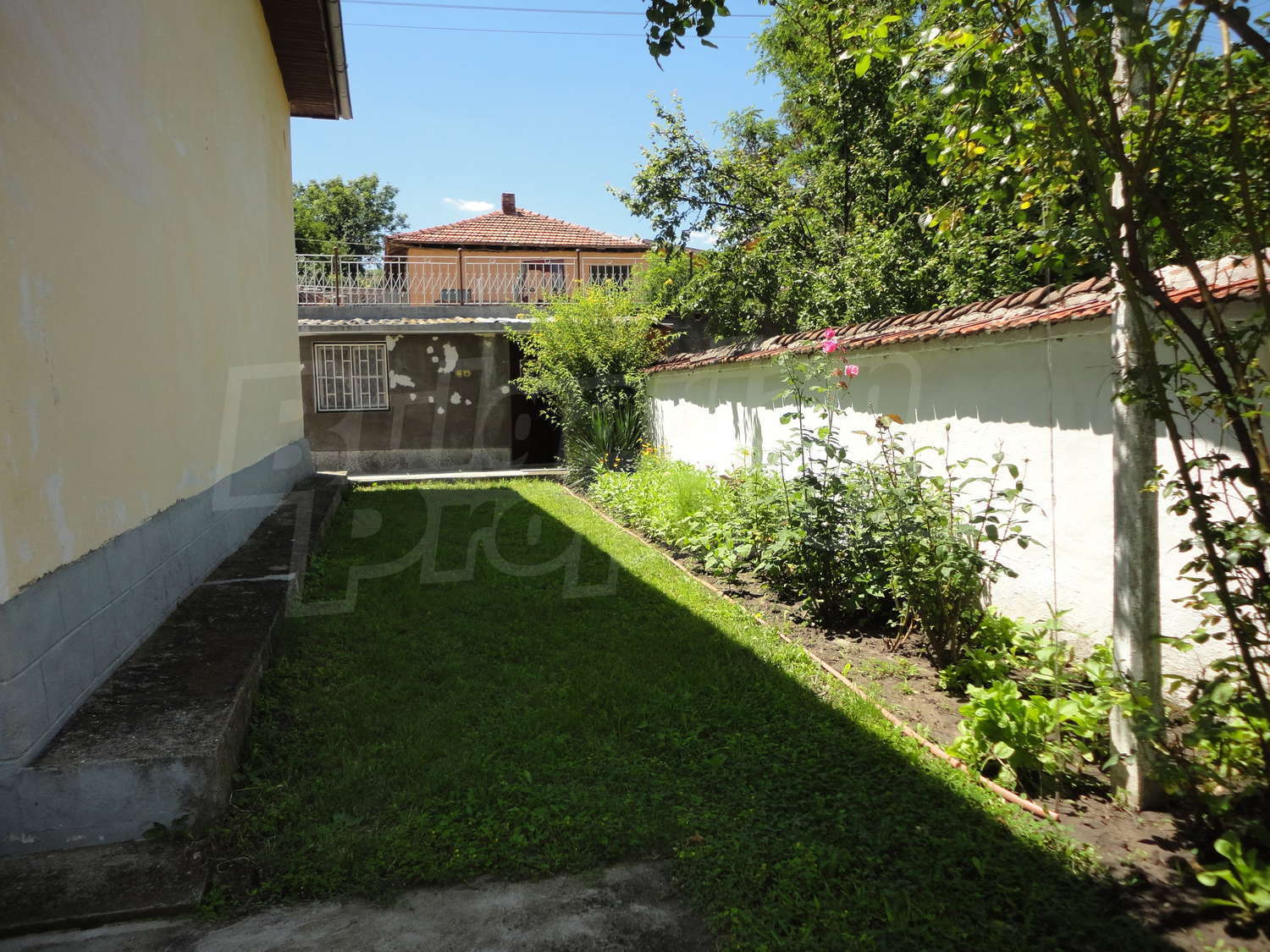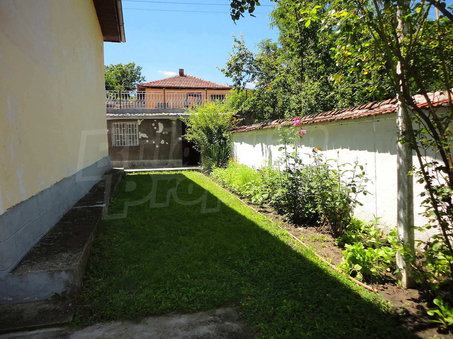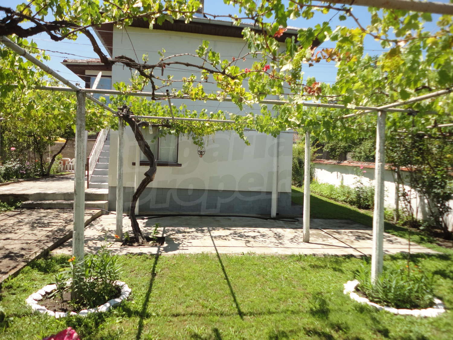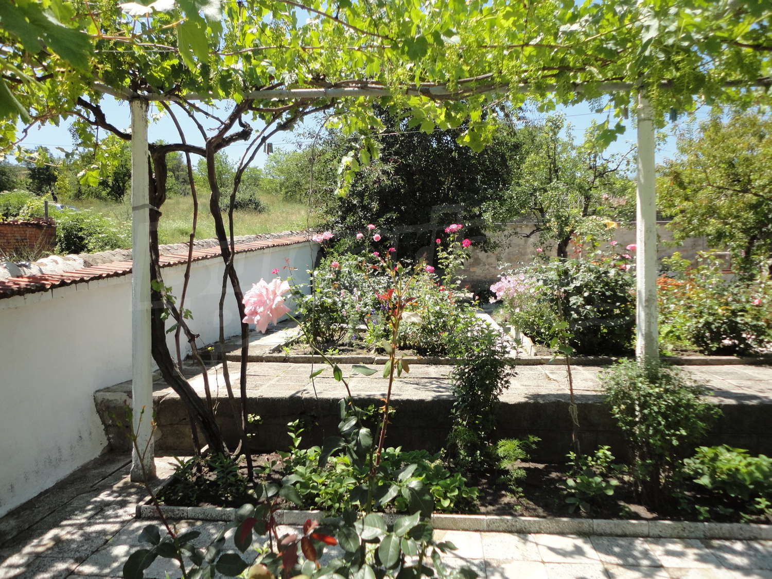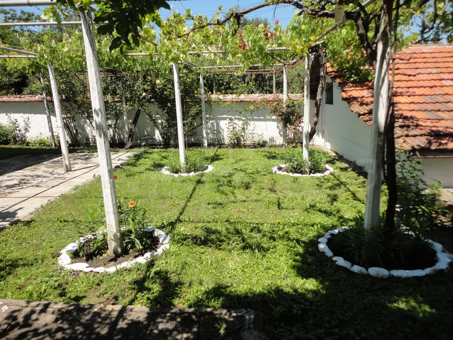 Градината е засадена с овошки, много цветя и асма. В нея има и открит плувен басейн.