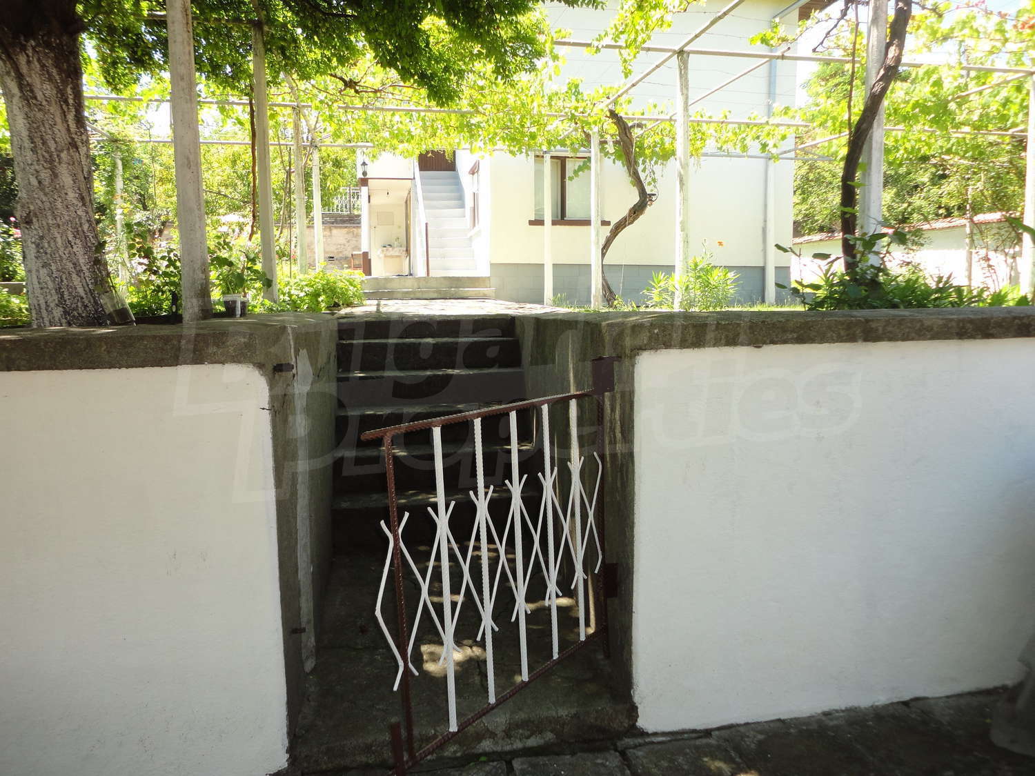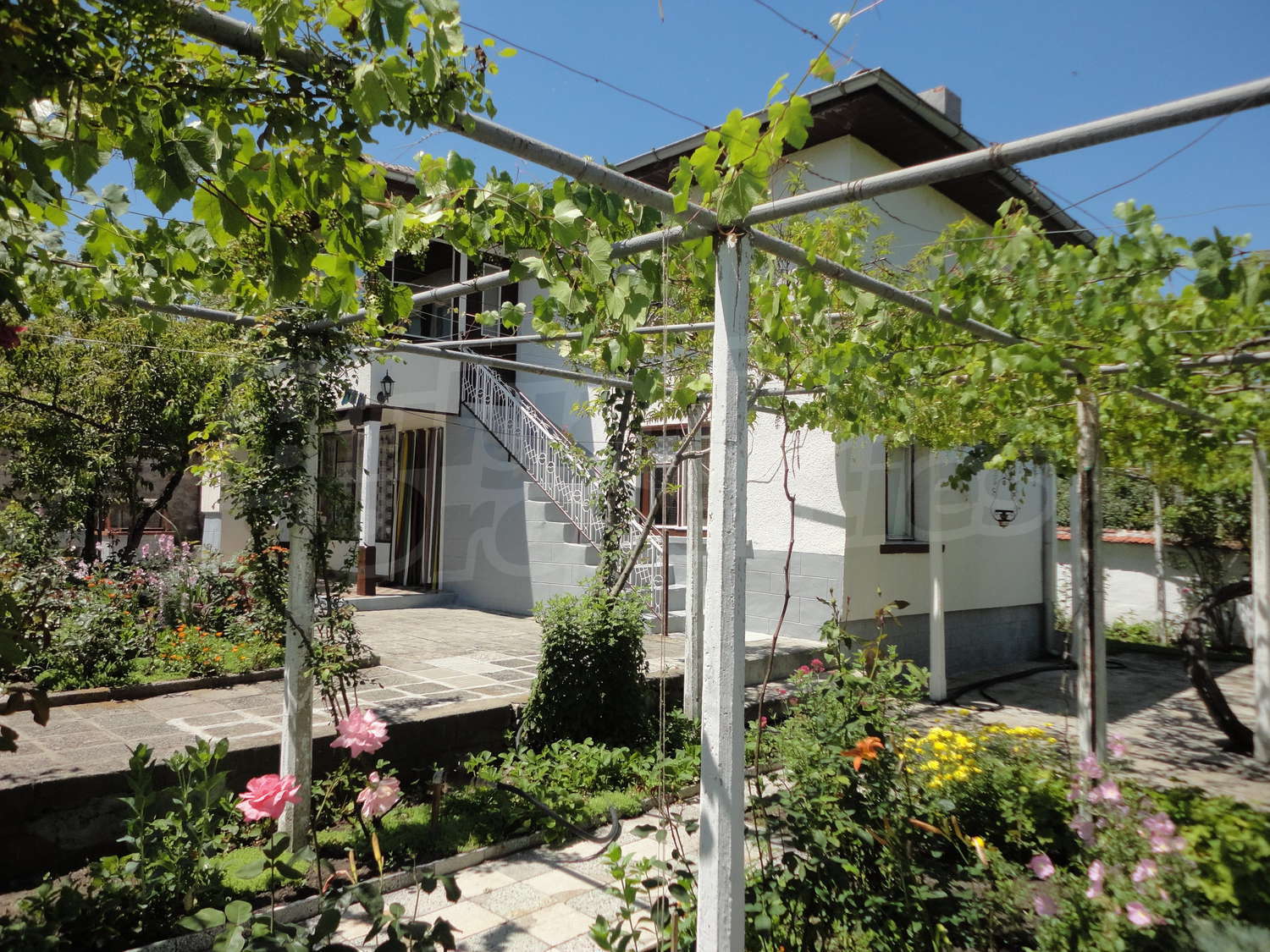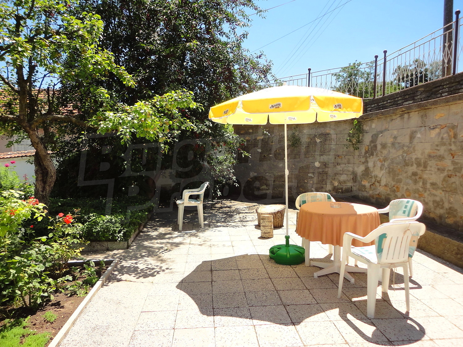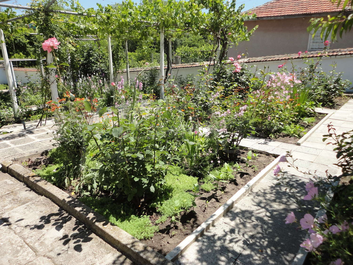Градината е засадена с овошки, много цветя и асма. В нея има и открит плувен басейн.