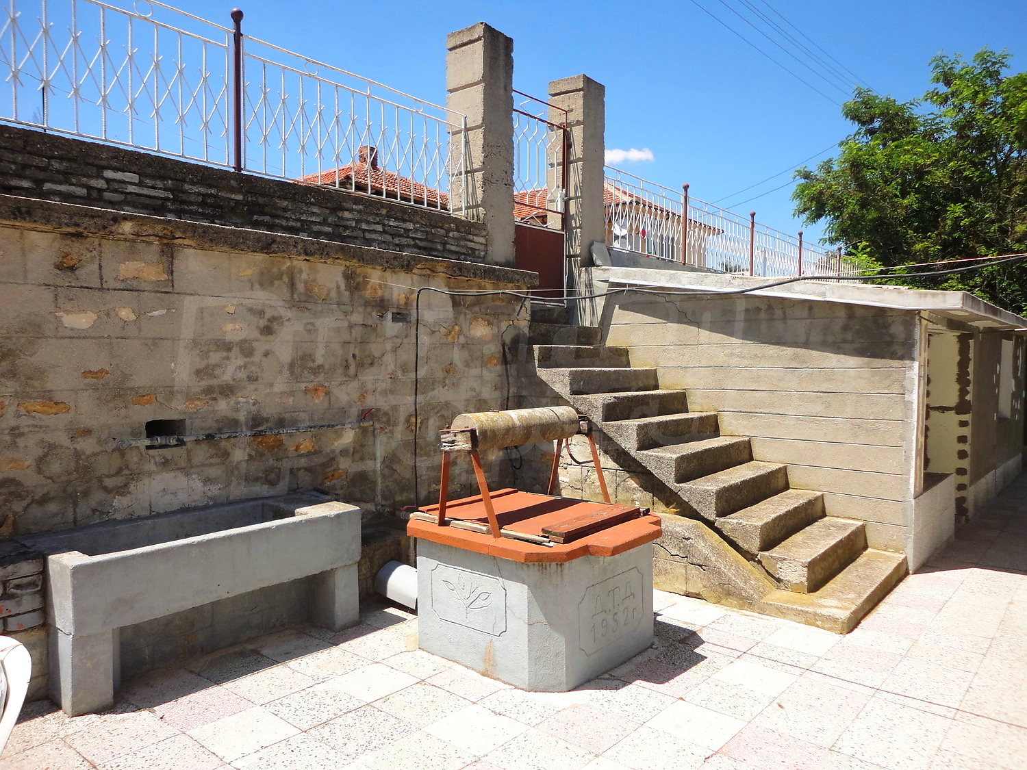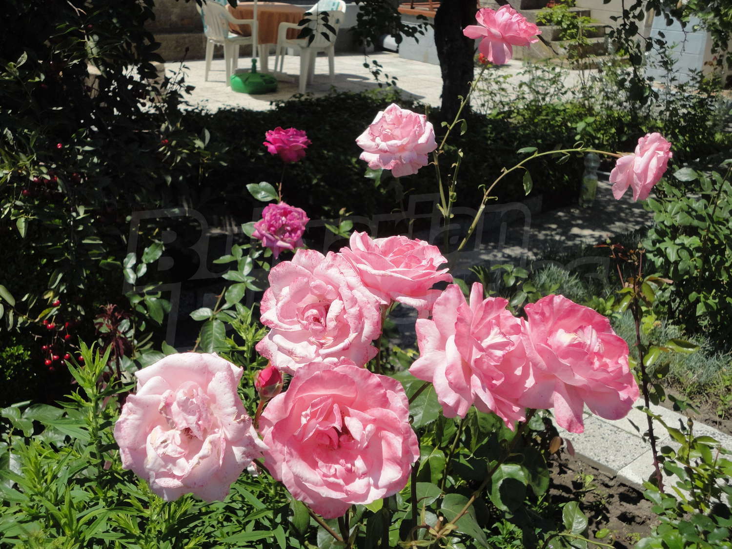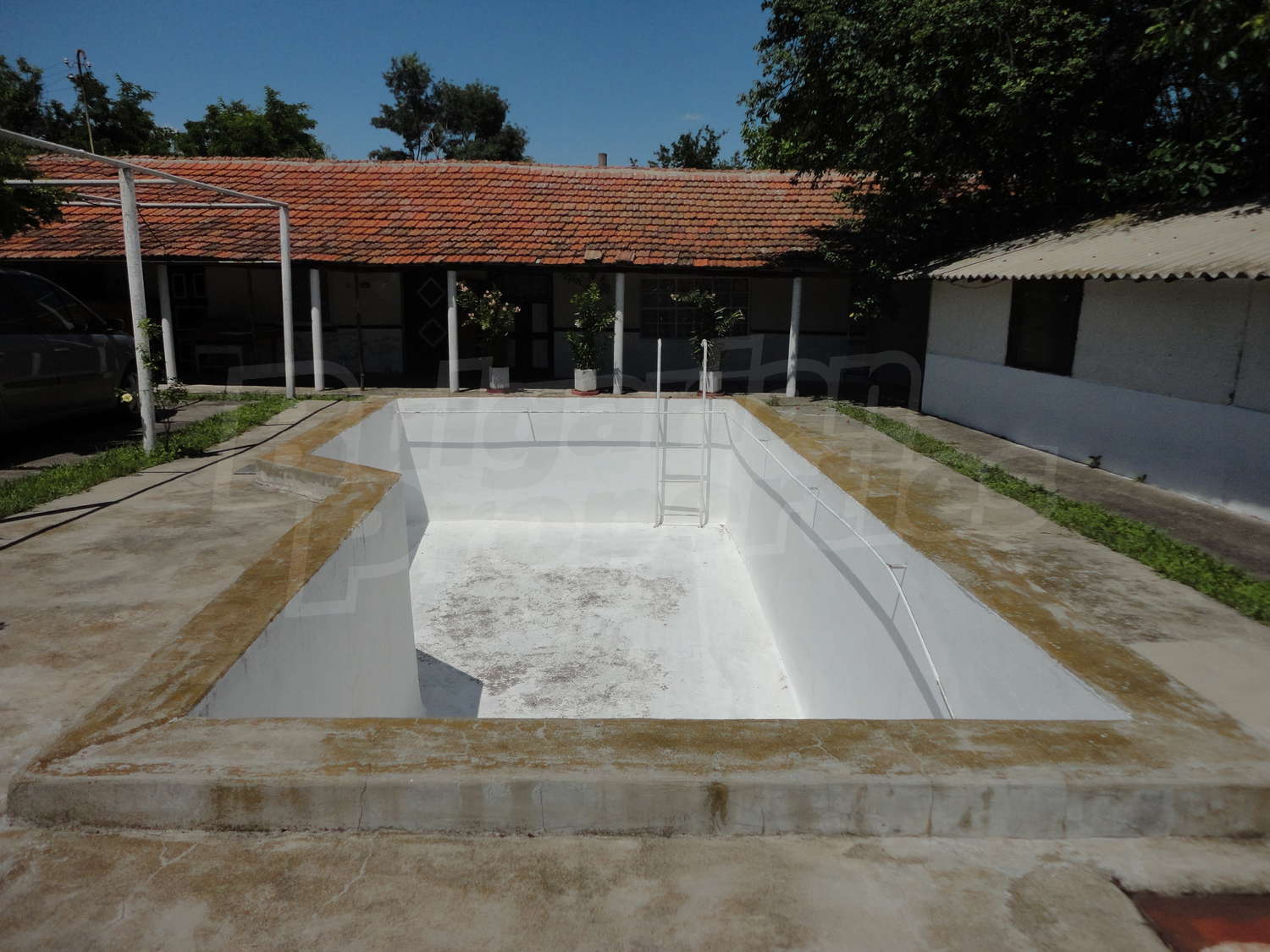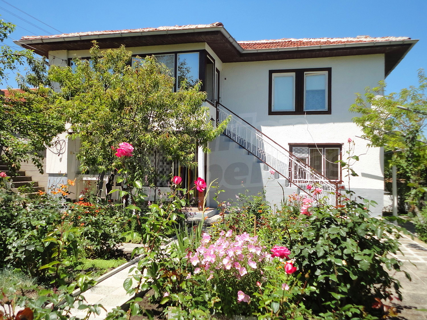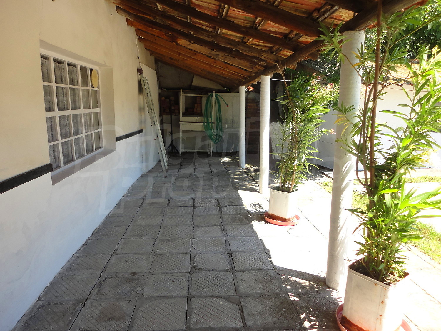 Градината е засадена с овошки, много цветя и асма. В нея има и открит плувен басейн.