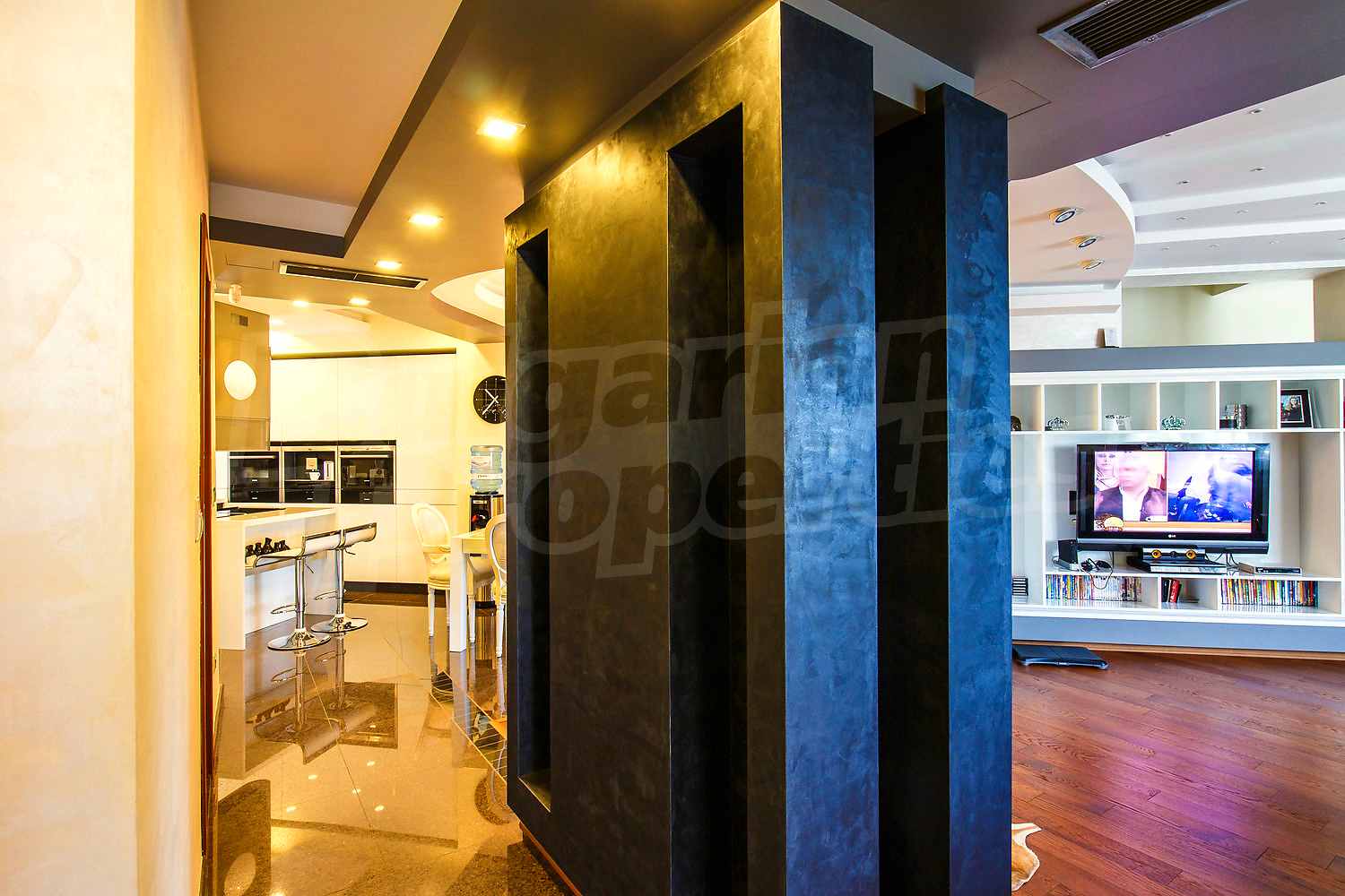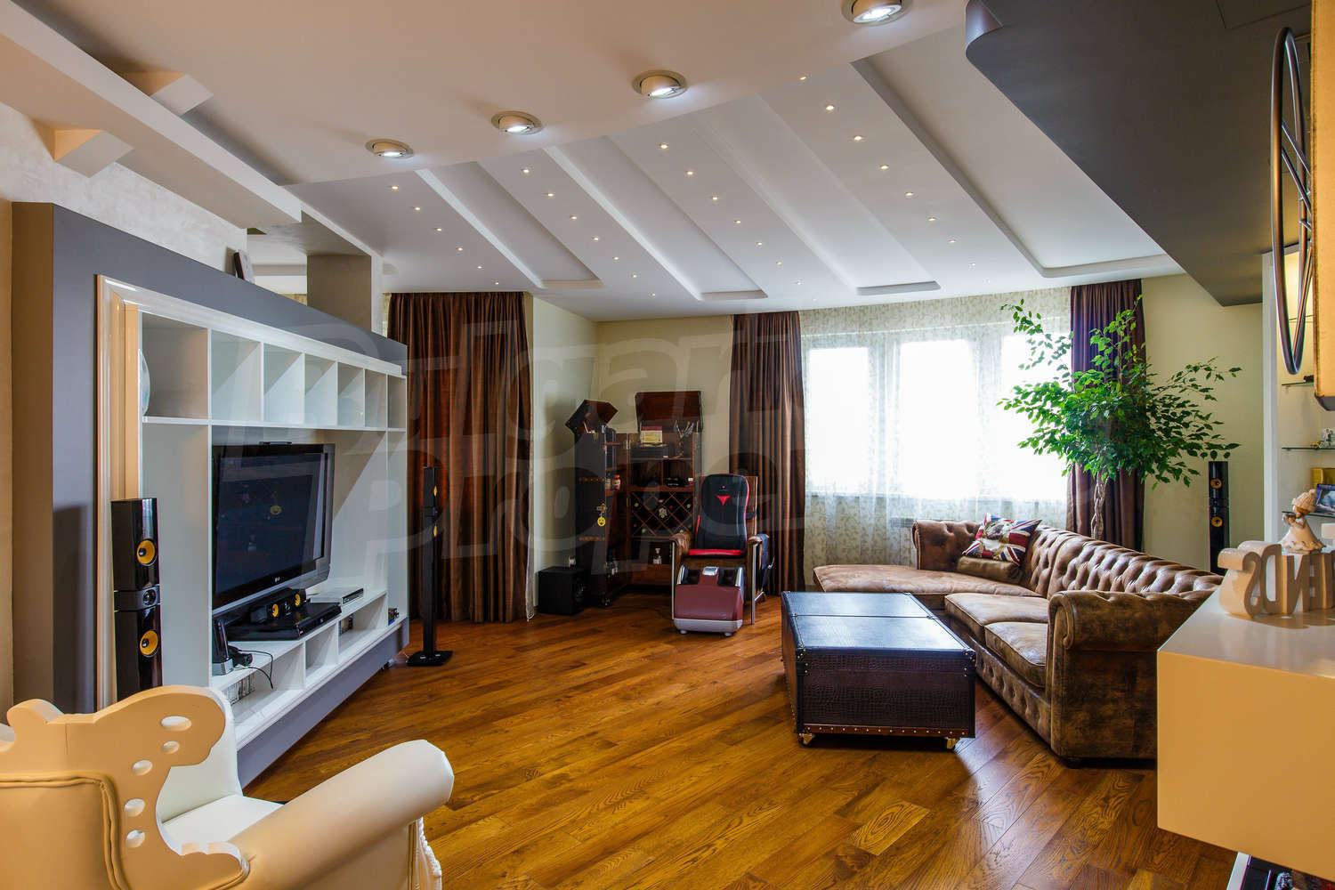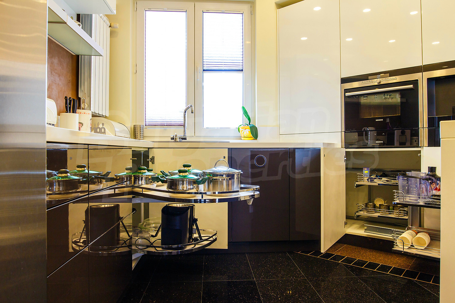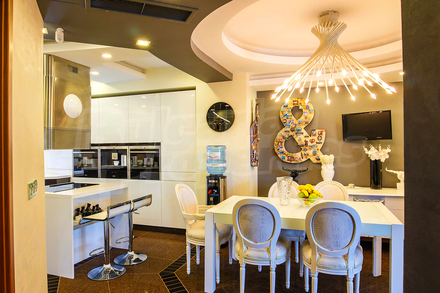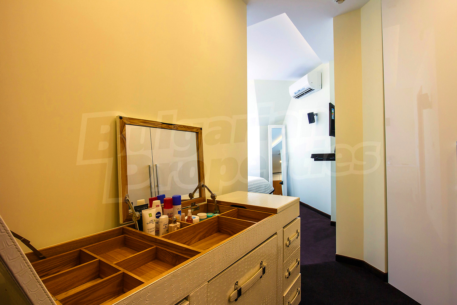 Имотът се продава напълно обзаведен. В хола и трапезарията обзавеждането е от бутиковата марка за луксозно интериорно обзавеждане KARE. В дневната стая има и декоративна камина. Кухненските шкафове са изработени от MDF фронтове с лаково покритие, плотовете от технически камък. Има подгревателни чекмеджета. Кухненските уреди са вградени - парова фурна, кафе машина, микровълнова фурна с вградени скара и котлони – марка SIEMENS. Абсорбатора е Faber. В апартамента има 5 телевизора LG с три броя домашни кина LG. Има пералня и сушилня, намиращи се в мокрото помещение на второто нива, които са на марка MIELE. Имотът разполага с 3 броя бани с два броя джакузи, умивалници и батерии ROKA, смесители Hansa.