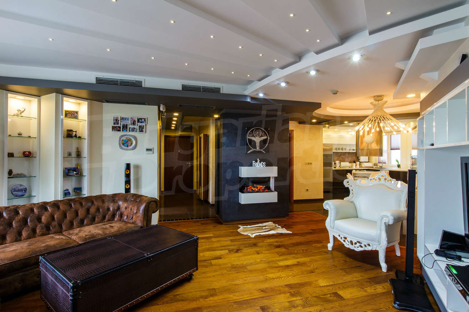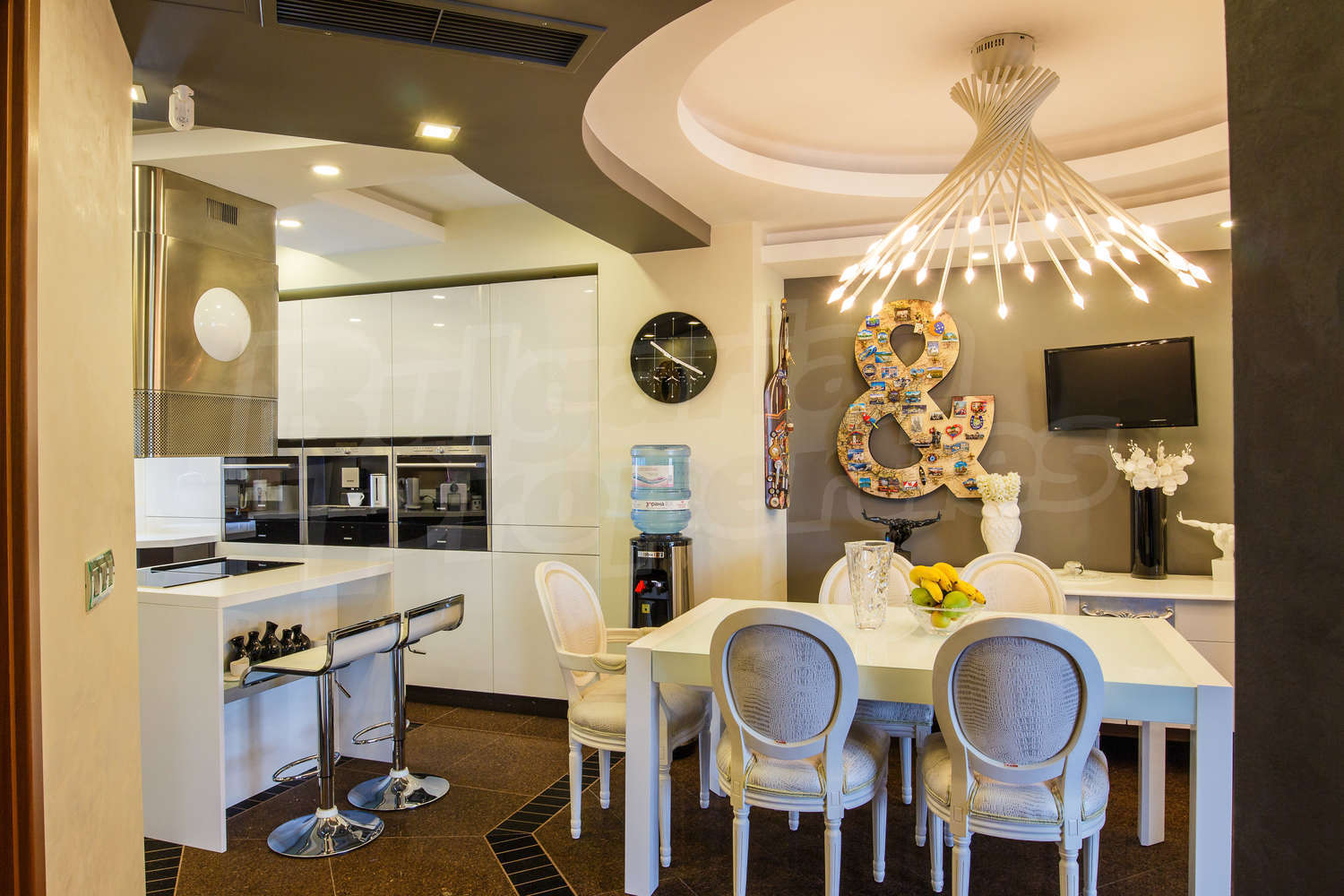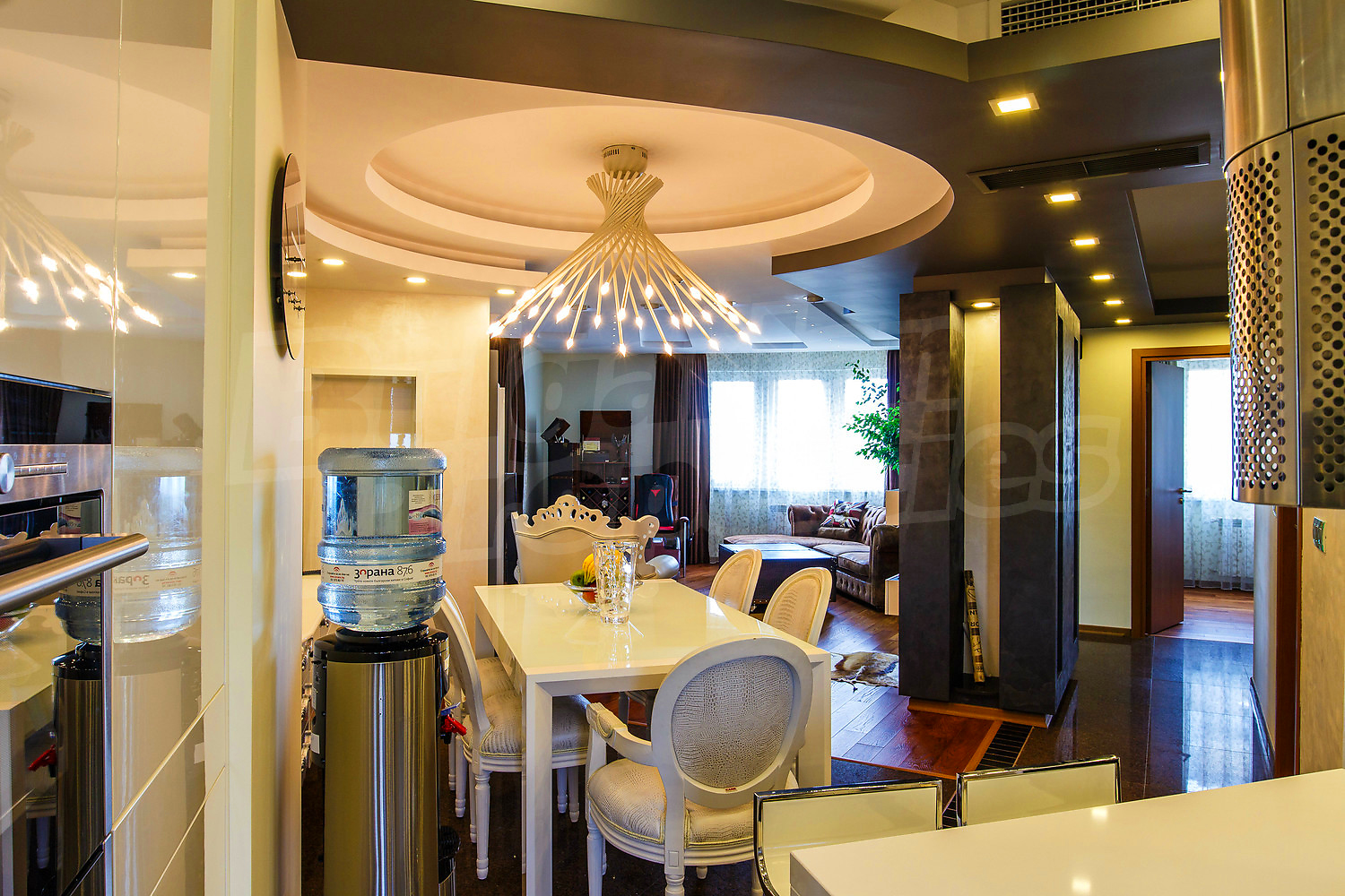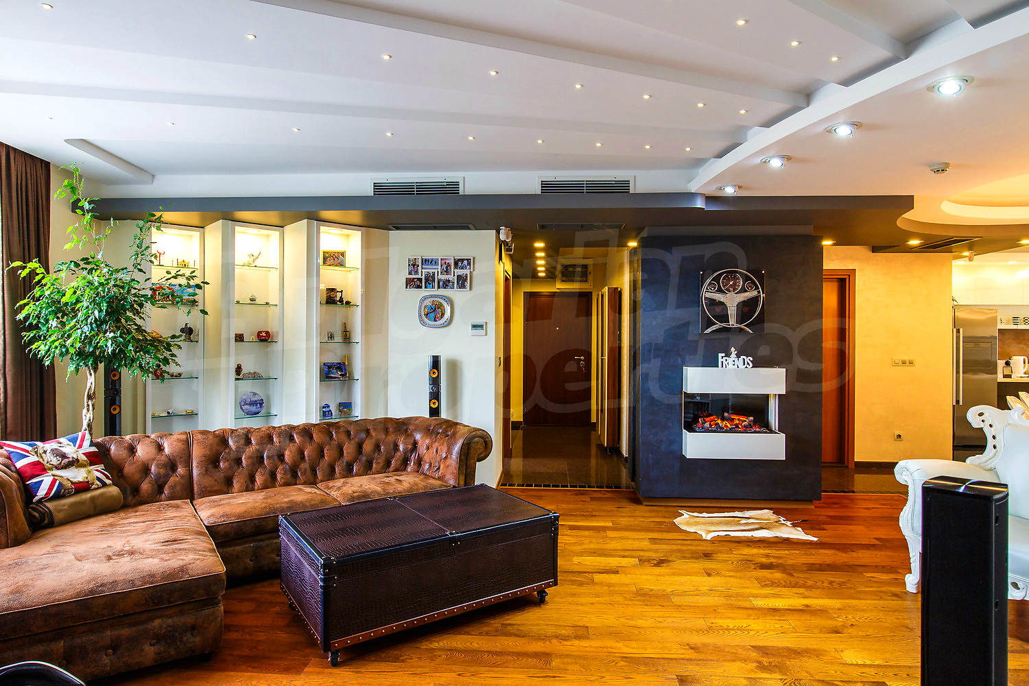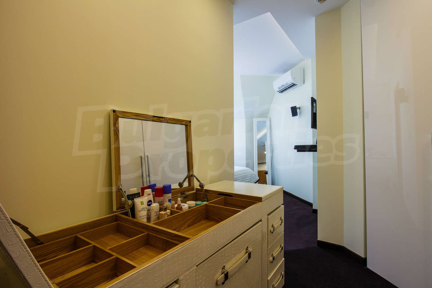 Имотът се продава напълно обзаведен. В хола и трапезарията обзавеждането е от бутиковата марка за луксозно интериорно обзавеждане KARE. В дневната стая има и декоративна камина. Кухненските шкафове са изработени от MDF фронтове с лаково покритие, плотовете от технически камък. Има подгревателни чекмеджета. Кухненските уреди са вградени - парова фурна, кафе машина, микровълнова фурна с вградени скара и котлони – марка SIEMENS. Абсорбатора е Faber. В апартамента има 5 телевизора LG с три броя домашни кина LG. Има пералня и сушилня, намиращи се в мокрото помещение на второто нива, които са на марка MIELE. Имотът разполага с 3 броя бани с два броя джакузи, умивалници и батерии ROKA, смесители Hansa.