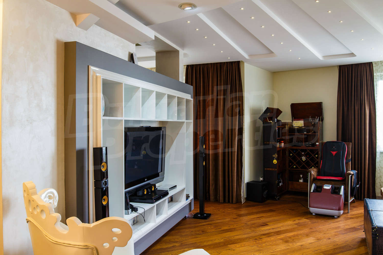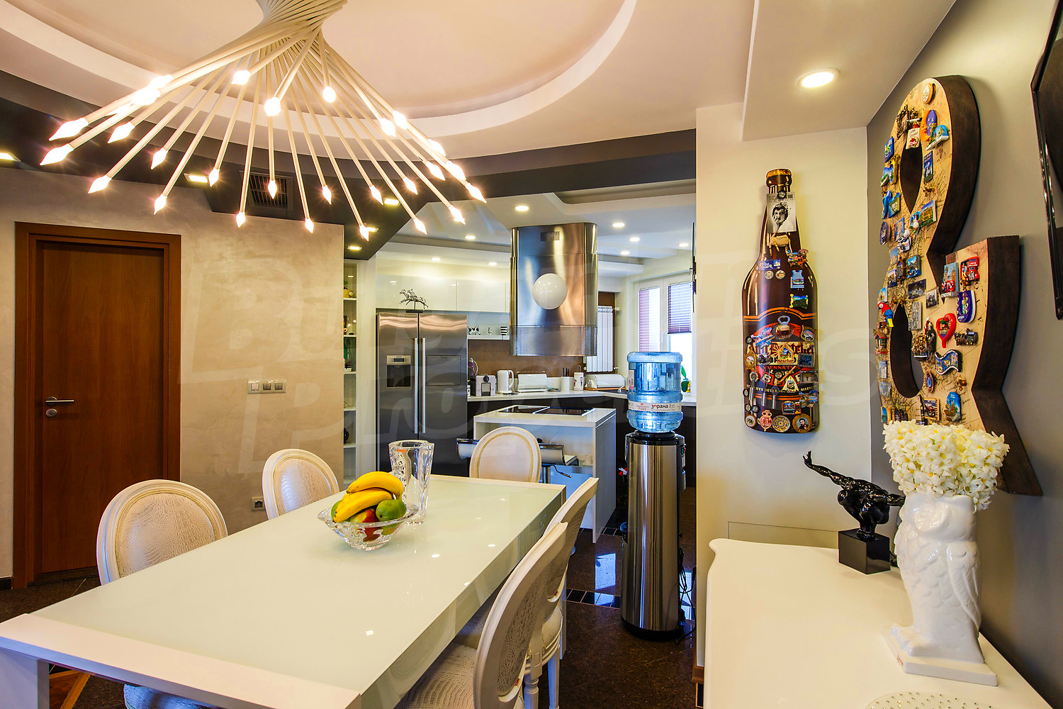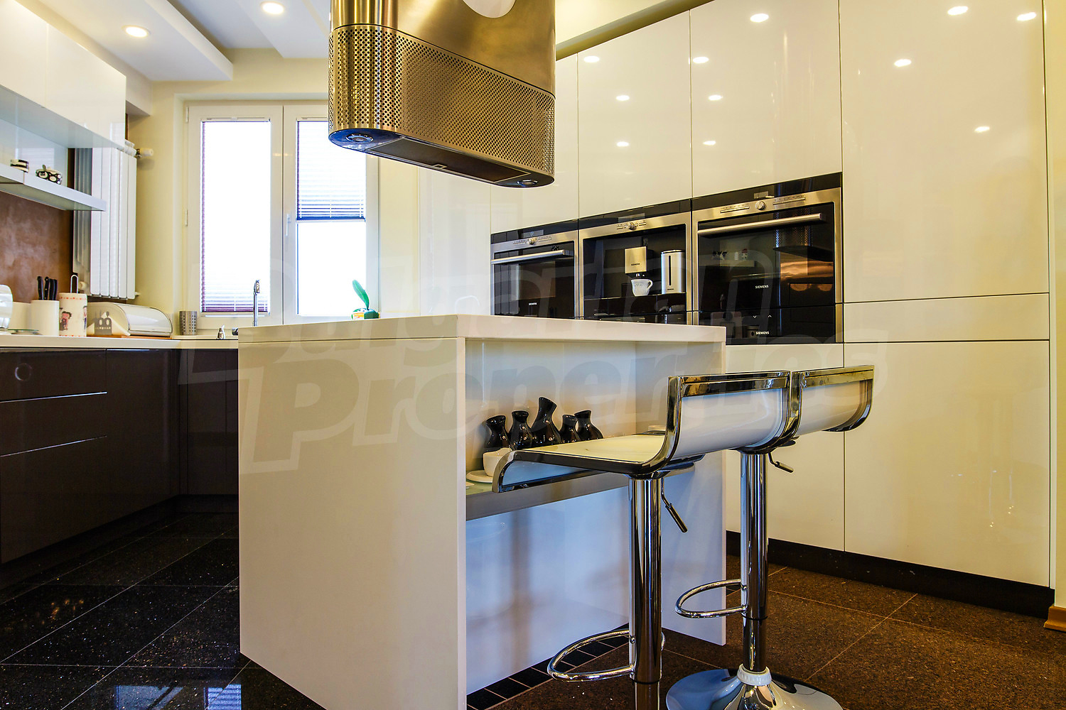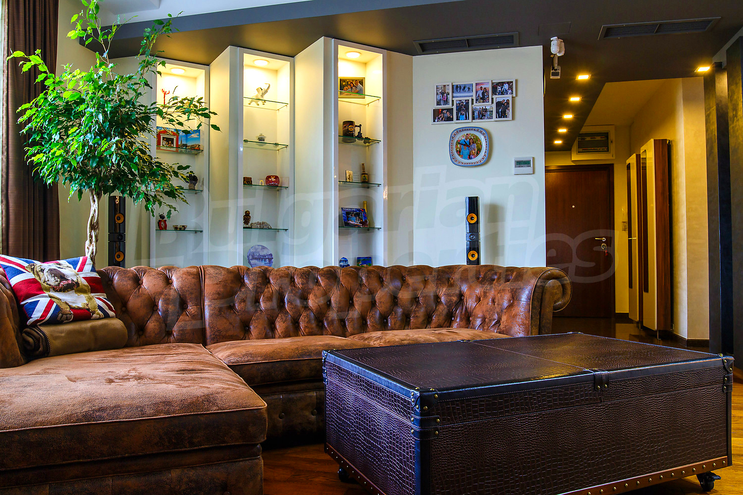 Имотът се продава напълно обзаведен. В хола и трапезарията обзавеждането е от бутиковата марка за луксозно интериорно обзавеждане KARE. В дневната стая има и декоративна камина. Кухненските шкафове са изработени от MDF фронтове с лаково покритие, плотовете от технически камък. Има подгревателни чекмеджета. Кухненските уреди са вградени - парова фурна, кафе машина, микровълнова фурна с вградени скара и котлони – марка SIEMENS. Абсорбатора е Faber. В апартамента има 5 телевизора LG с три броя домашни кина LG. Има пералня и сушилня, намиращи се в мокрото помещение на второто нива, които са на марка MIELE. Имотът разполага с 3 броя бани с два броя джакузи, умивалници и батерии ROKA, смесители Hansa.