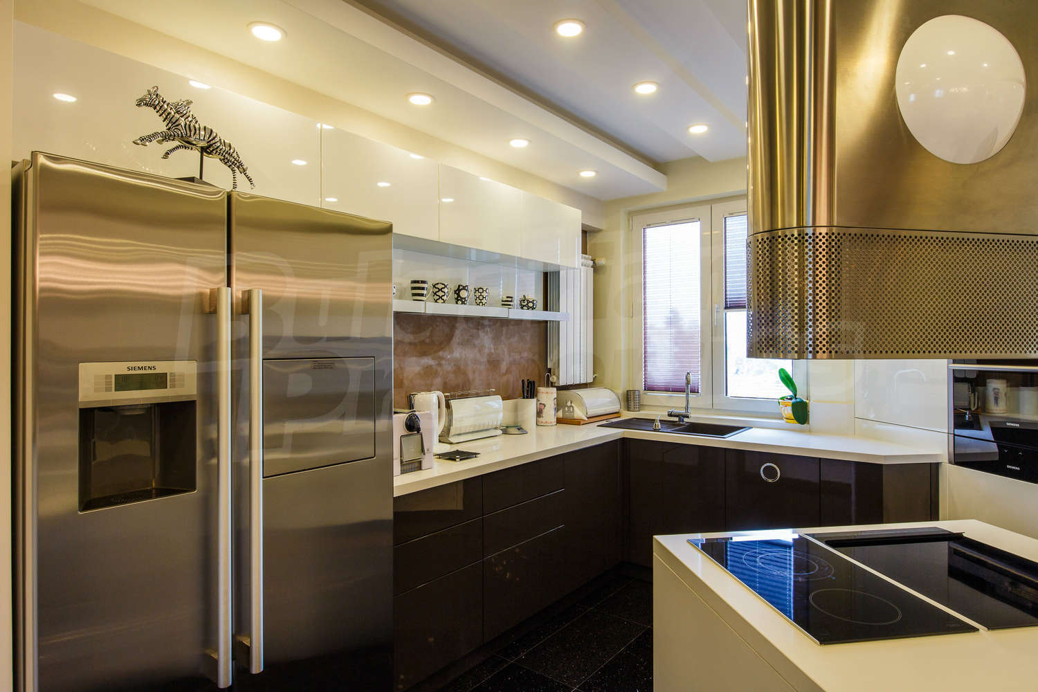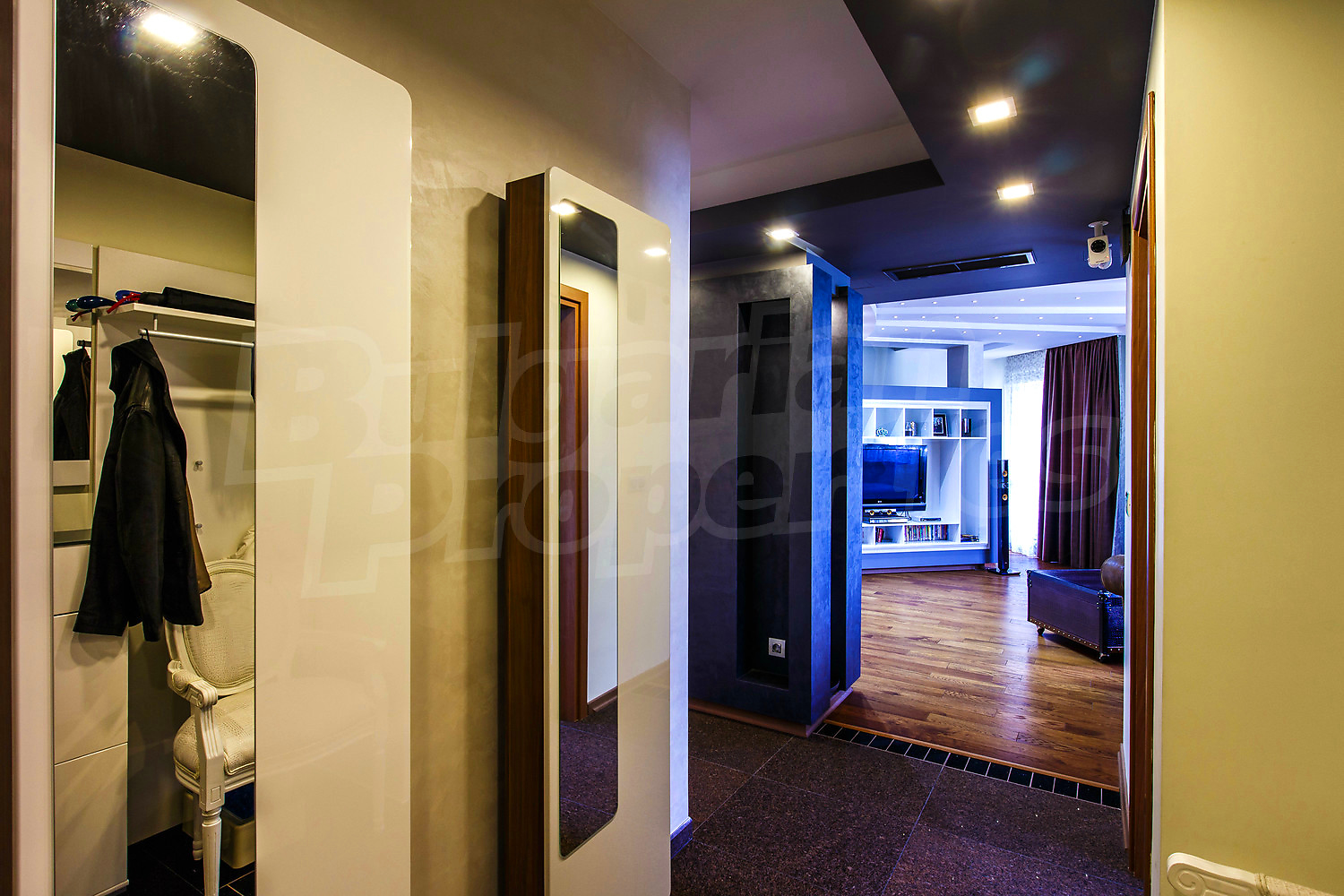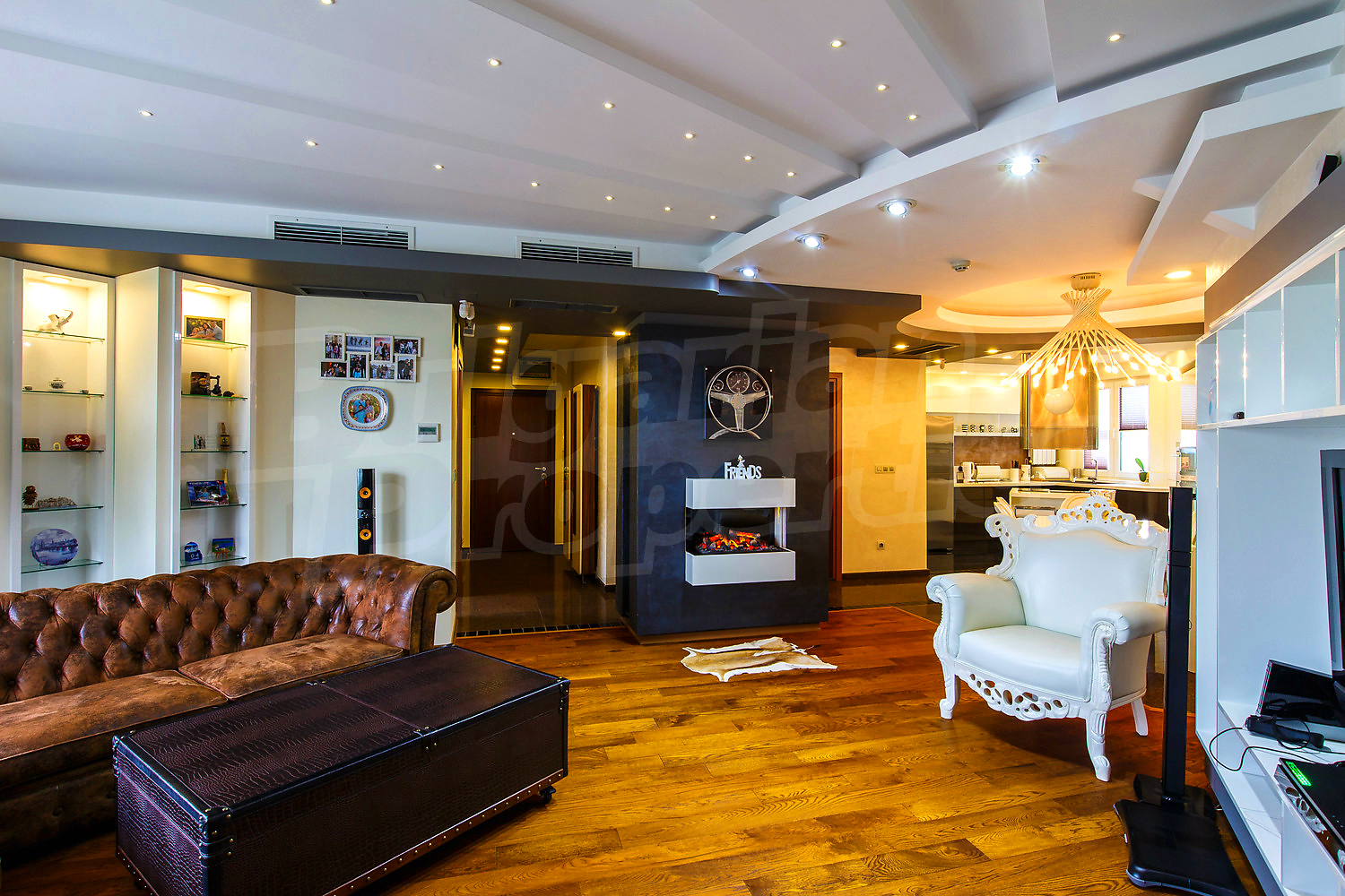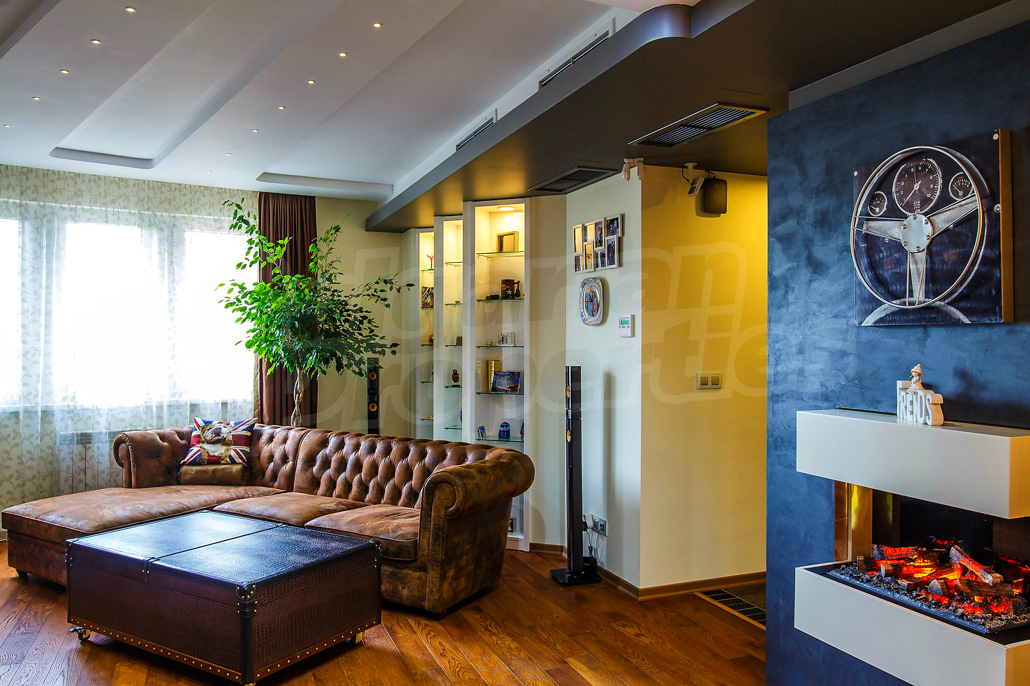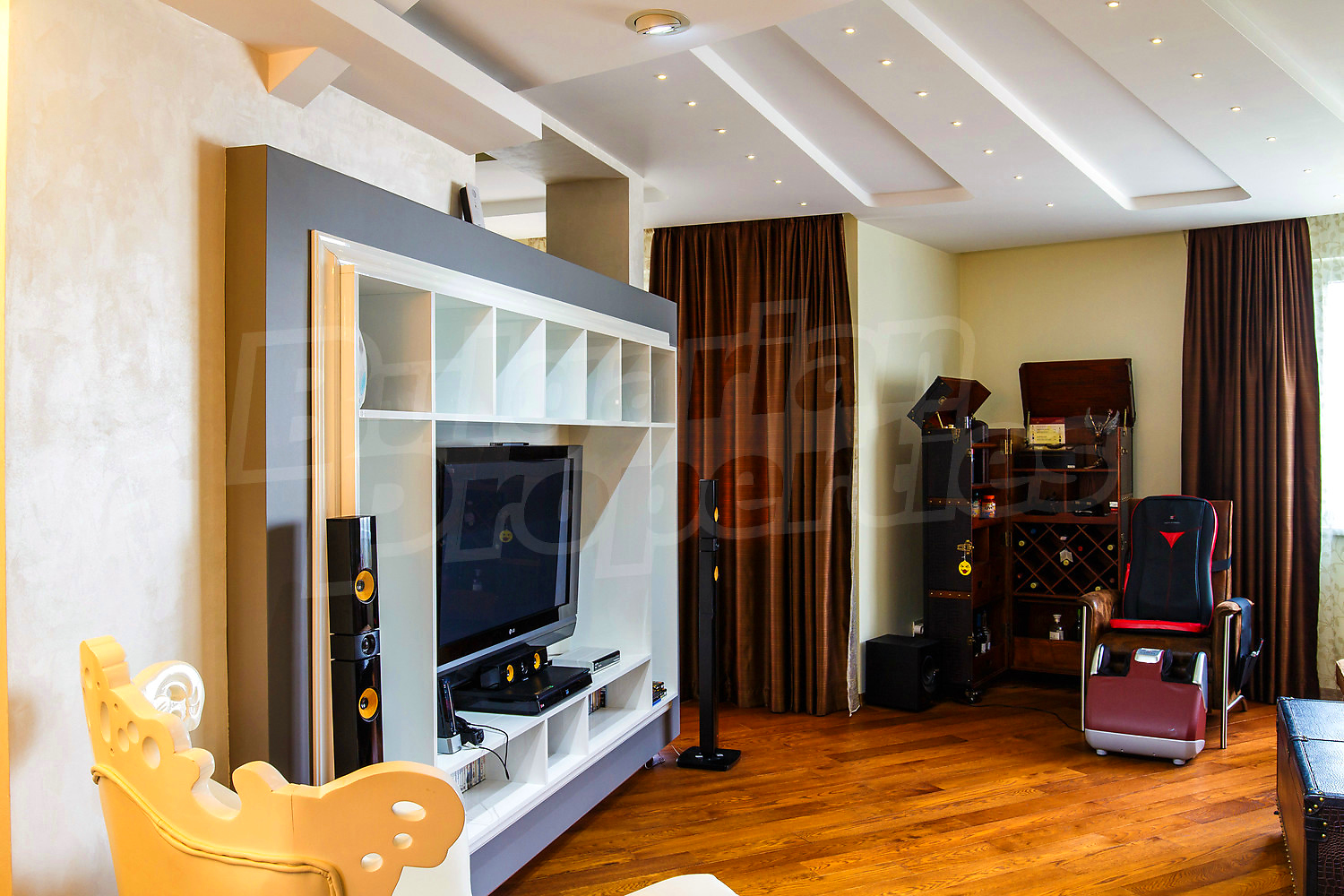 Имотът се продава напълно обзаведен. В хола и трапезарията обзавеждането е от бутиковата марка за луксозно интериорно обзавеждане KARE. В дневната стая има и декоративна камина. Кухненските шкафове са изработени от MDF фронтове с лаково покритие, плотовете от технически камък. Има подгревателни чекмеджета. Кухненските уреди са вградени - парова фурна, кафе машина, микровълнова фурна с вградени скара и котлони – марка SIEMENS. Абсорбатора е Faber. В апартамента има 5 телевизора LG с три броя домашни кина LG. Има пералня и сушилня, намиращи се в мокрото помещение на второто нива, които са на марка MIELE. Имотът разполага с 3 броя бани с два броя джакузи, умивалници и батерии ROKA, смесители Hansa.