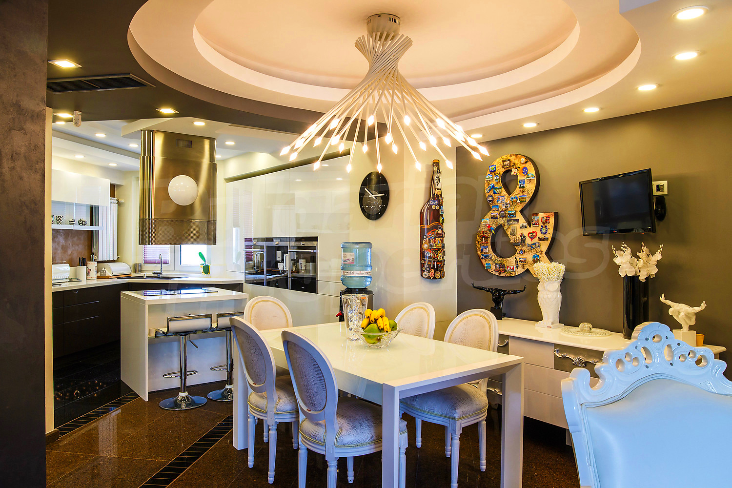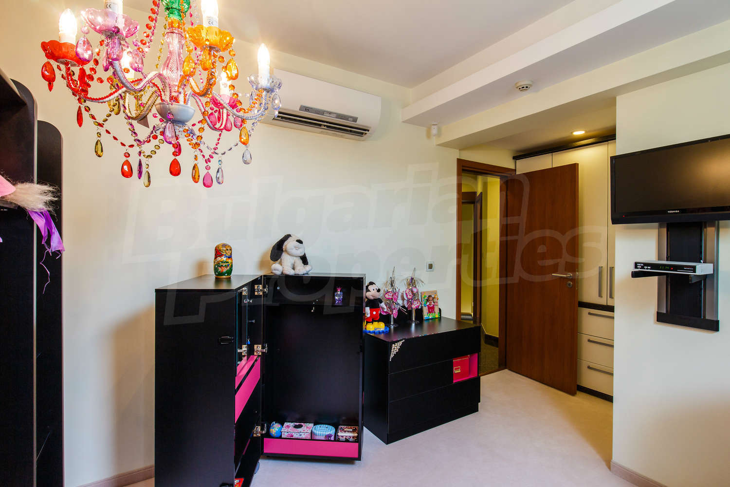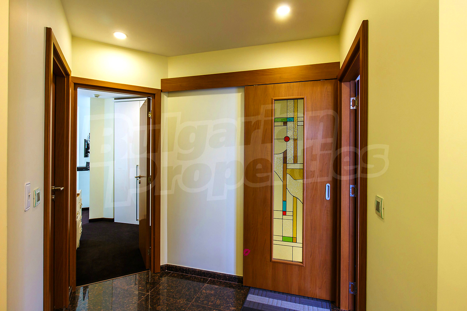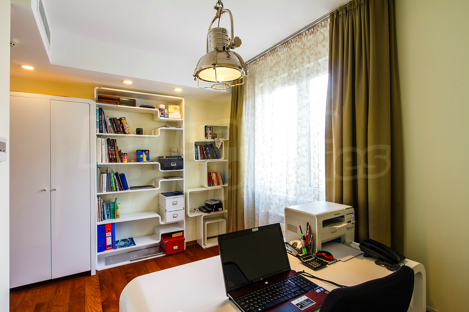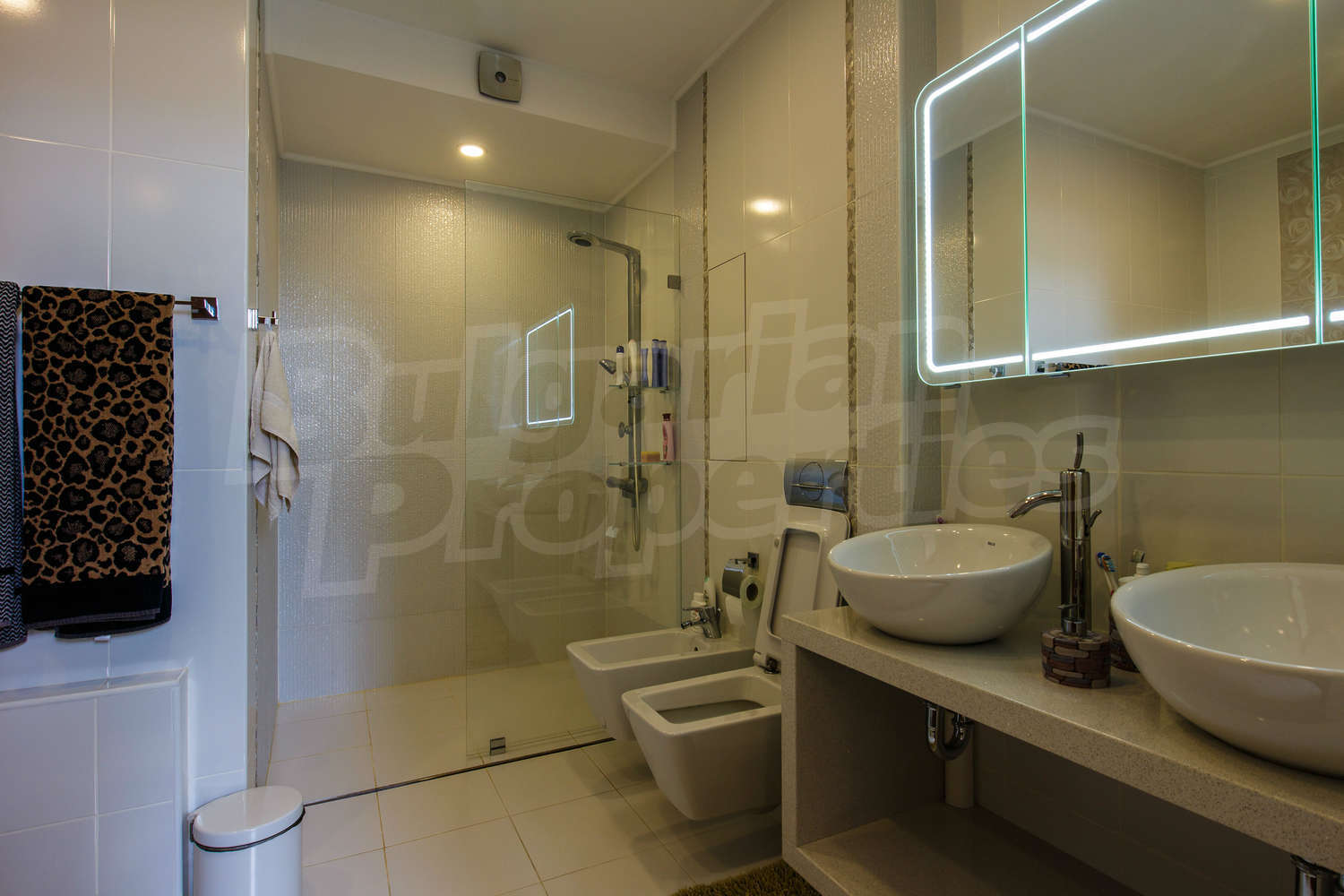 Имотът се продава напълно обзаведен. В хола и трапезарията обзавеждането е от бутиковата марка за луксозно интериорно обзавеждане KARE. В дневната стая има и декоративна камина. Кухненските шкафове са изработени от MDF фронтове с лаково покритие, плотовете от технически камък. Има подгревателни чекмеджета. Кухненските уреди са вградени - парова фурна, кафе машина, микровълнова фурна с вградени скара и котлони – марка SIEMENS. Абсорбатора е Faber. В апартамента има 5 телевизора LG с три броя домашни кина LG. Има пералня и сушилня, намиращи се в мокрото помещение на второто нива, които са на марка MIELE. Имотът разполага с 3 броя бани с два броя джакузи, умивалници и батерии ROKA, смесители Hansa.