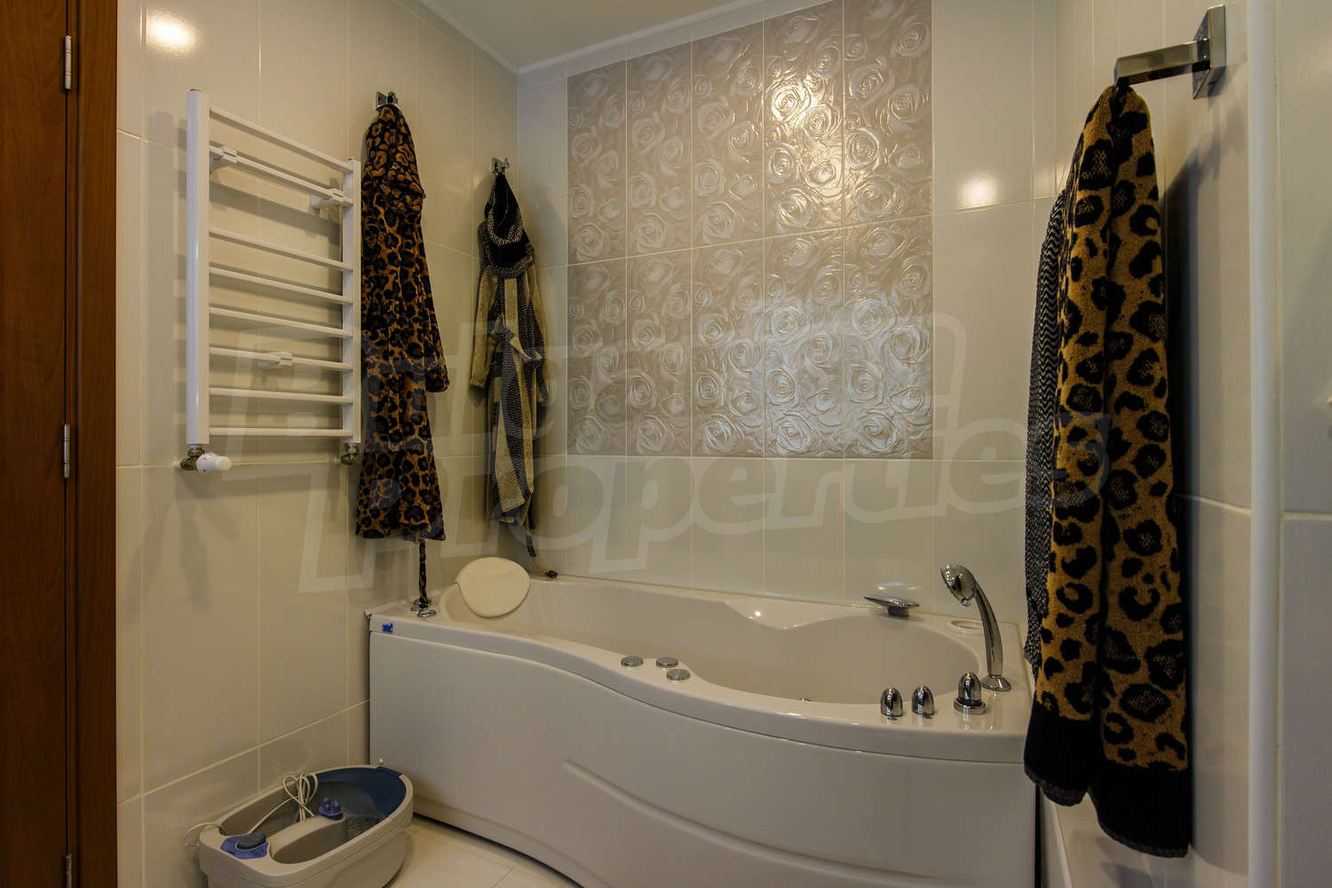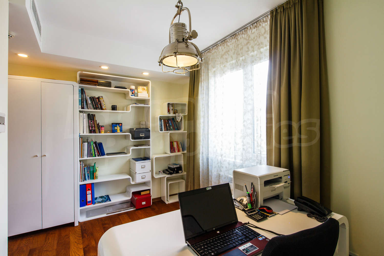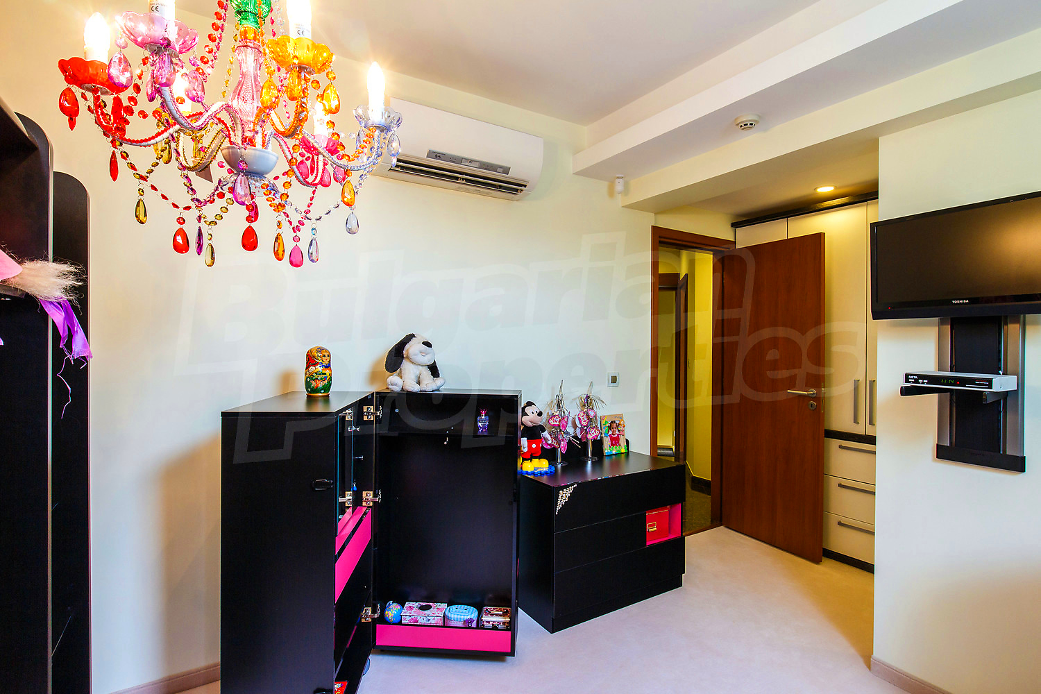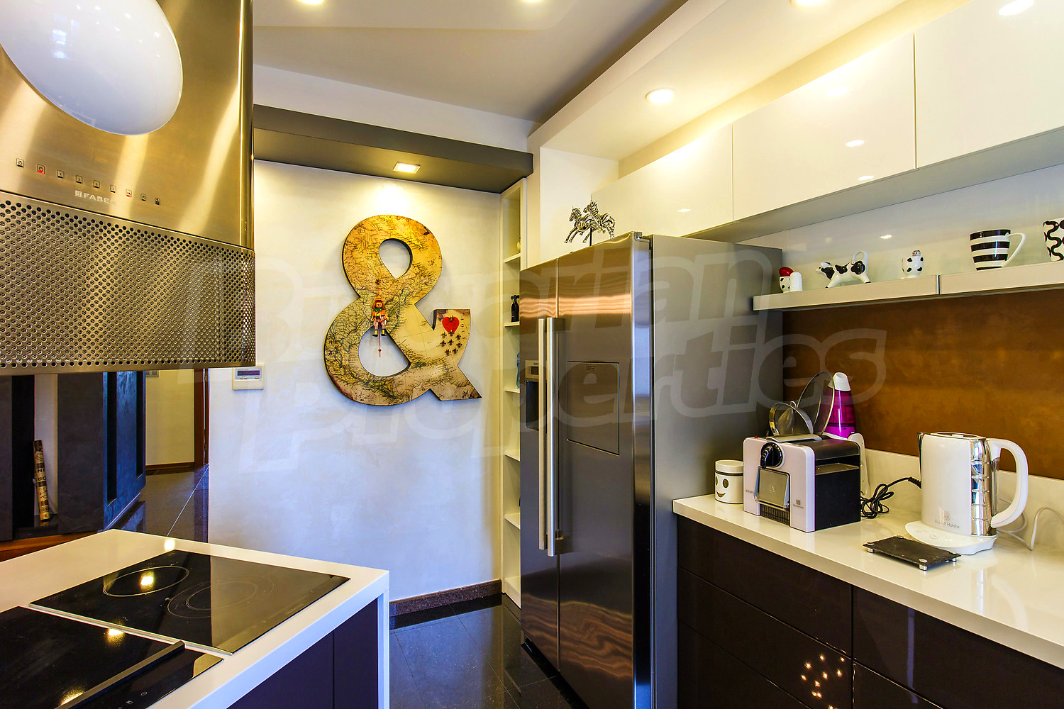 Имотът се продава напълно обзаведен. В хола и трапезарията обзавеждането е от бутиковата марка за луксозно интериорно обзавеждане KARE. В дневната стая има и декоративна камина. Кухненските шкафове са изработени от MDF фронтове с лаково покритие, плотовете от технически камък. Има подгревателни чекмеджета. Кухненските уреди са вградени - парова фурна, кафе машина, микровълнова фурна с вградени скара и котлони – марка SIEMENS. Абсорбатора е Faber. В апартамента има 5 телевизора LG с три броя домашни кина LG. Има пералня и сушилня, намиращи се в мокрото помещение на второто нива, които са на марка MIELE. Имотът разполага с 3 броя бани с два броя джакузи, умивалници и батерии ROKA, смесители Hansa.