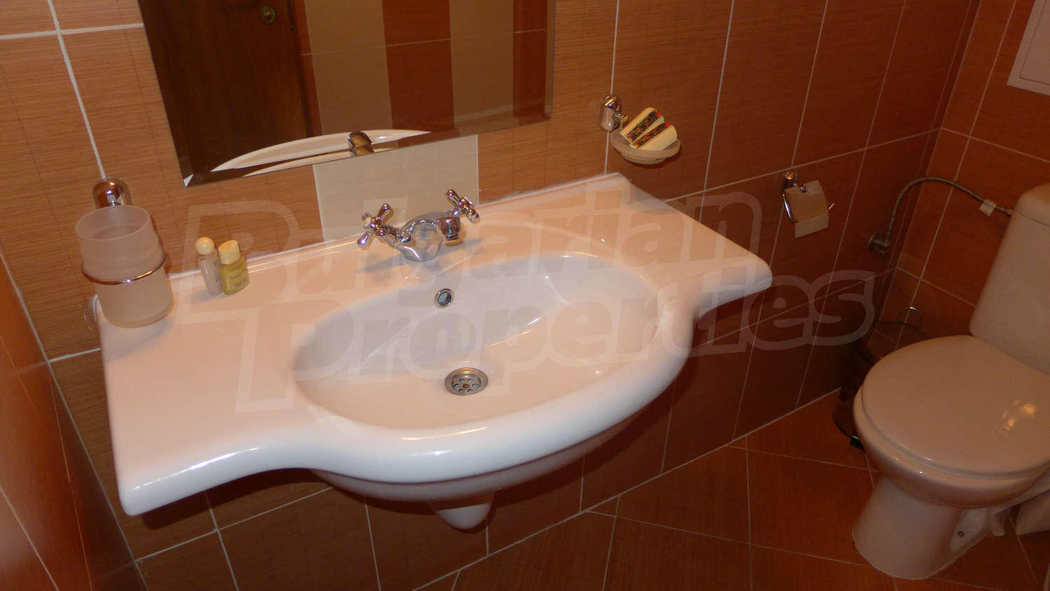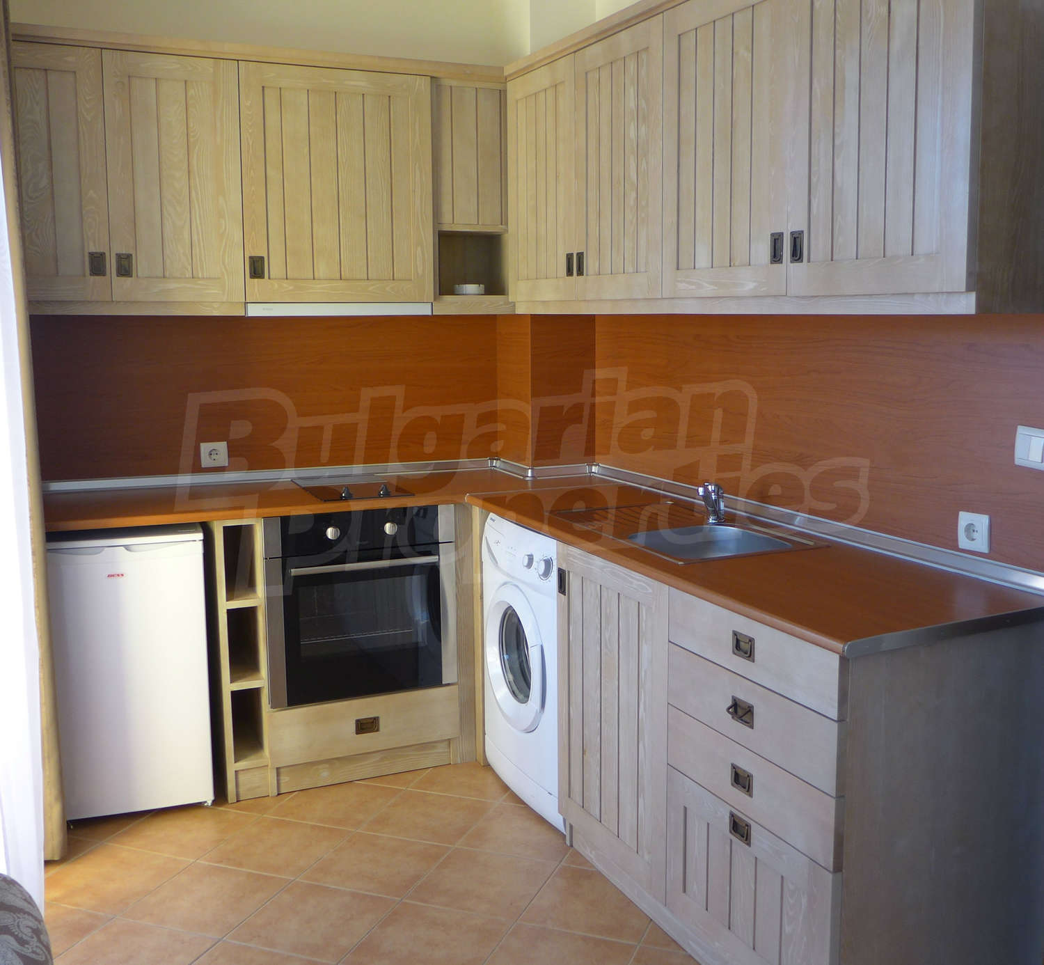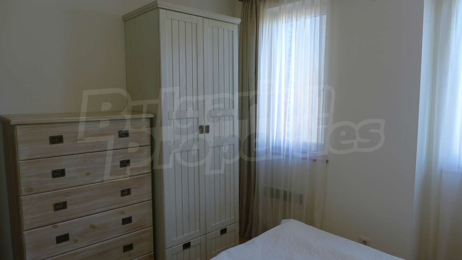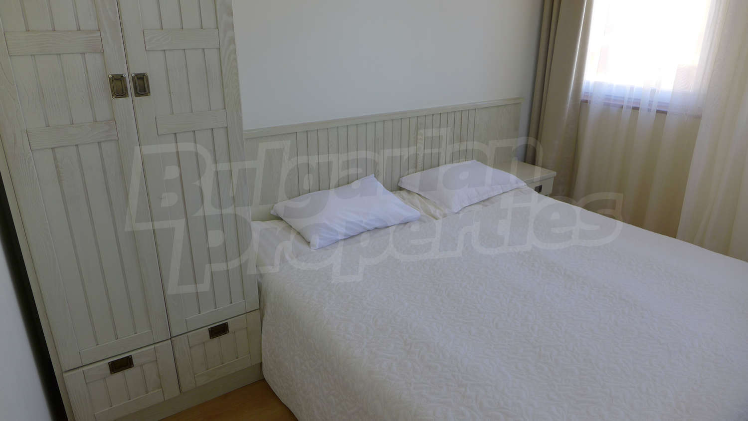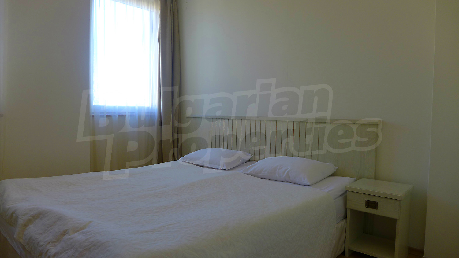 Имотът се предлага с РЗП – 76,93 кв.м. Завършен е със стени – латекс, под - ламинат и теракота, и ПВЦ дограми. Кухнята е оборудвана с керамичен плот, мивка, шкафове, котлони, печка, маса с четири стола, хладилник, пералня. Холът е обзаведен с шкафче и телевизор, DVD, малка масичка, диван, фотьойл, маса. В едната спалня ще открите двойно легло, две нощни шкафчета, голям гардероб, а в другата - двойно легло, две нощни шкафчета, голям гардероб, скрин. Баните са снабдени с душ, мивка с огледало, тоалетни. Жилището е окабелено за телефон, кабелна телевизия и телефон. Отоплява се чрез електрически радиатори.