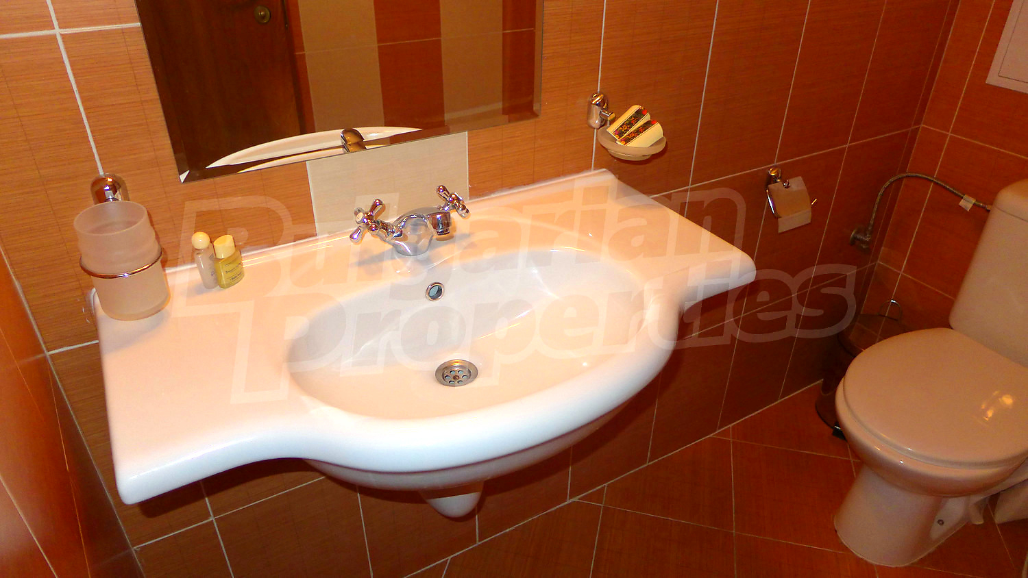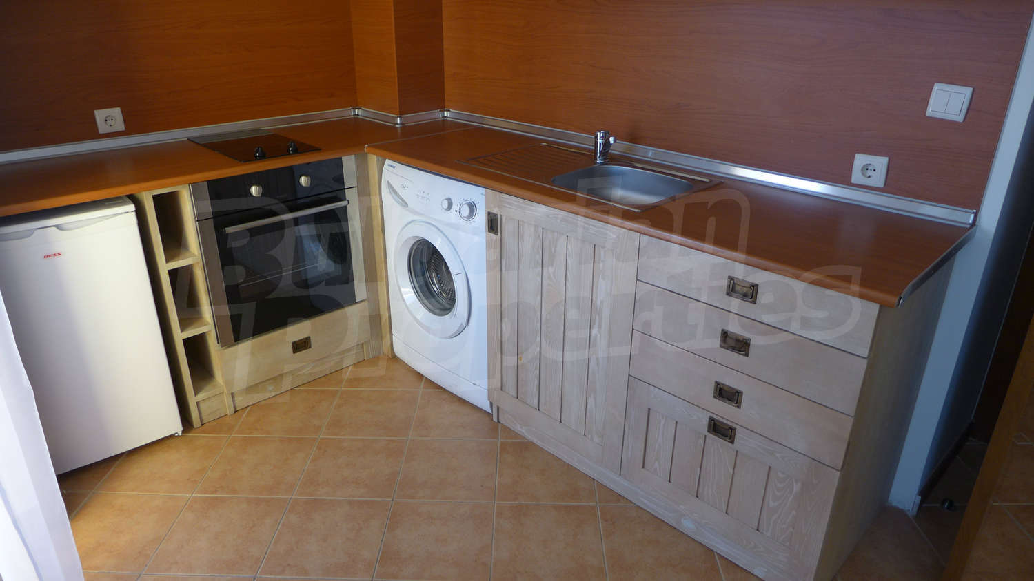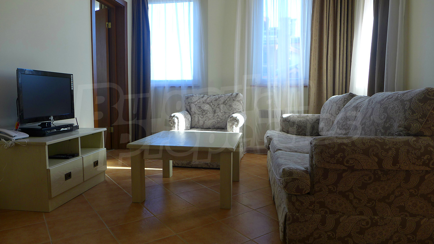 Имотът се предлага с РЗП – 76,93 кв.м. Завършен е със стени – латекс, под - ламинат и теракота, и ПВЦ дограми. Кухнята е оборудвана с керамичен плот, мивка, шкафове, котлони, печка, маса с четири стола, хладилник, пералня. Холът е обзаведен с шкафче и телевизор, DVD, малка масичка, диван, фотьойл, маса. В едната спалня ще открите двойно легло, две нощни шкафчета, голям гардероб, а в другата - двойно легло, две нощни шкафчета, голям гардероб, скрин. Баните са снабдени с душ, мивка с огледало, тоалетни. Жилището е окабелено за телефон, кабелна телевизия и телефон. Отоплява се чрез електрически радиатори.
