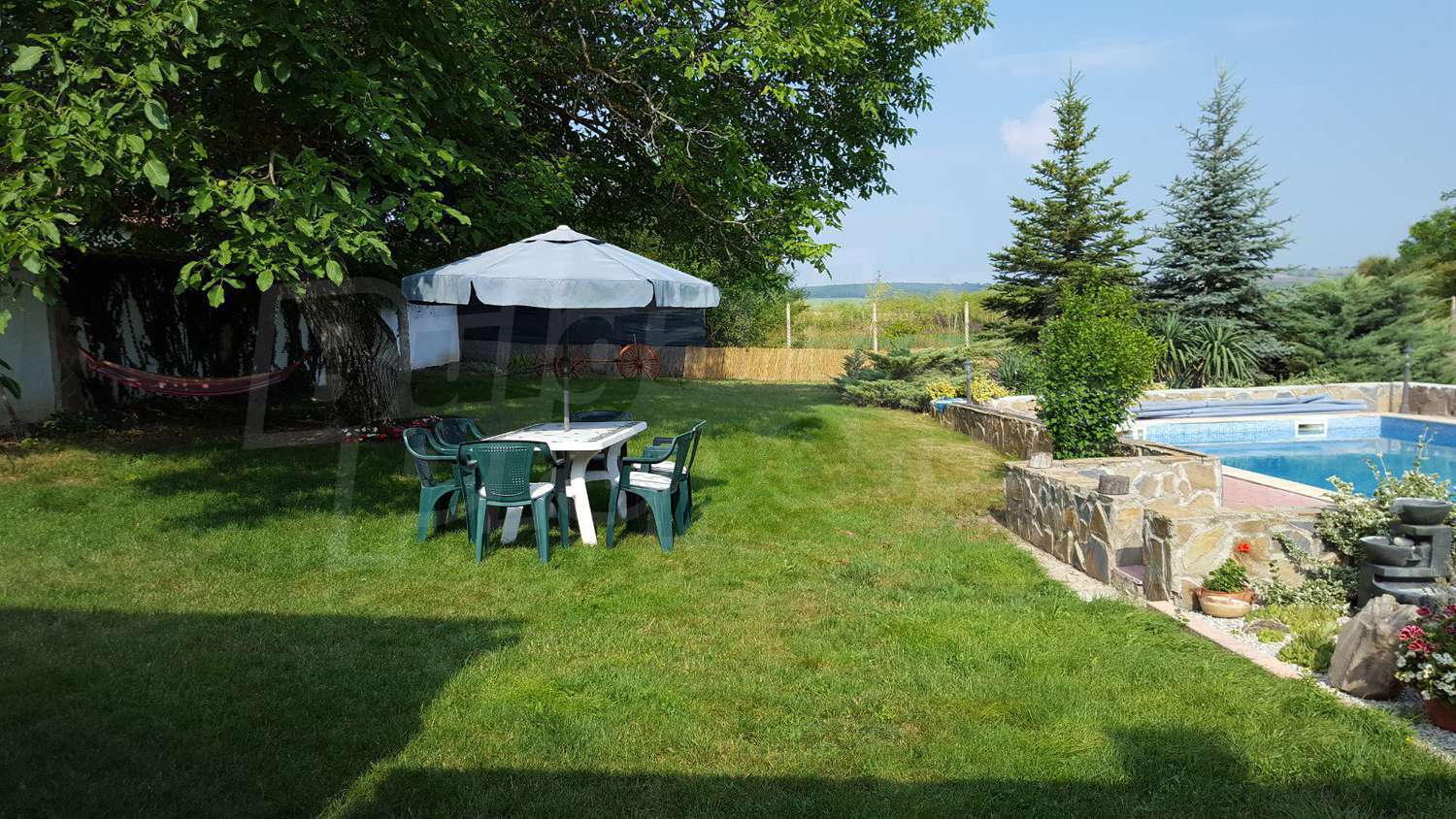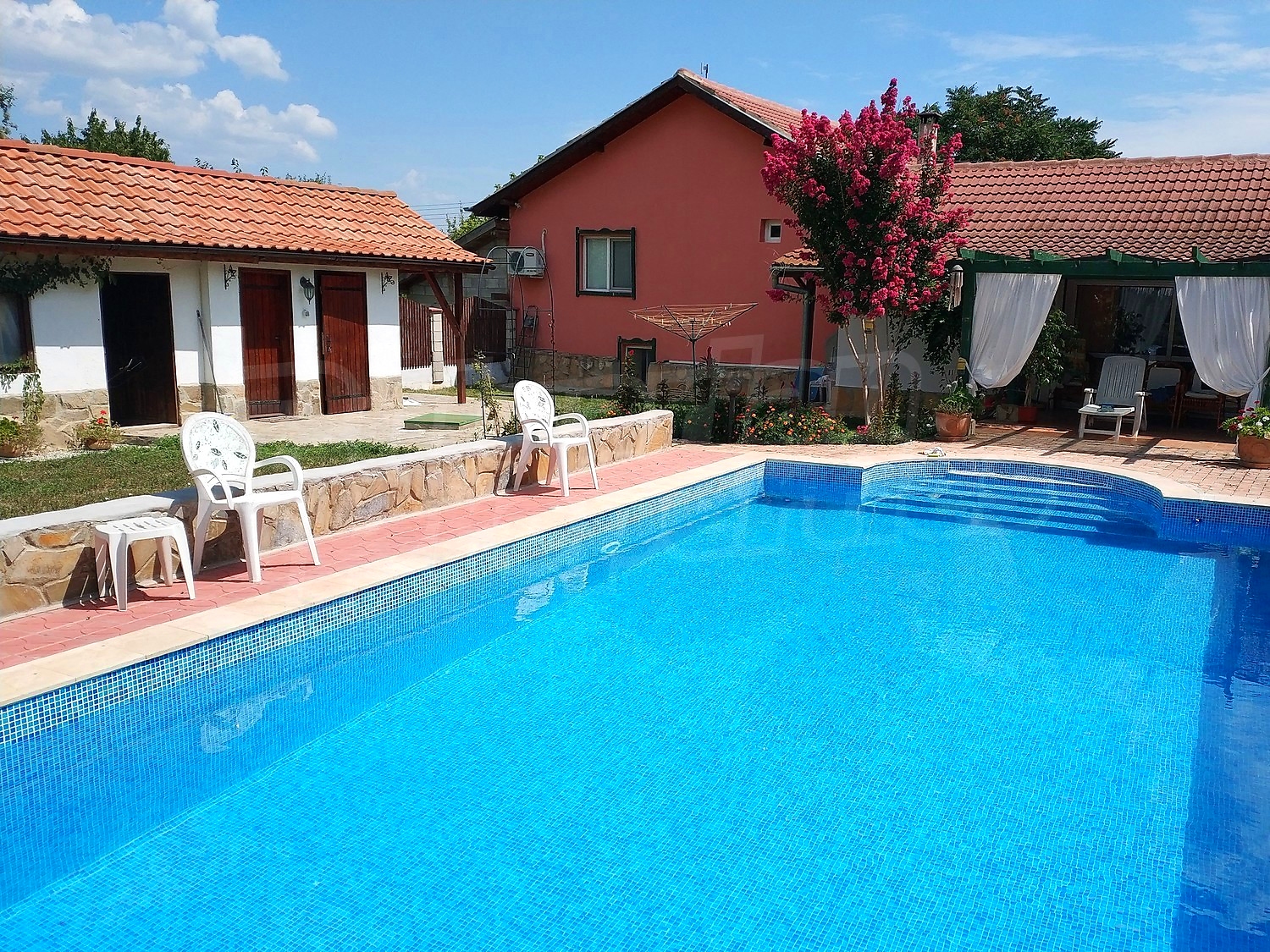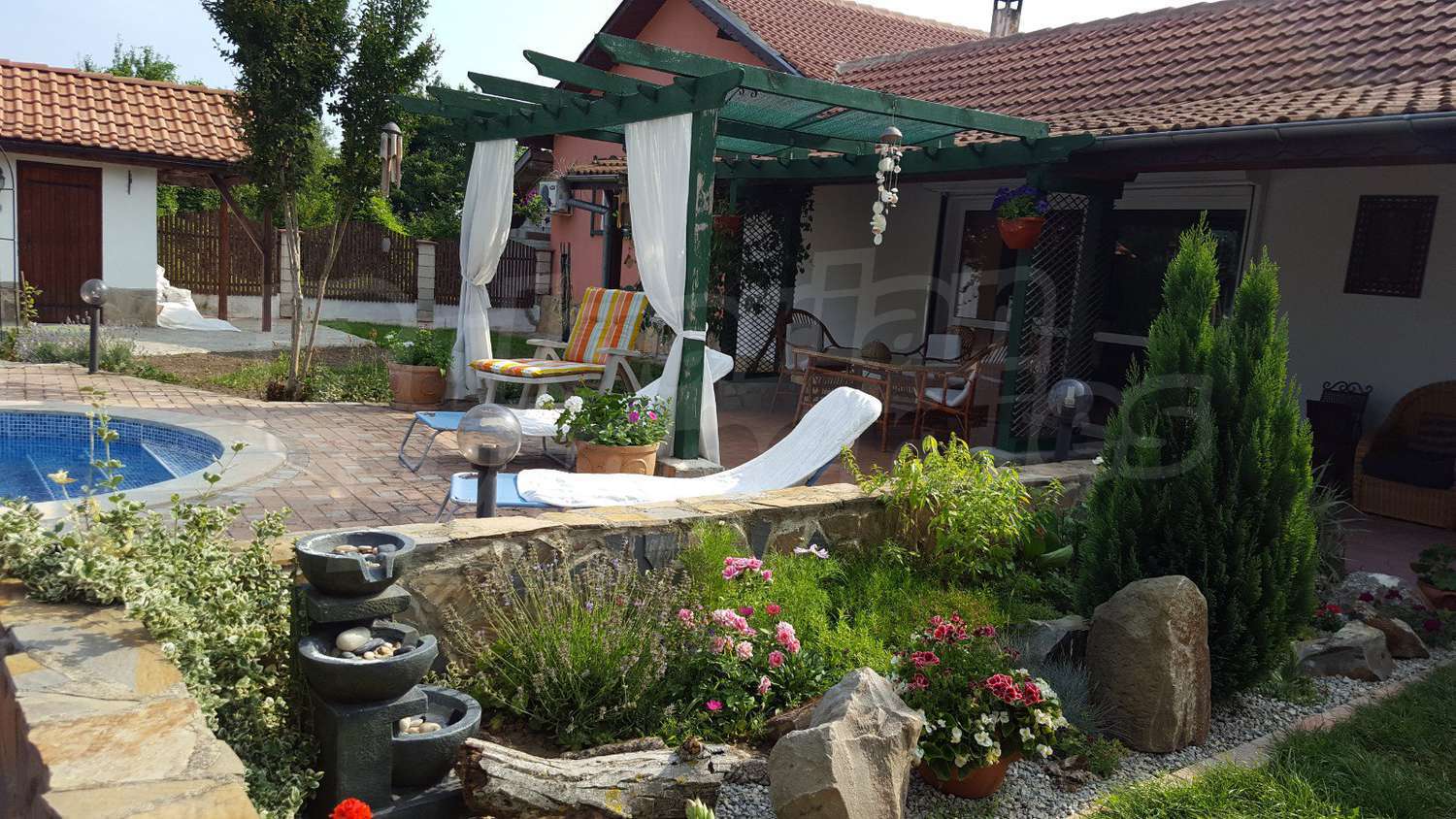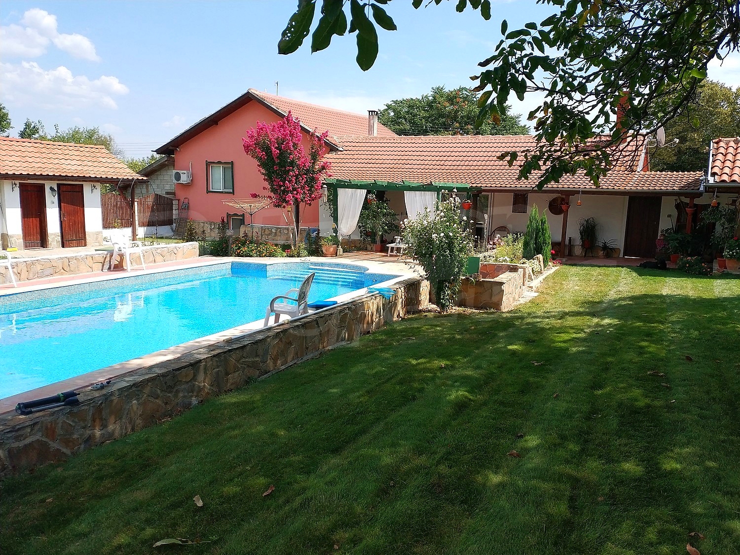 Дворното място от 1100 кв.м. е с изградени в него чудесен басейн, барбекю зона и кът за релакс. Отличен имот за вашата незабравима почивка и комфортния начин на живот на вашето семейство.