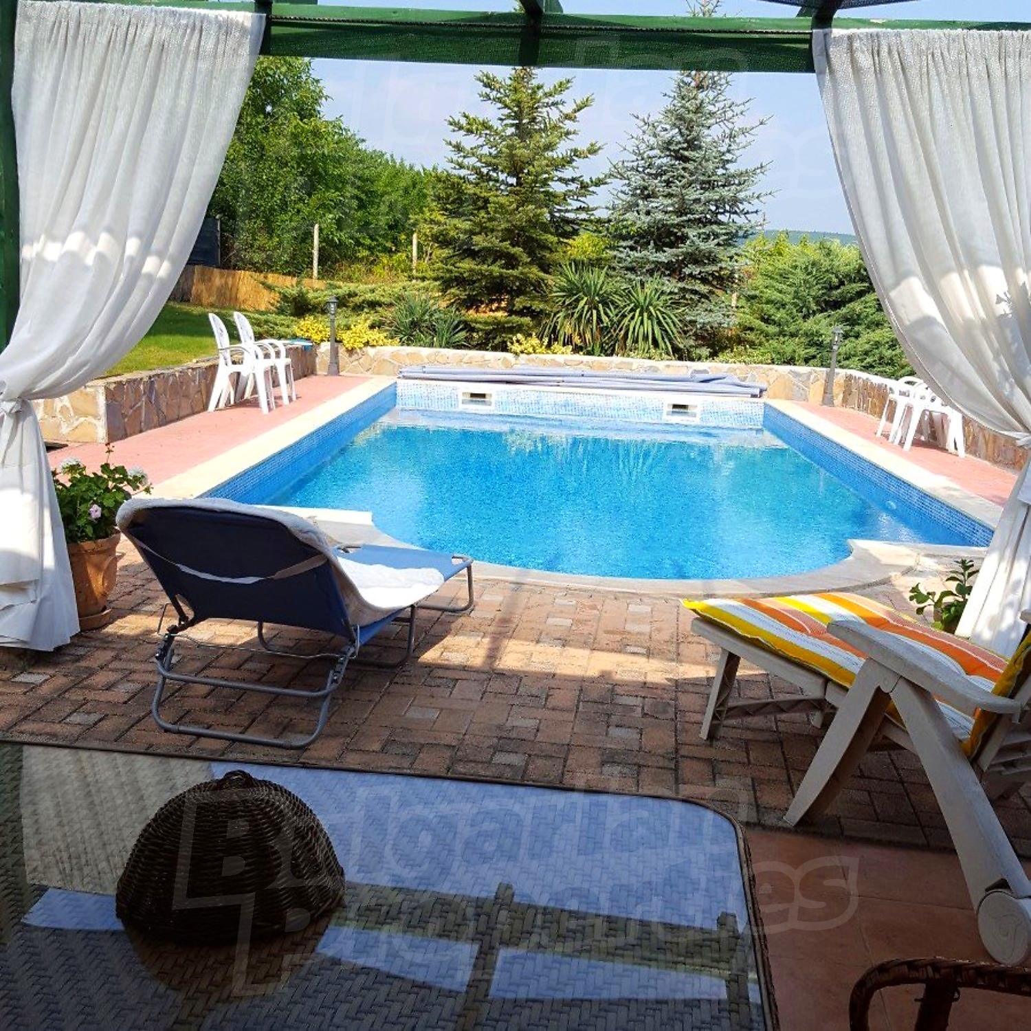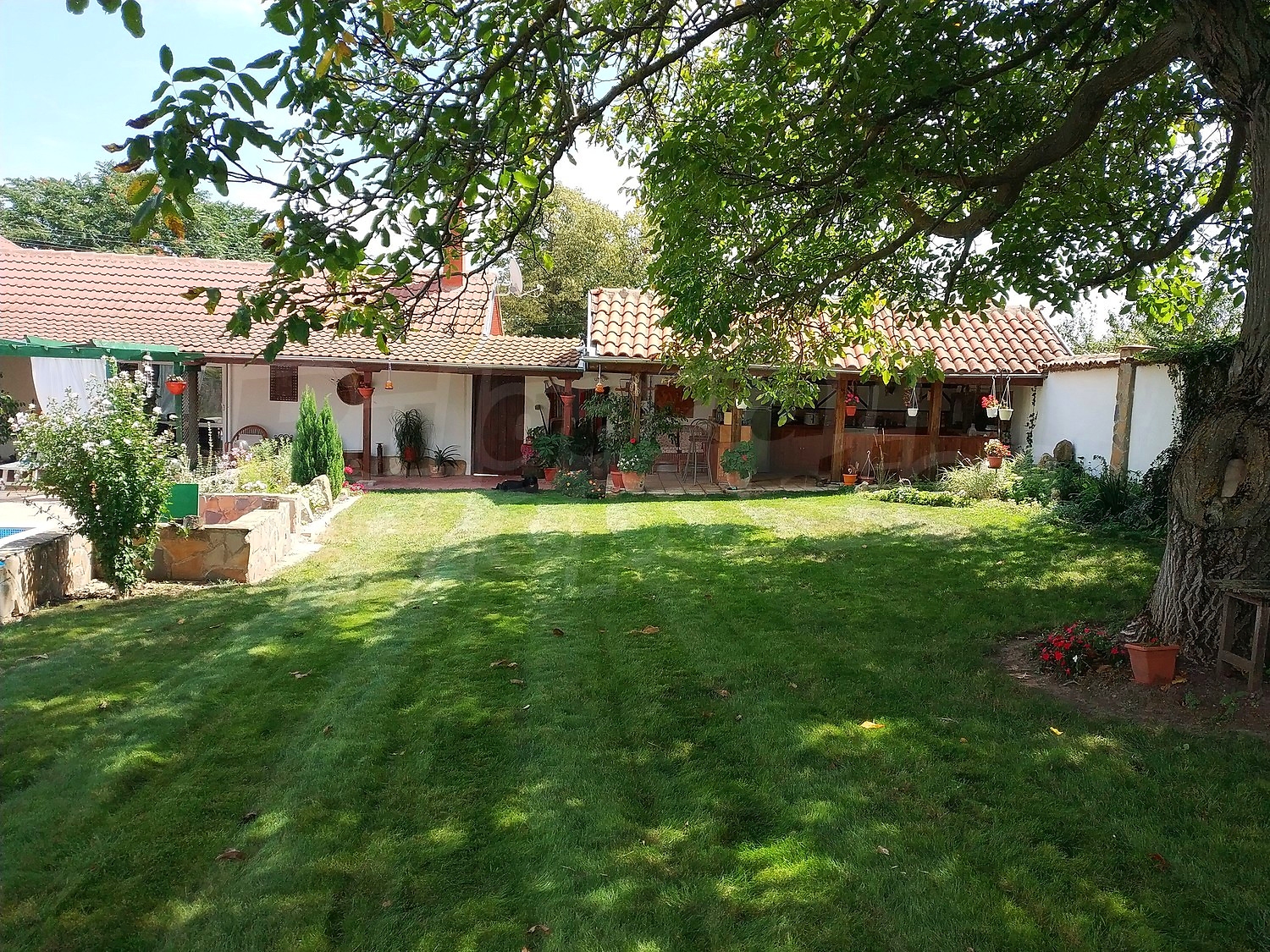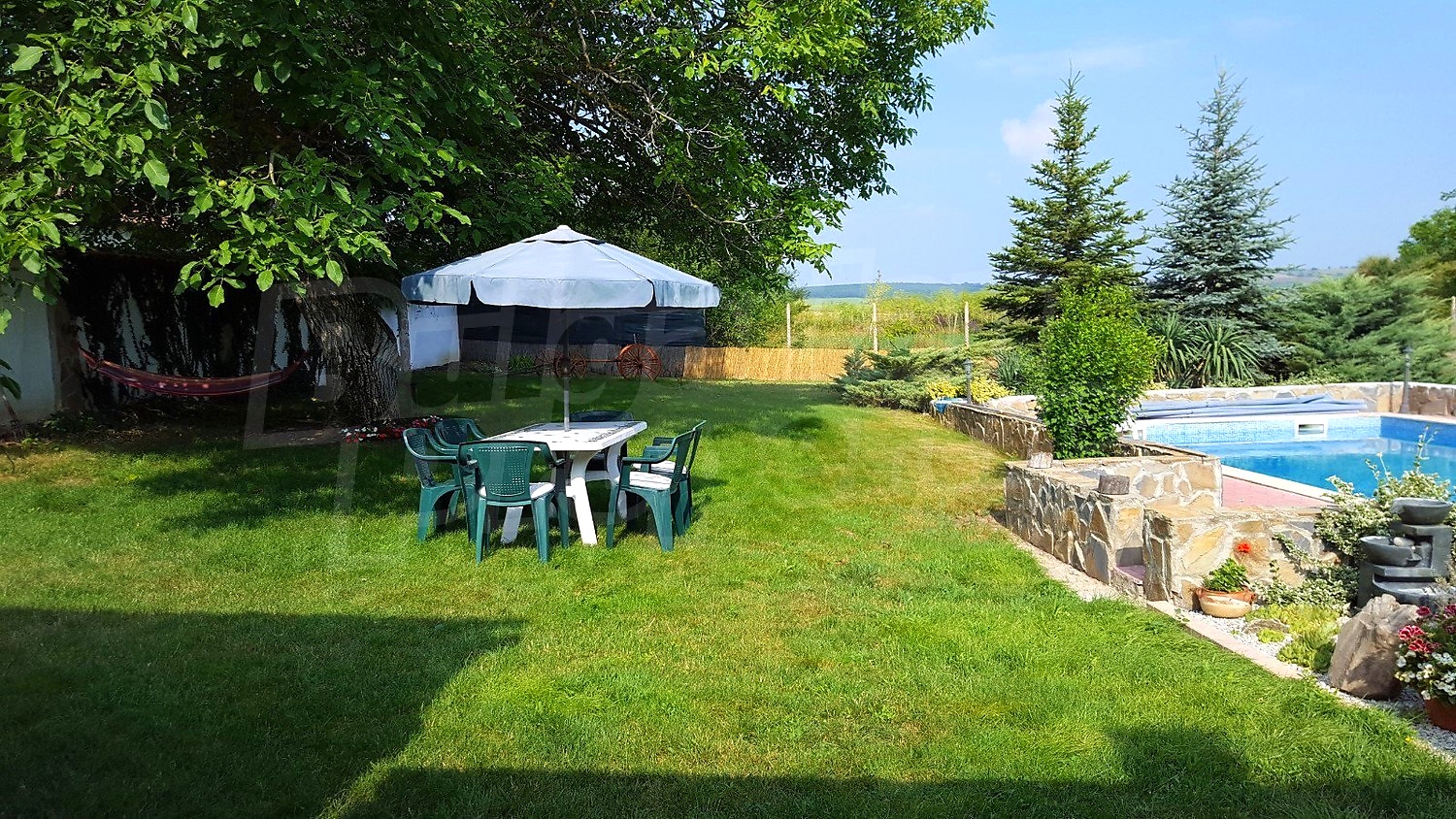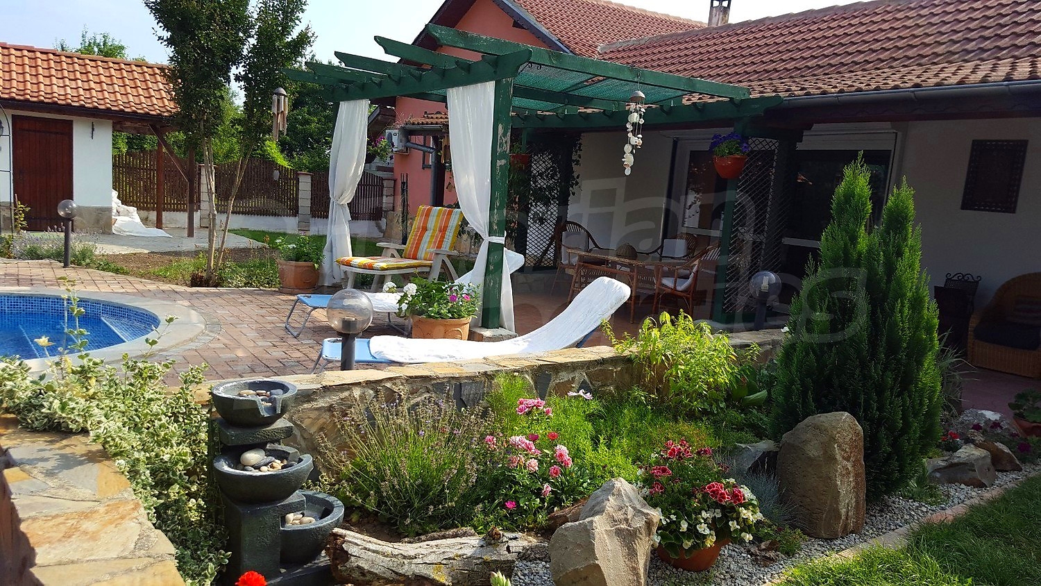 Дворното място от 1100 кв.м. е с изградени в него чудесен басейн, барбекю зона и кът за релакс. Отличен имот за вашата незабравима почивка и комфортния начин на живот на вашето семейство.