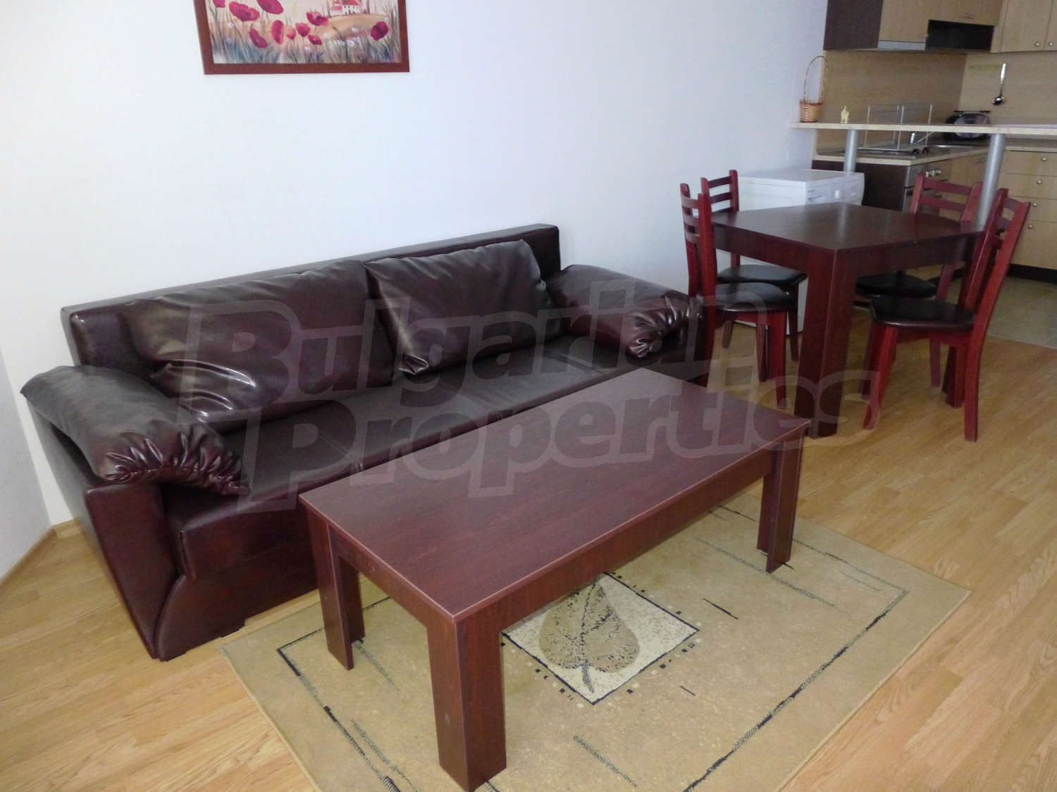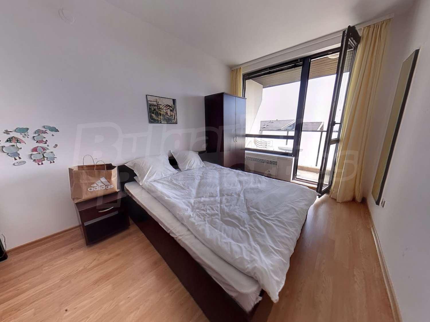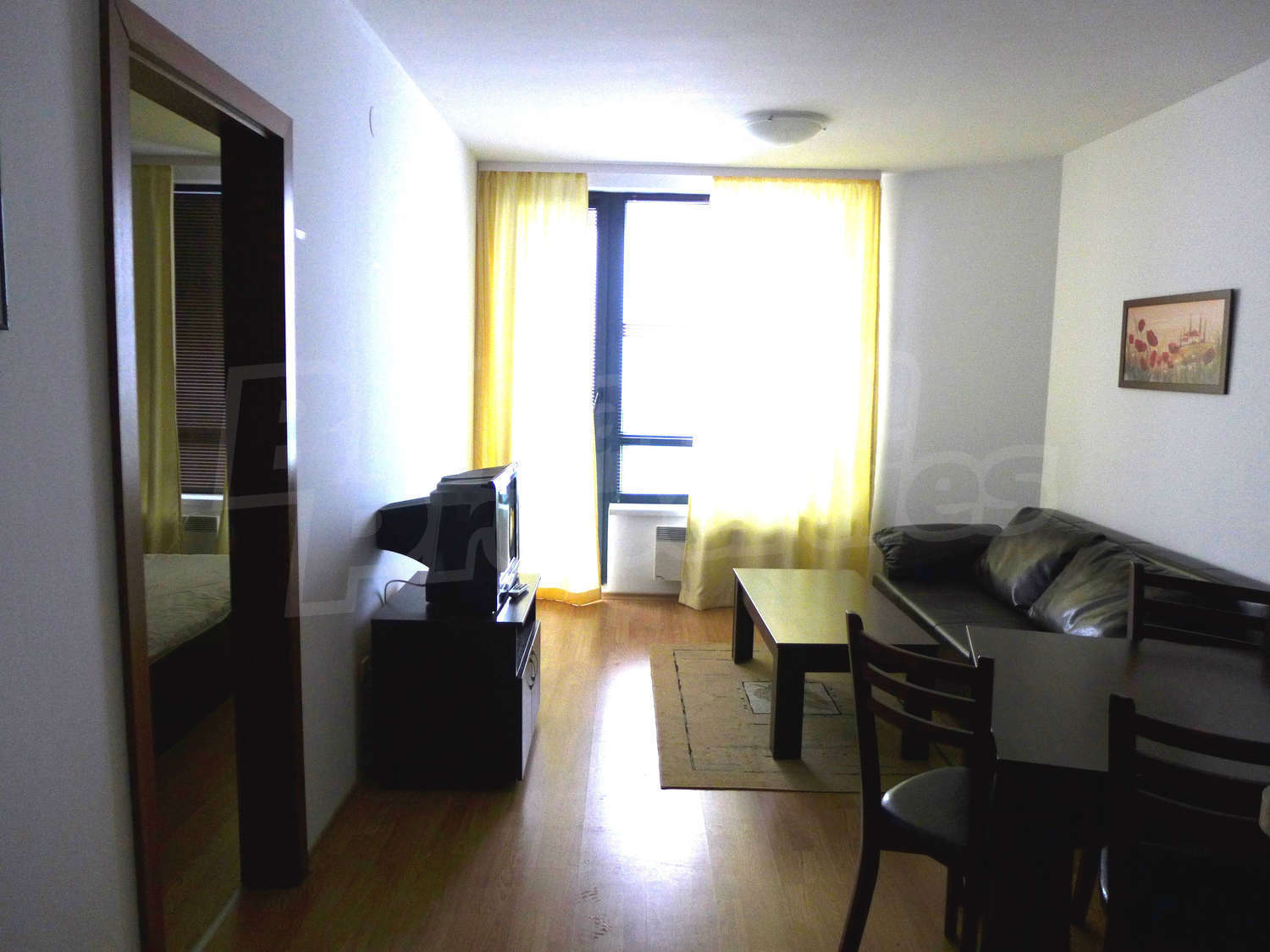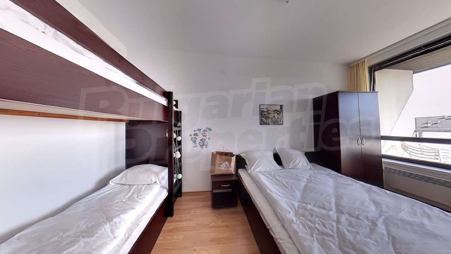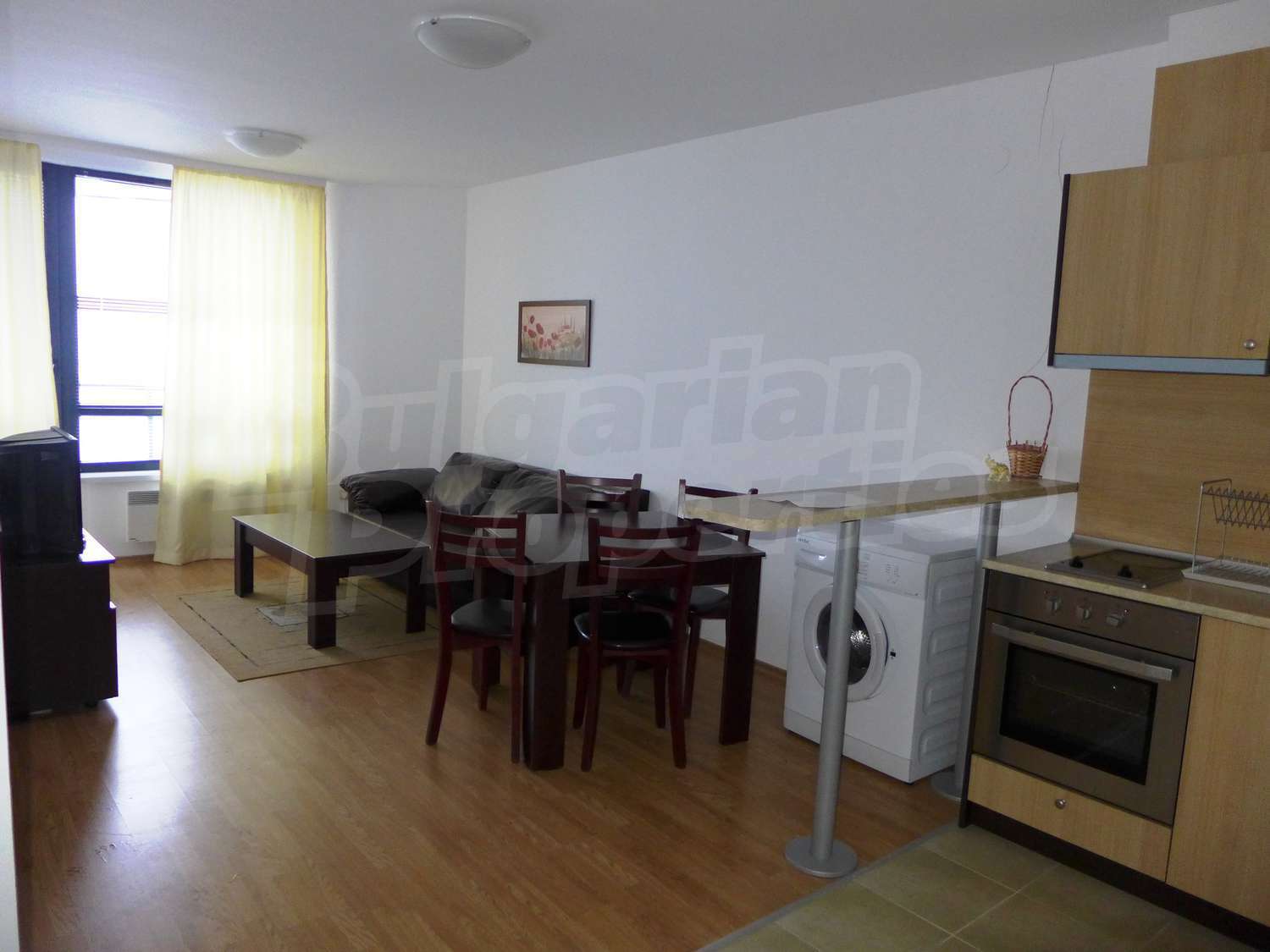 Имотът с площ от 65.18 кв.м. и се намира на четвърти етаж с панорамна гледка към планината и полята в околността. Предлага със следната степен на завършеност: PVC дограма, подове с ламиниран паркет, теракот, стени - латекс. Апартаментът се продава напълно обзаведен. Модерната кухня включва фурна, двоен котлон, аспиратор, мивка, хладилник, пералня, електрическа кана, тостер. В хола има троен разтегателен диван, масичка за кафе, сателитна телевизия, DVD плейър, поставка за телевизор, маса за хранене, 4 стола за хранене, скрин, пердета и завеси. Спалнята е с голямо двойно легло, 2 нощни шкафчета, гардероб с двойно, двуетажни легла, огледала, завеси и щори. Банята е оборудвана с тоалетна, вана/душ, мивка, огледало, бойлер. Отоплението се осъществява посредством електрически конвектори. Балконът е с източно изложение.