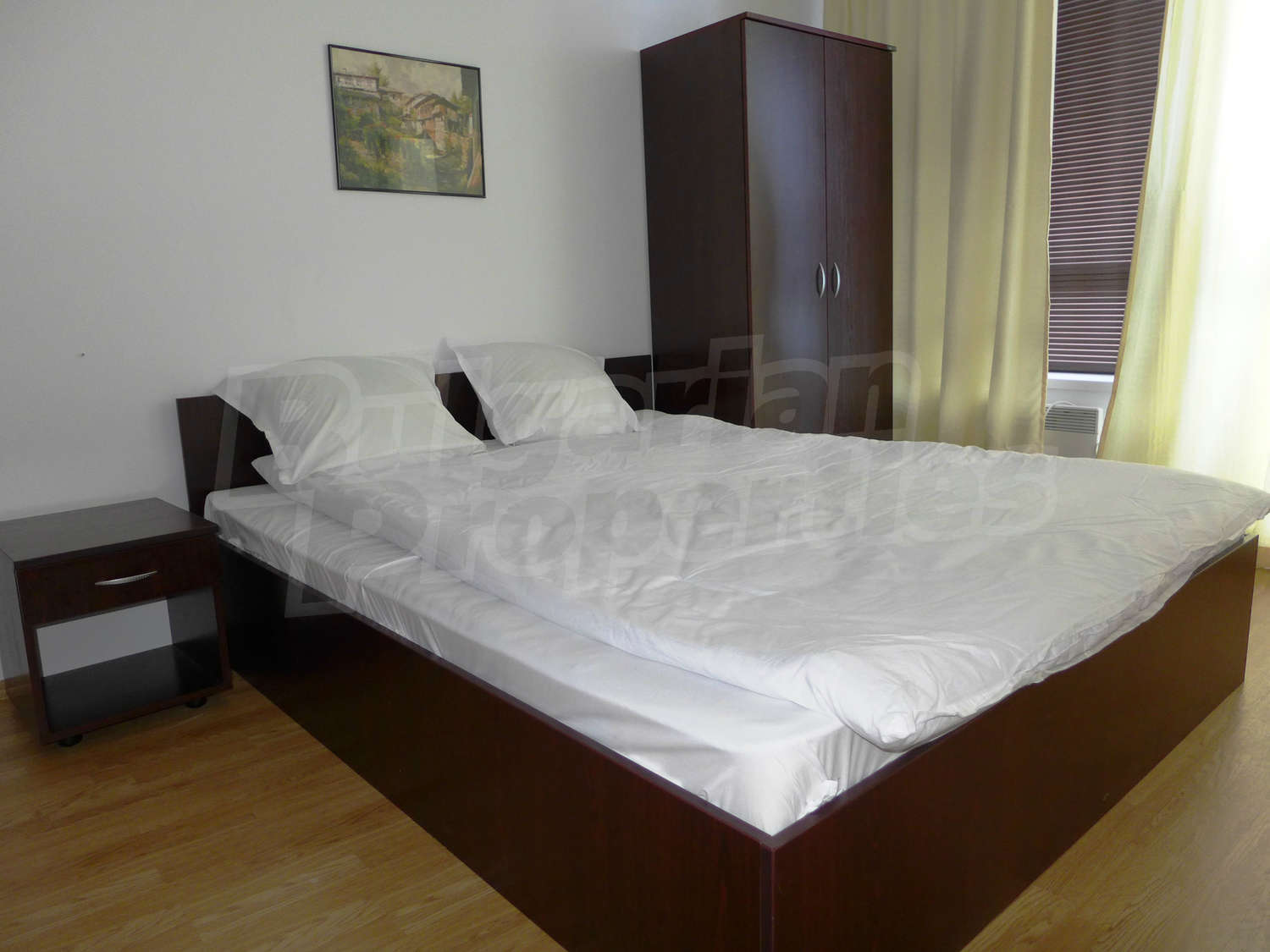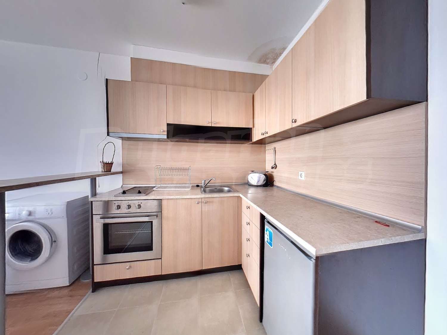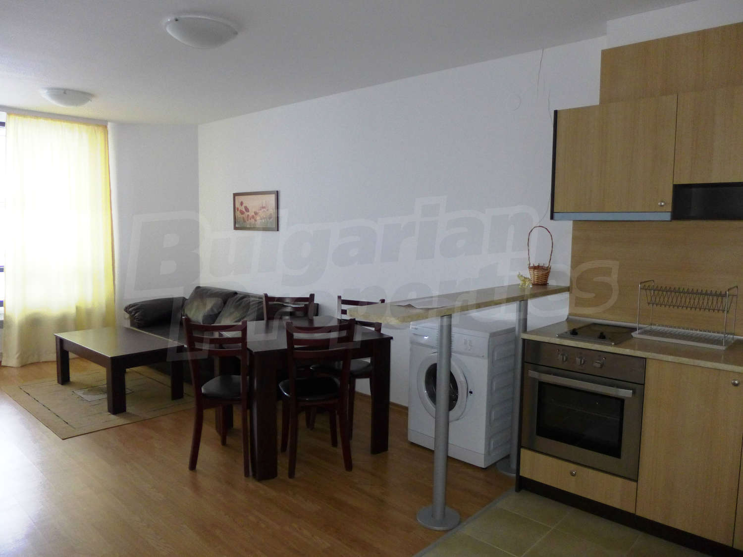 Имотът с площ от 65.18 кв.м. и се намира на четвърти етаж с панорамна гледка към планината и полята в околността. Предлага със следната степен на завършеност: PVC дограма, подове с ламиниран паркет, теракот, стени - латекс. Апартаментът се продава напълно обзаведен. Модерната кухня включва фурна, двоен котлон, аспиратор, мивка, хладилник, пералня, електрическа кана, тостер. В хола има троен разтегателен диван, масичка за кафе, сателитна телевизия, DVD плейър, поставка за телевизор, маса за хранене, 4 стола за хранене, скрин, пердета и завеси. Спалнята е с голямо двойно легло, 2 нощни шкафчета, гардероб с двойно, двуетажни легла, огледала, завеси и щори. Банята е оборудвана с тоалетна, вана/душ, мивка, огледало, бойлер. Отоплението се осъществява посредством електрически конвектори. Балконът е с източно изложение.