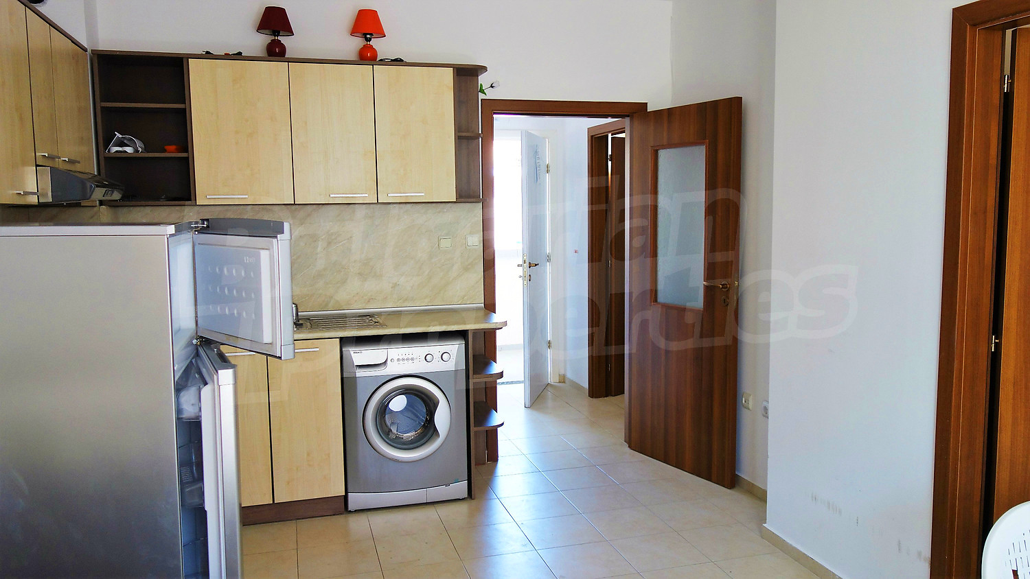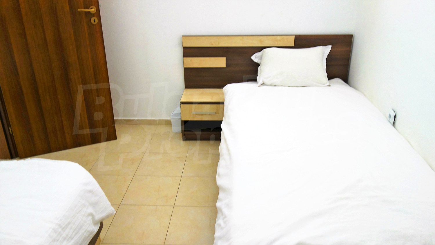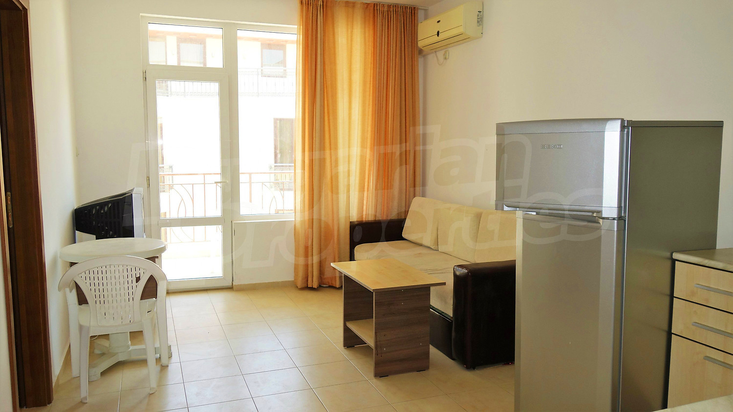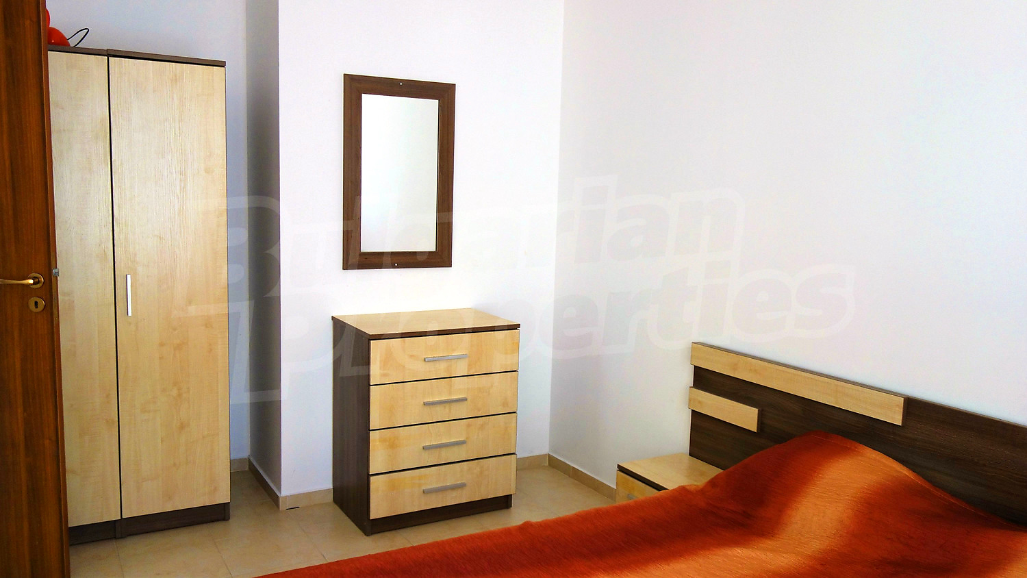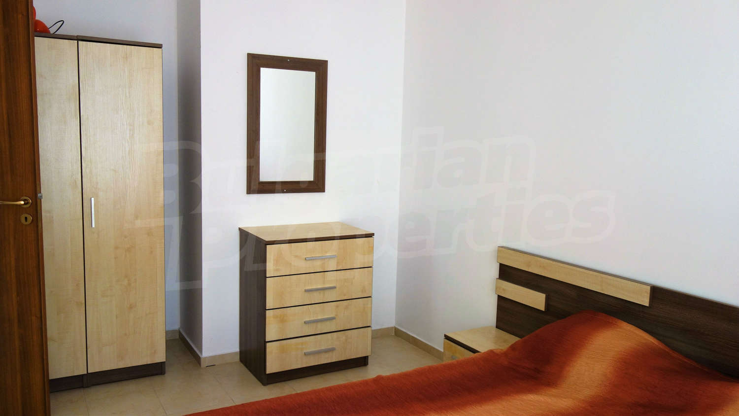 Жилището се намира на пети последен етаж с обща площ от 58 кв.м. Разпределя се между хол с кухненски бокс, две спални, баня с тоалетна и един балкон с гледка към вътрешния двор с басейн. Завършен е с подове теракот, стени латекс, ПВЦ дограми. Отоплението е с климатици. Жилището разполага с интернет и кабелна телевизия, както и пълно обзавеждане и необходимо оборудване. В комплекса има асансьор. Годишна такса поддръжка на комплекса - 10 евро на м2.