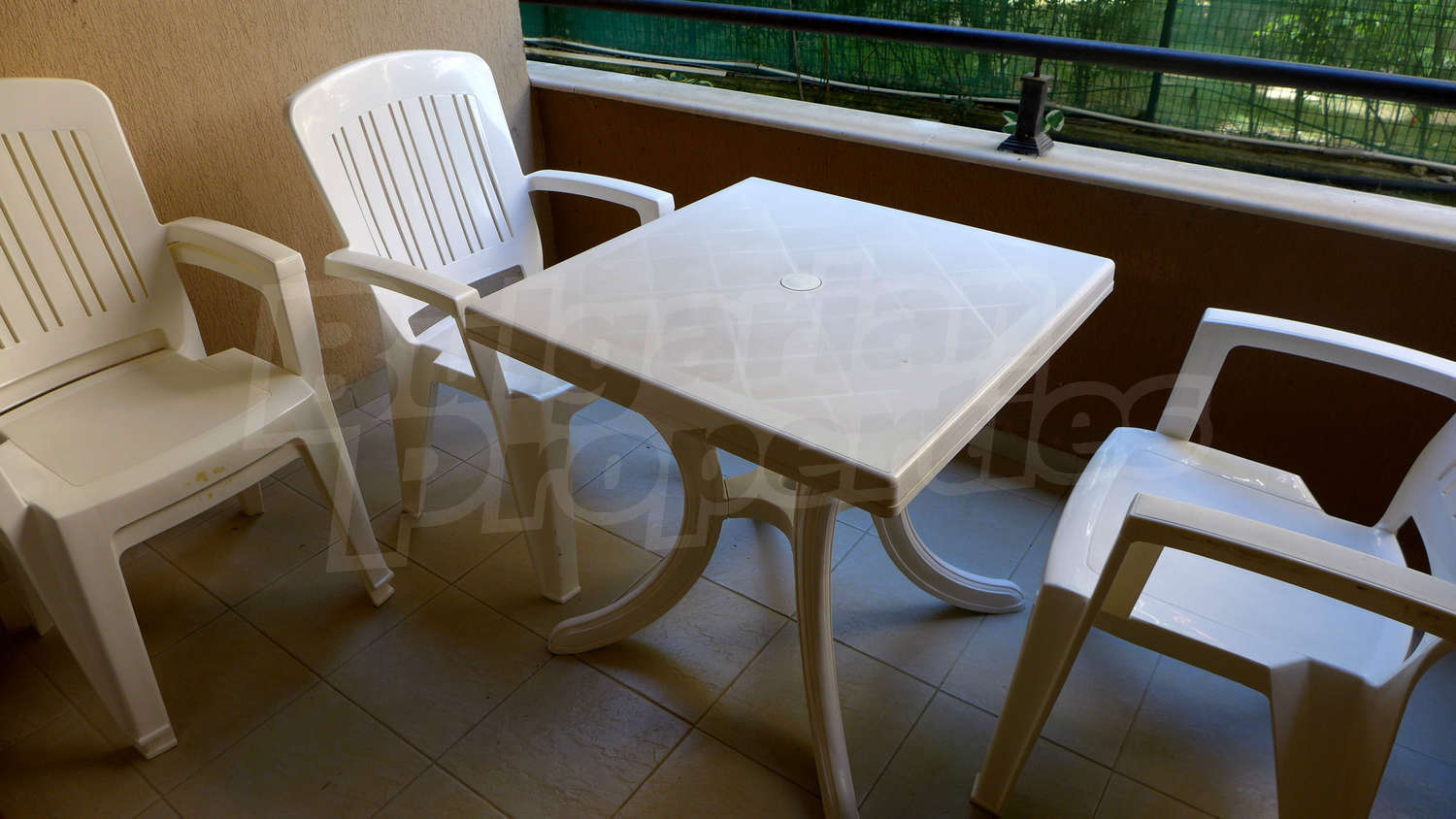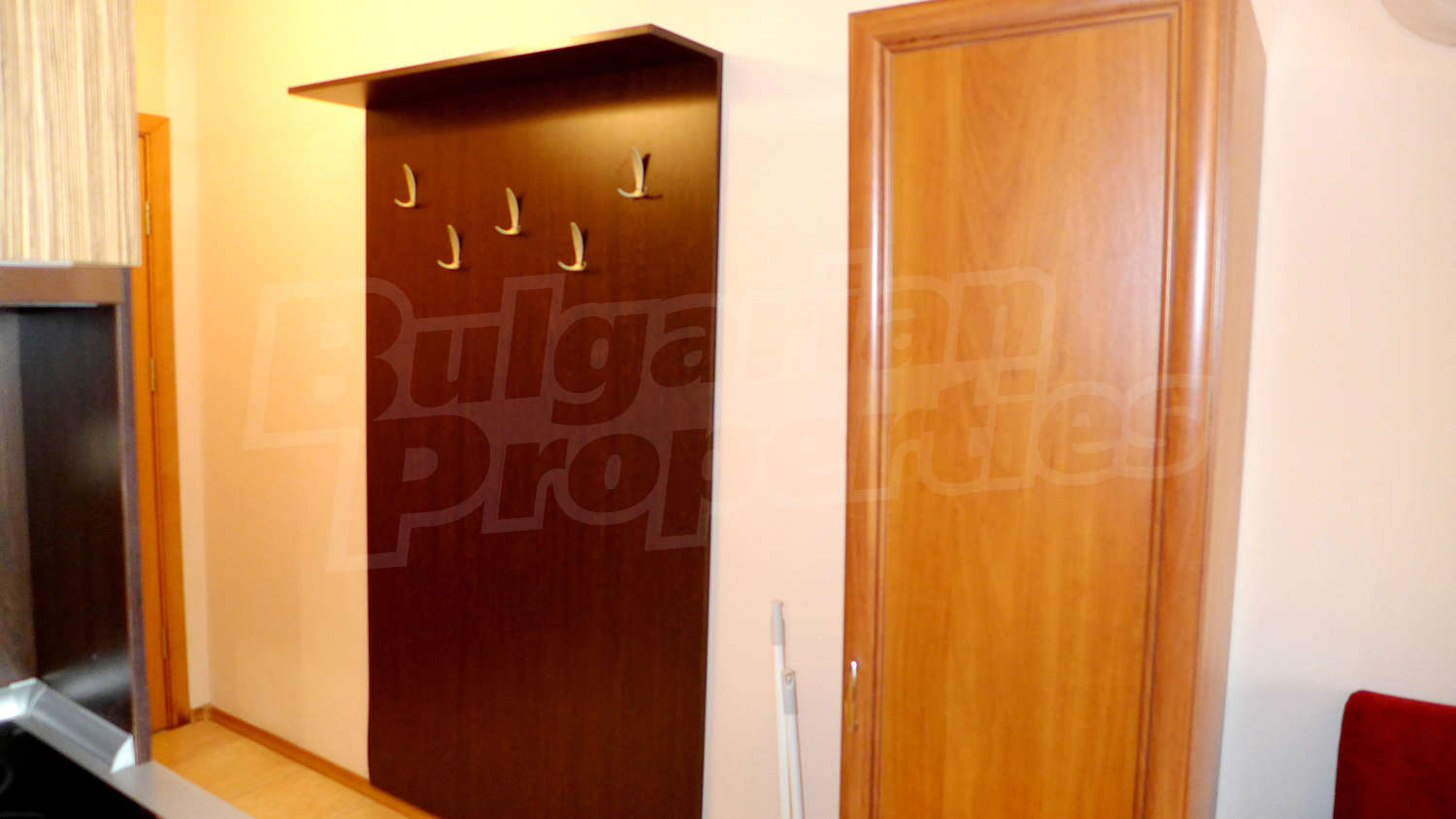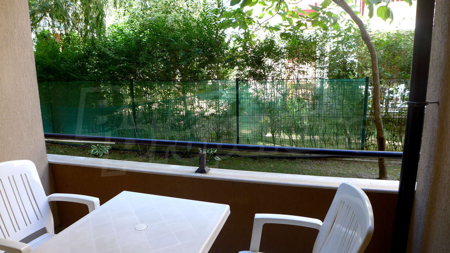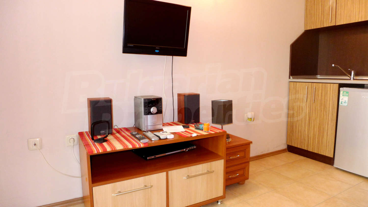 Апартаментът (30 кв.м.) се намира на първи етаж и се продава напълно обзаведен и оборудван с котлон, хладилник, разтегателен диван, гардероб, маса с 2 стола, телевизор. Отоплението се осъществява посредством климатици. Имотът се предлага със следната степен на завършеност: PVC дограма, подове с теракот и стени - латекс. Важно е да се отбележи, че имотът разполага с: балкон, интернет, кабелна телевизия. От имота се разкрива гледка към вътрешен двор.