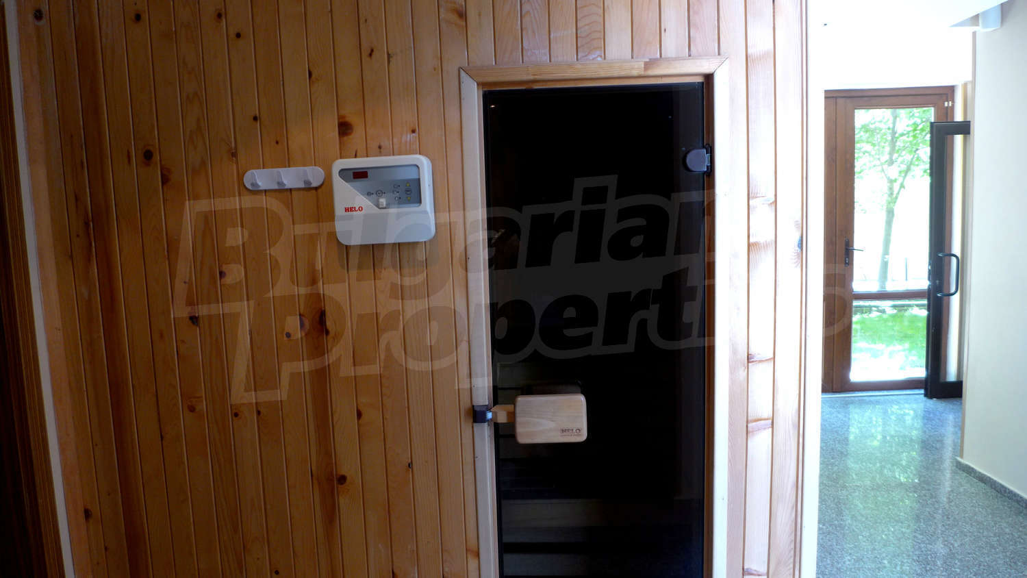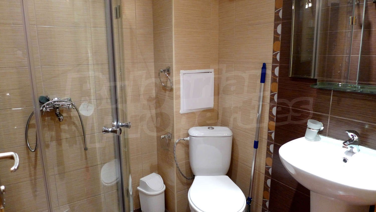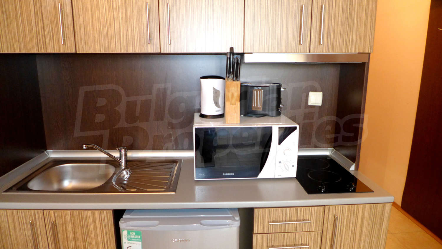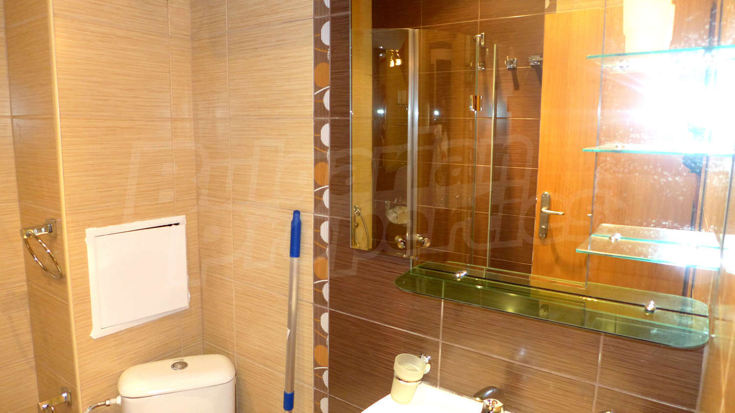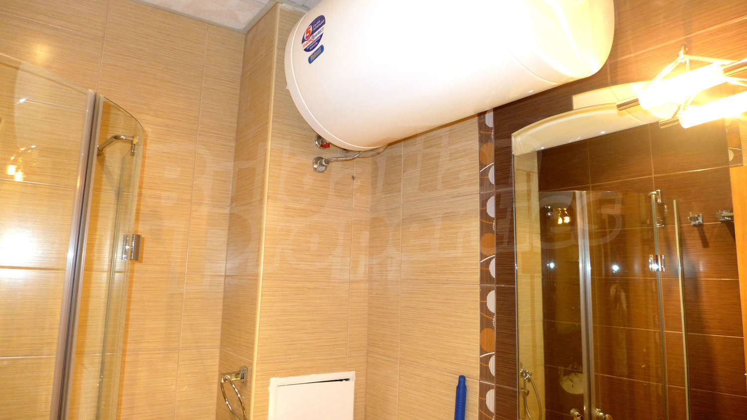 Апартаментът (30 кв.м.) се намира на първи етаж и се продава напълно обзаведен и оборудван с котлон, хладилник, разтегателен диван, гардероб, маса с 2 стола, телевизор. Отоплението се осъществява посредством климатици. Имотът се предлага със следната степен на завършеност: PVC дограма, подове с теракот и стени - латекс. Важно е да се отбележи, че имотът разполага с: балкон, интернет, кабелна телевизия. От имота се разкрива гледка към вътрешен двор.