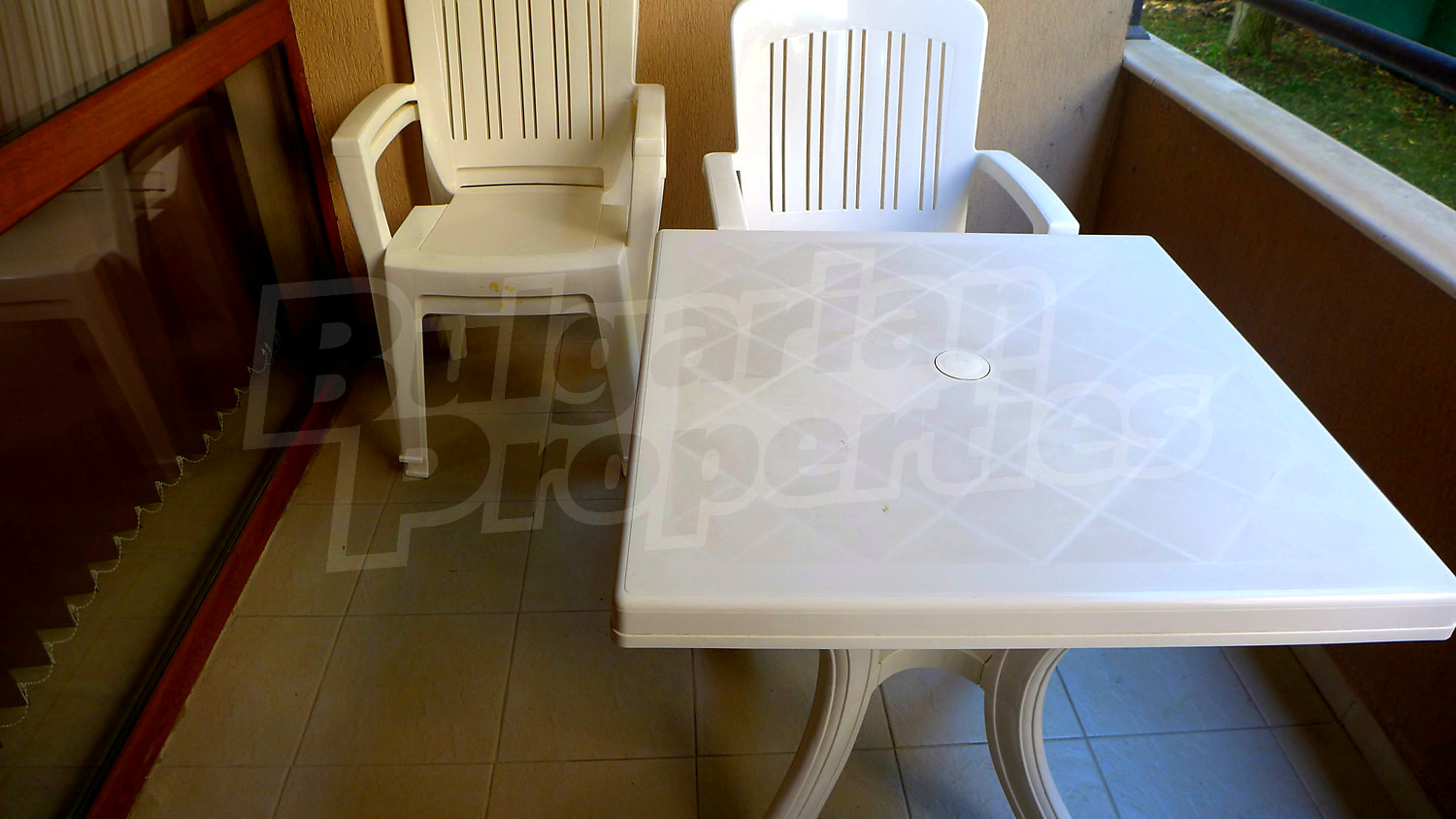 Апартаментът (30 кв.м.) се намира на първи етаж и се продава напълно обзаведен и оборудван с котлон, хладилник, разтегателен диван, гардероб, маса с 2 стола, телевизор. Отоплението се осъществява посредством климатици. Имотът се предлага със следната степен на завършеност: PVC дограма, подове с теракот и стени - латекс. Важно е да се отбележи, че имотът разполага с: балкон, интернет, кабелна телевизия. От имота се разкрива гледка към вътрешен двор.