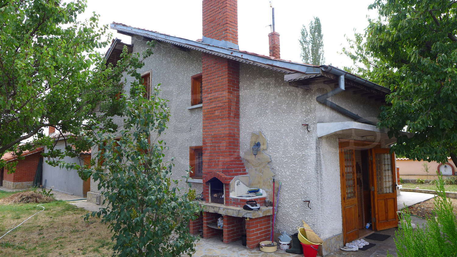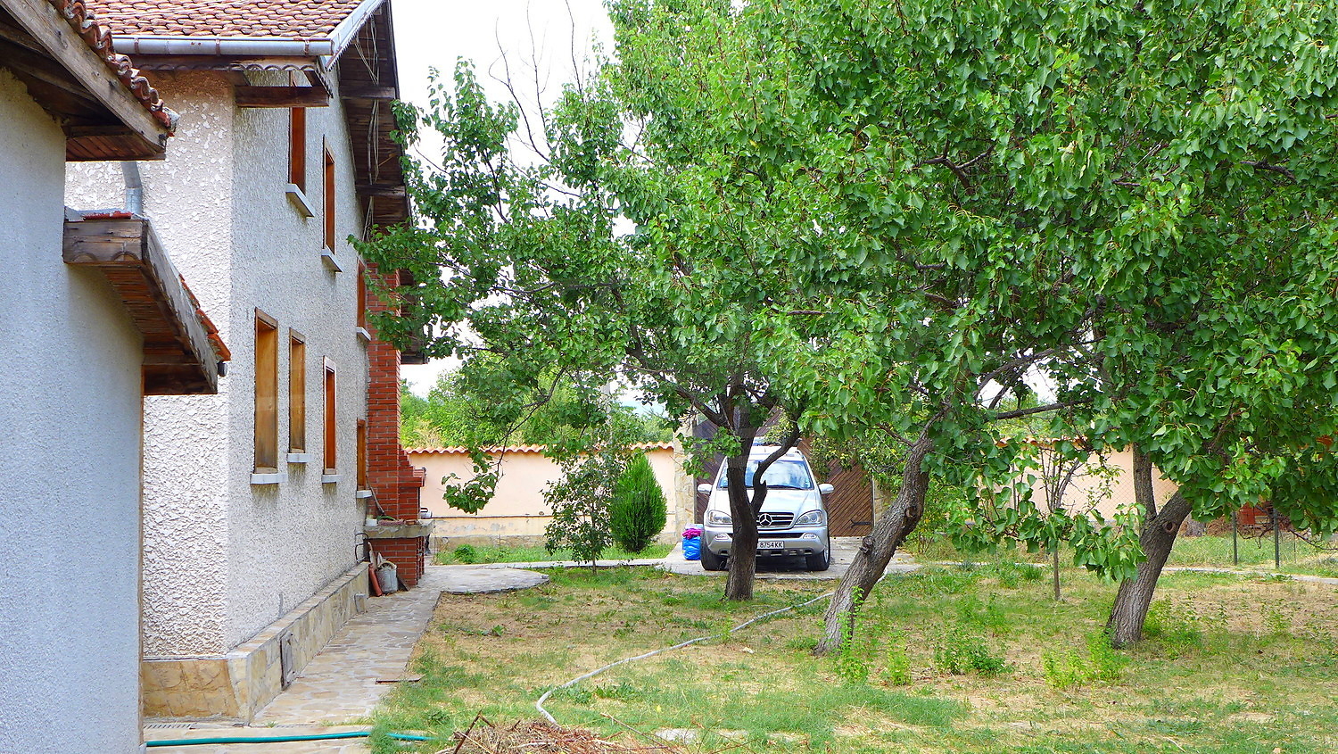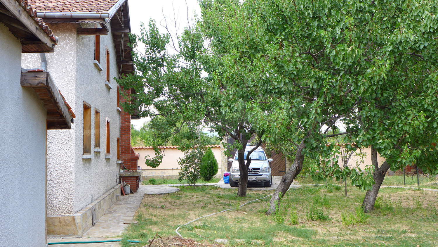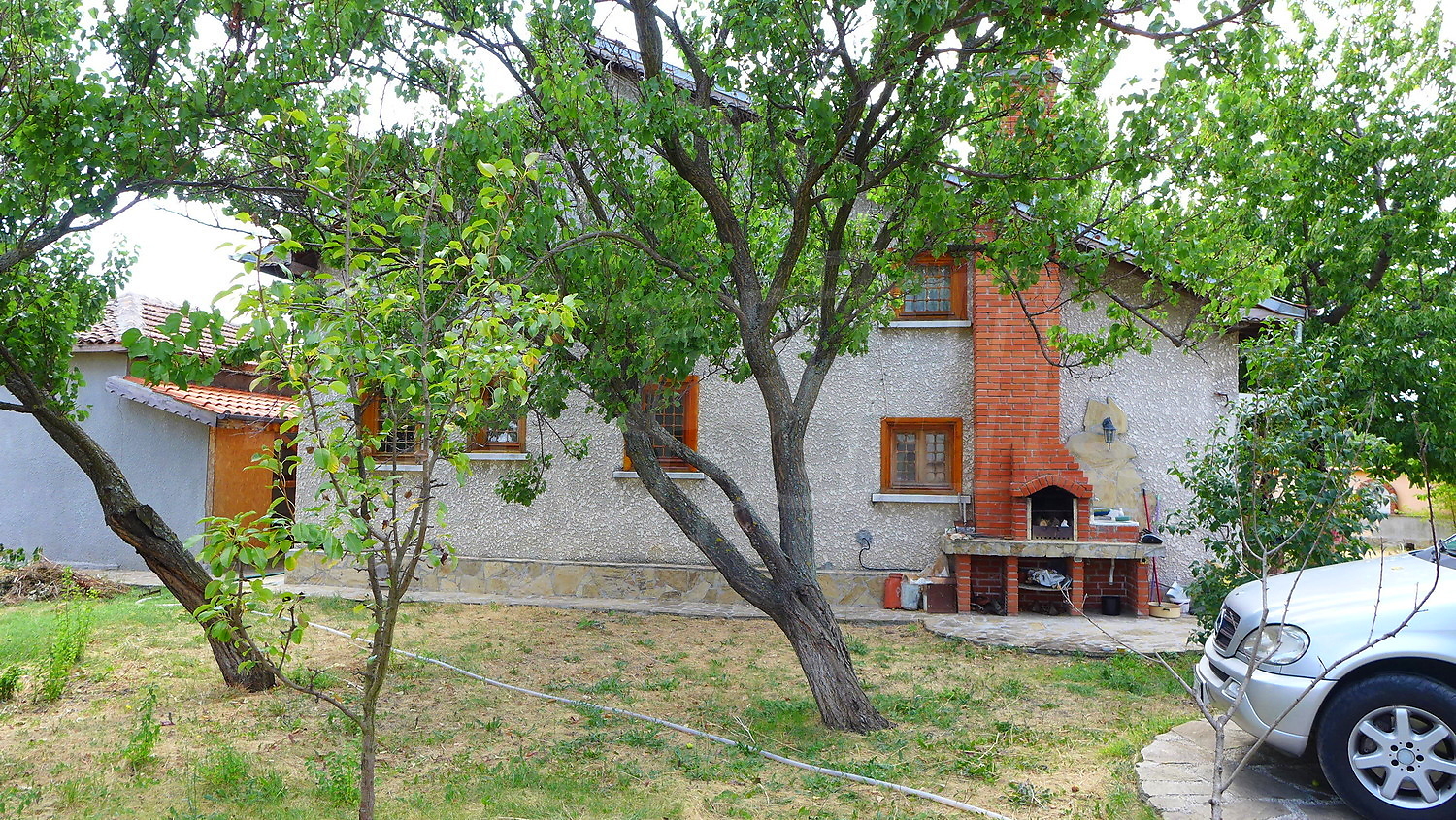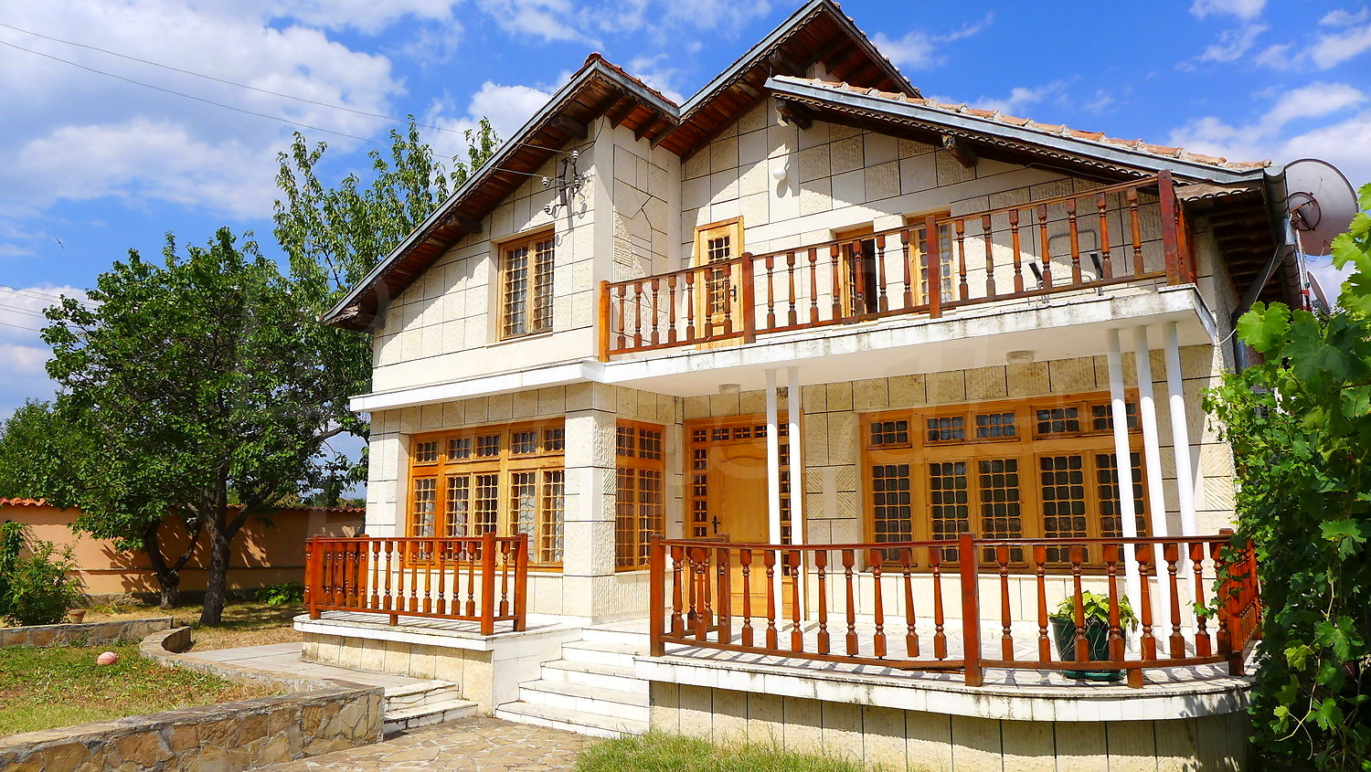 Накратко имотът се състои от голяма къща на два етажа, едноетажна къща за гости, склад, паркинг за 2 коли, гараж, стопански постройки и градина с големина 1525 кв. м.