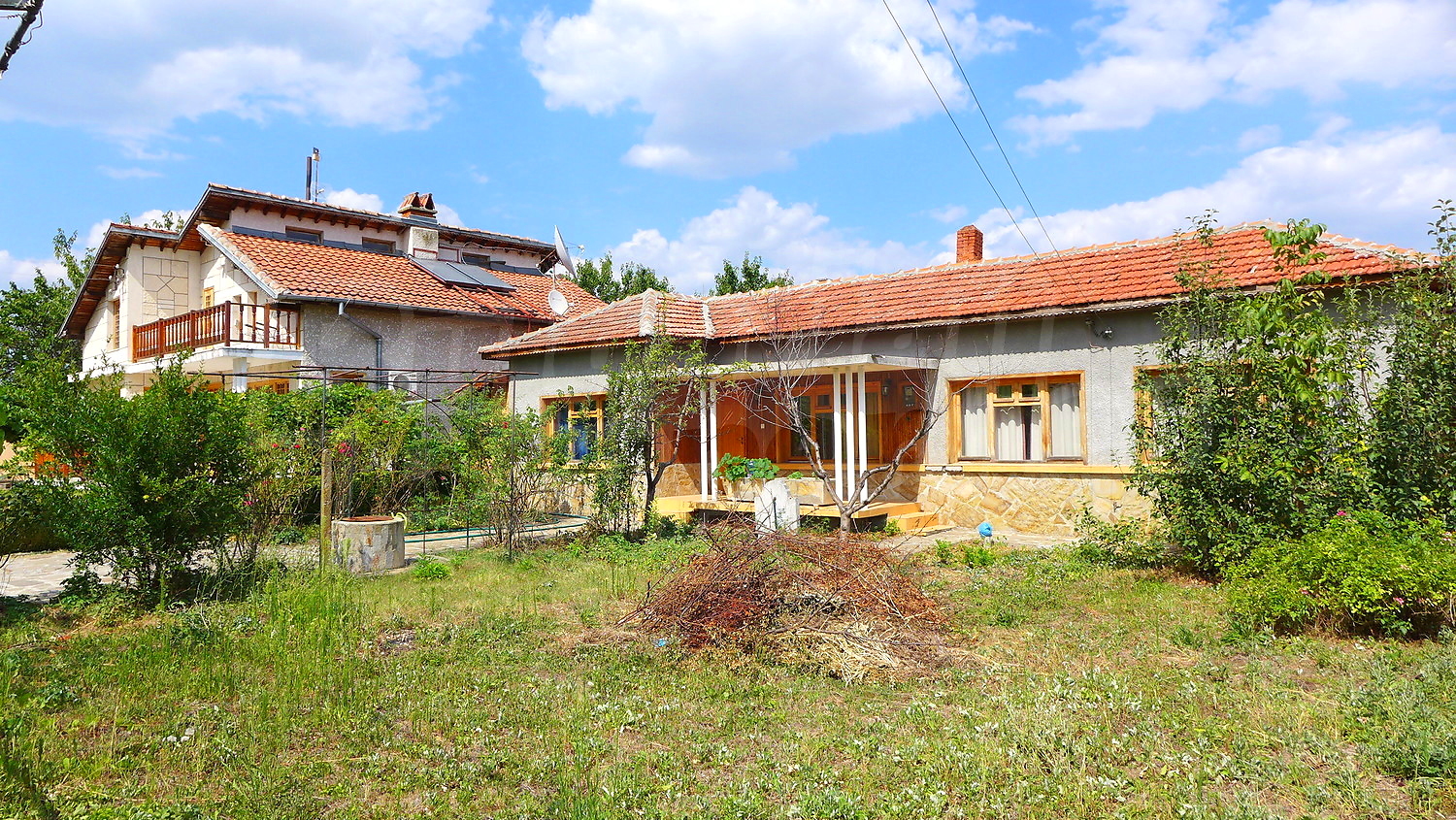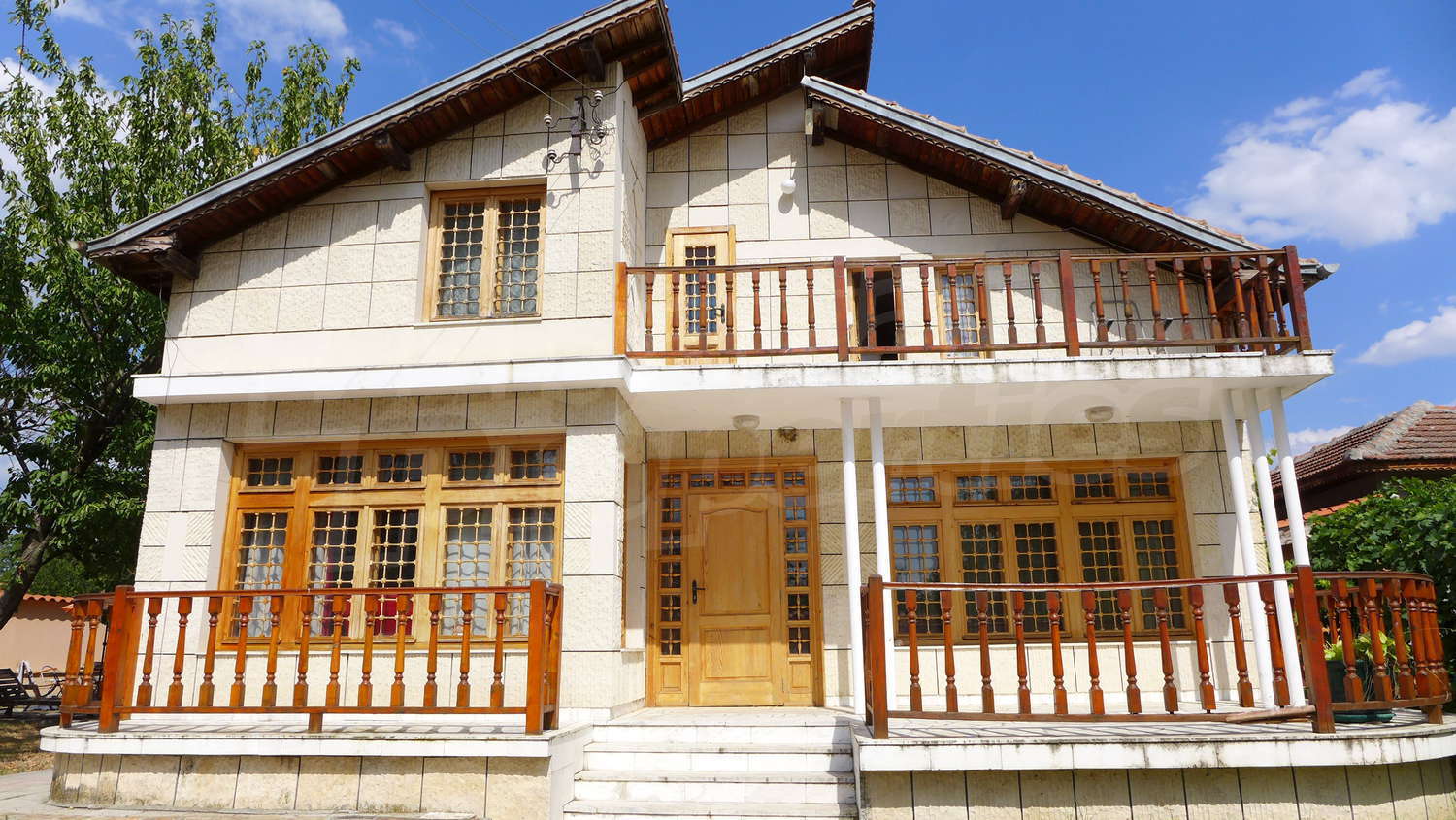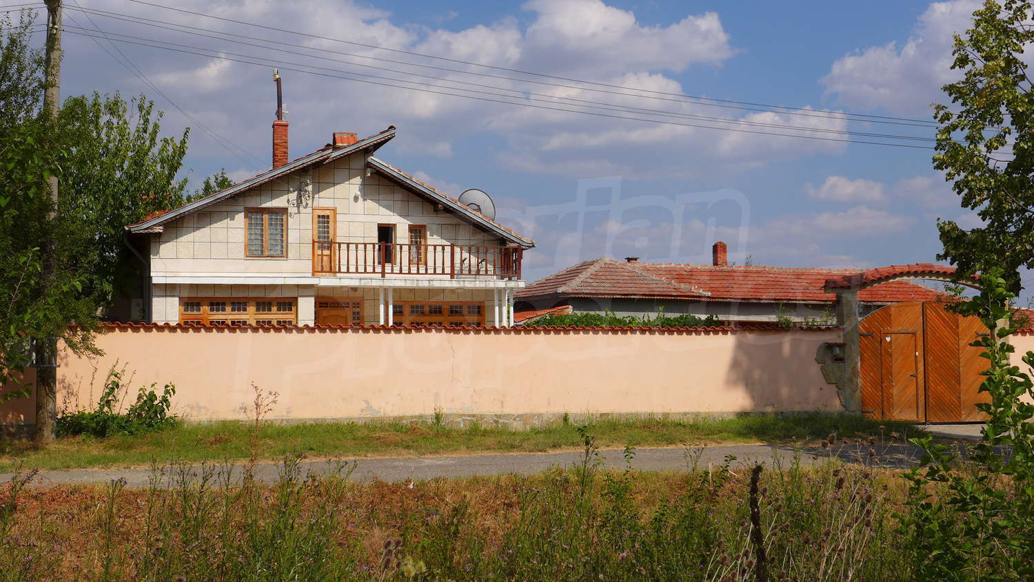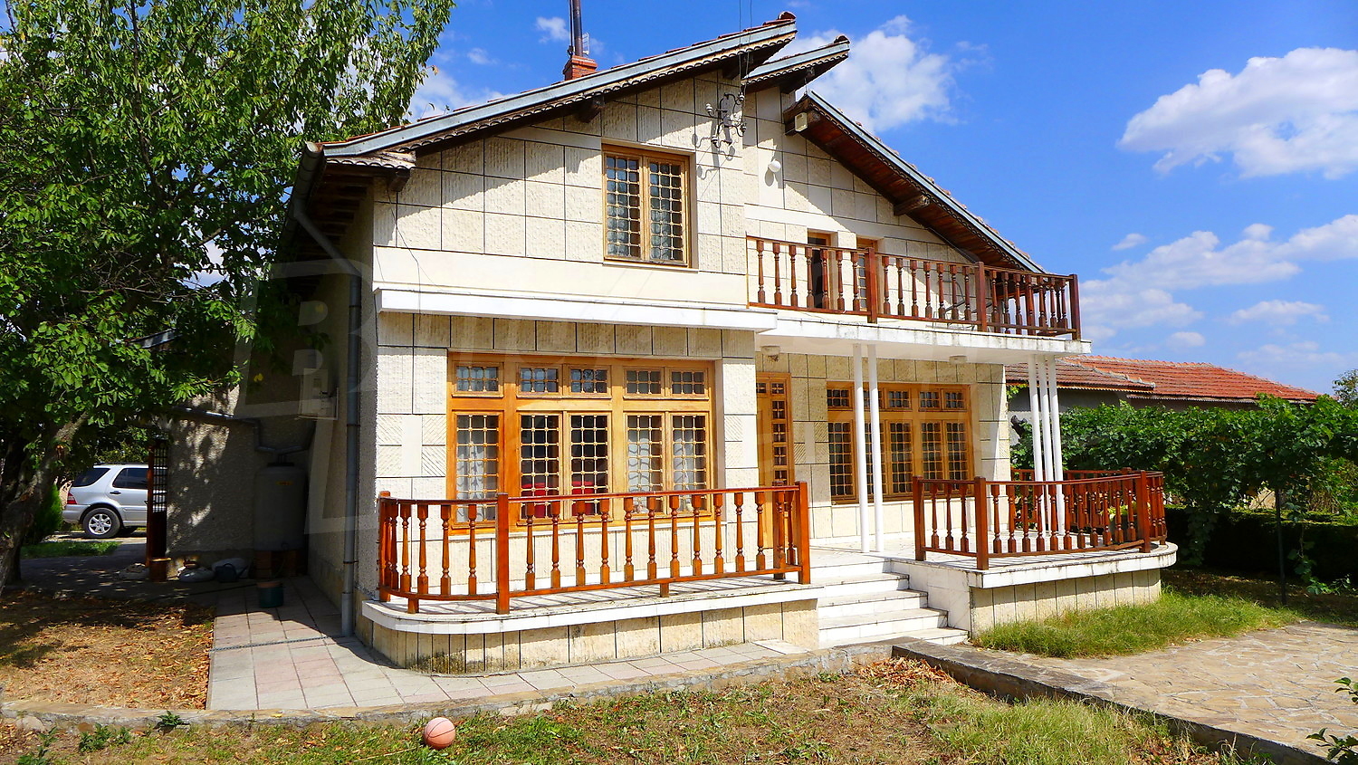Накратко имотът се състои от голяма къща на два етажа, едноетажна къща за гости, склад, паркинг за 2 коли, гараж, стопански постройки и градина с големина 1525 кв. м.
