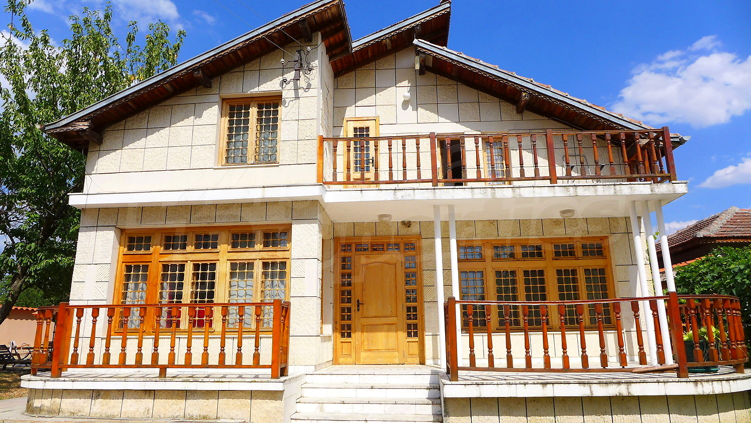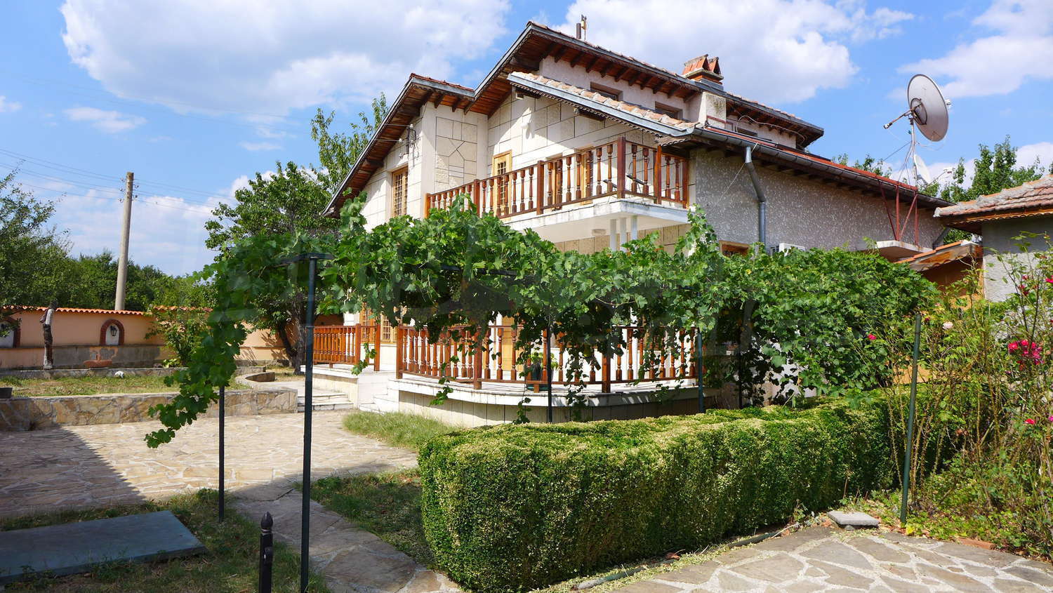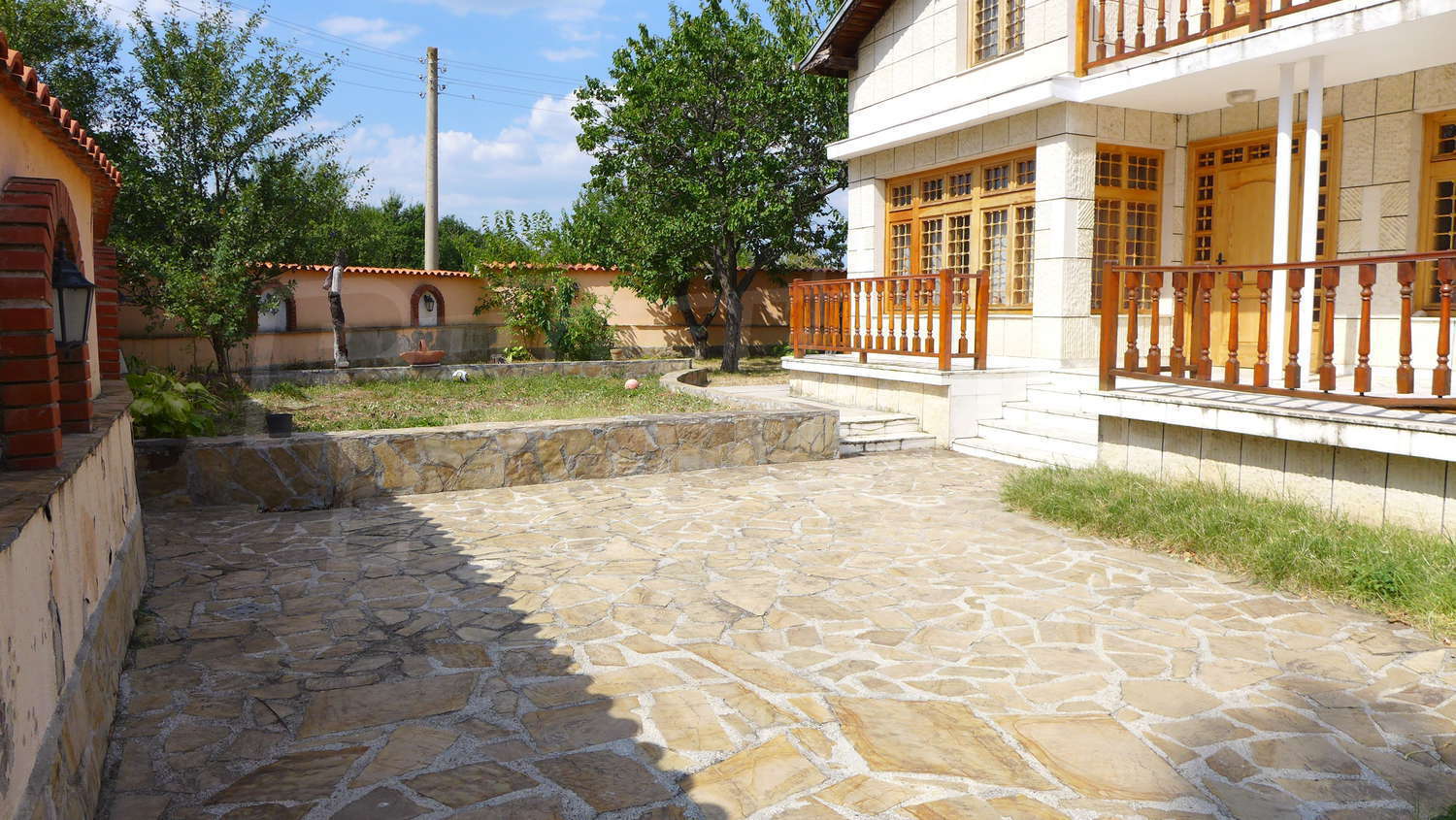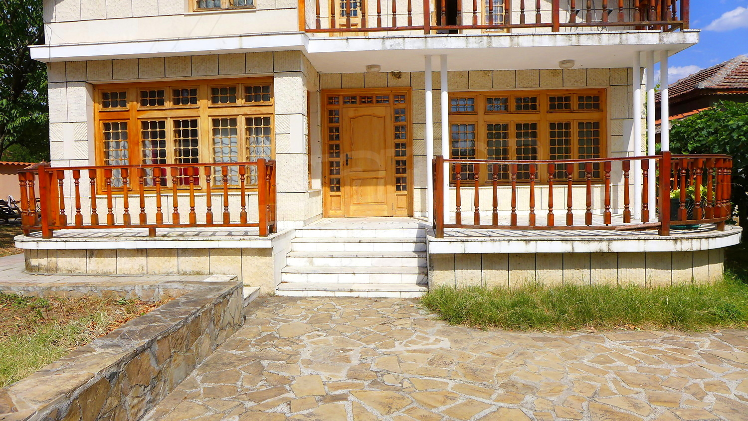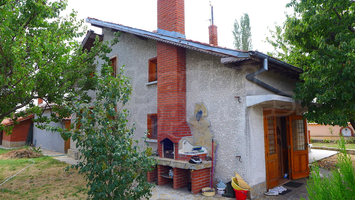 Накратко имотът се състои от голяма къща на два етажа, едноетажна къща за гости, склад, паркинг за 2 коли, гараж, стопански постройки и градина с големина 1525 кв. м.