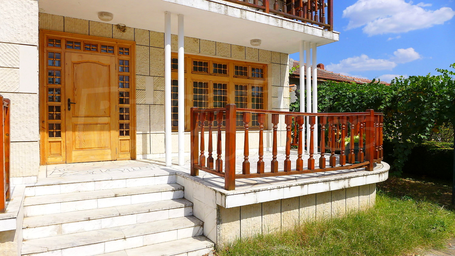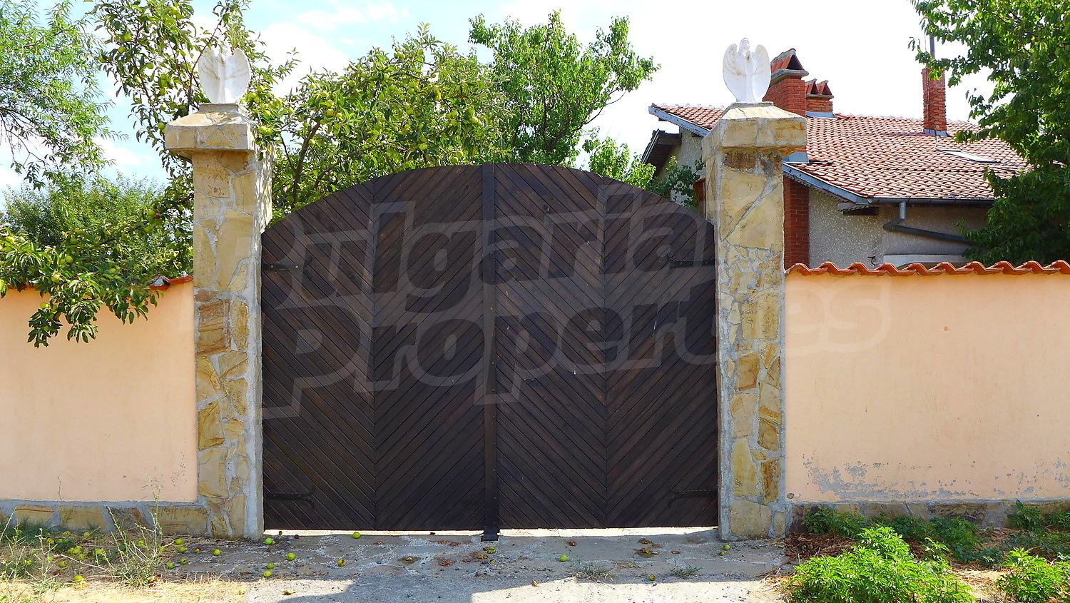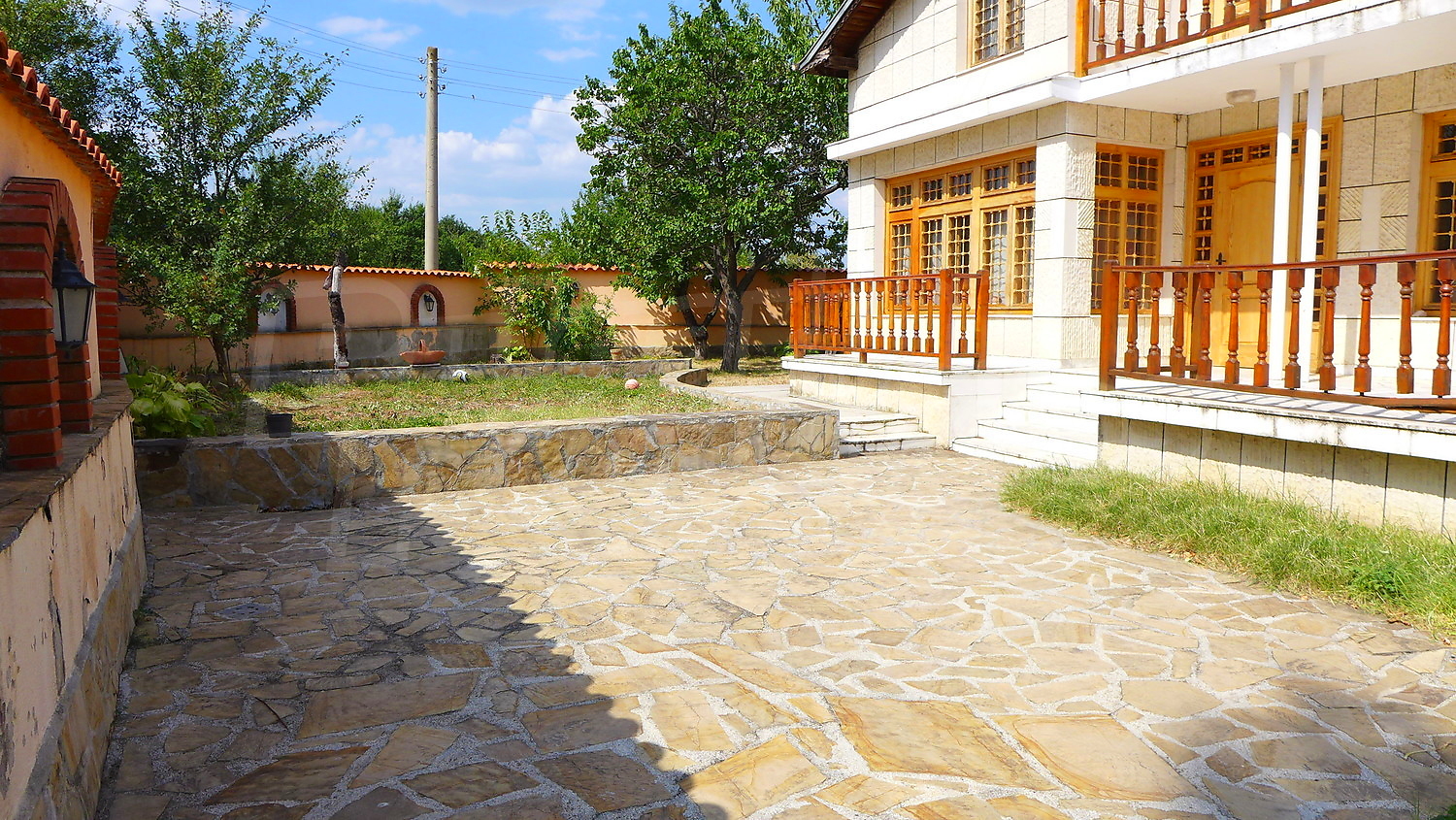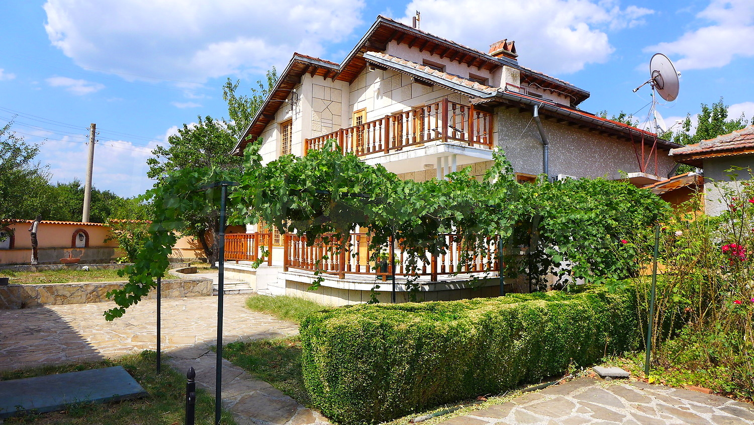 Накратко имотът се състои от голяма къща на два етажа, едноетажна къща за гости, склад, паркинг за 2 коли, гараж, стопански постройки и градина с големина 1525 кв. м.