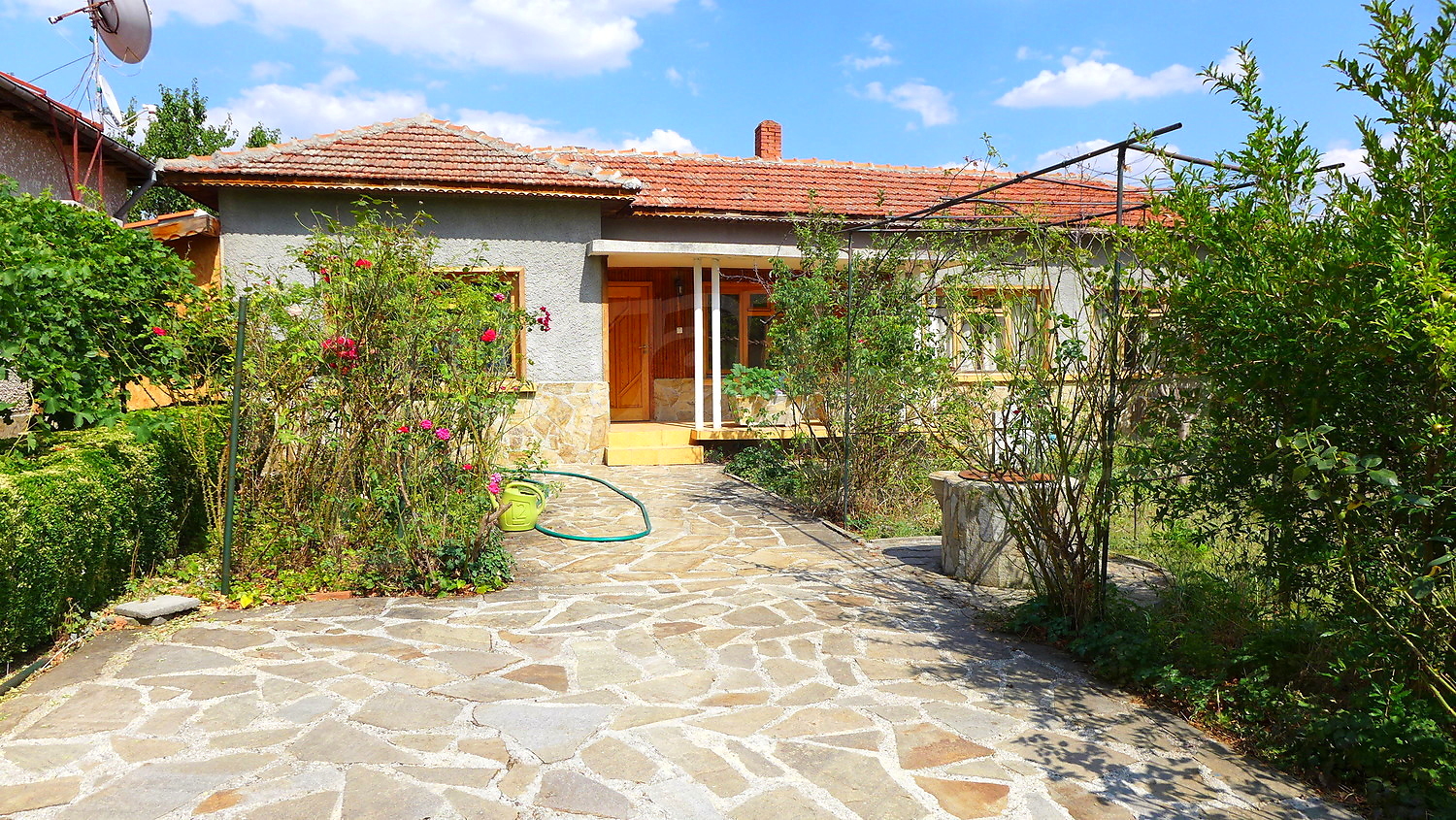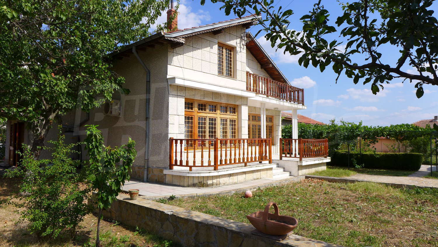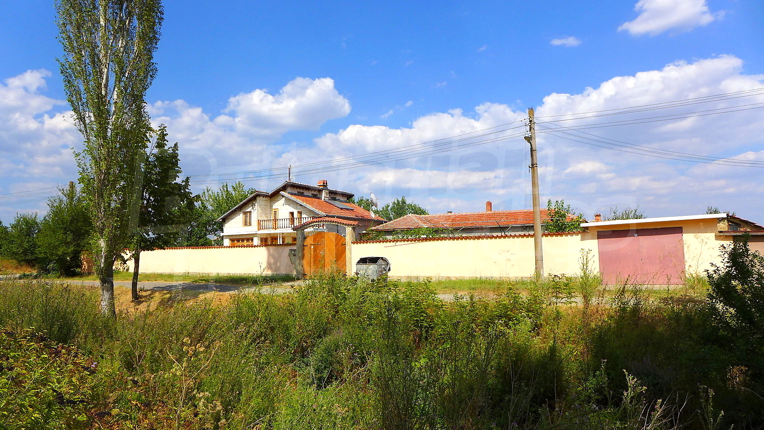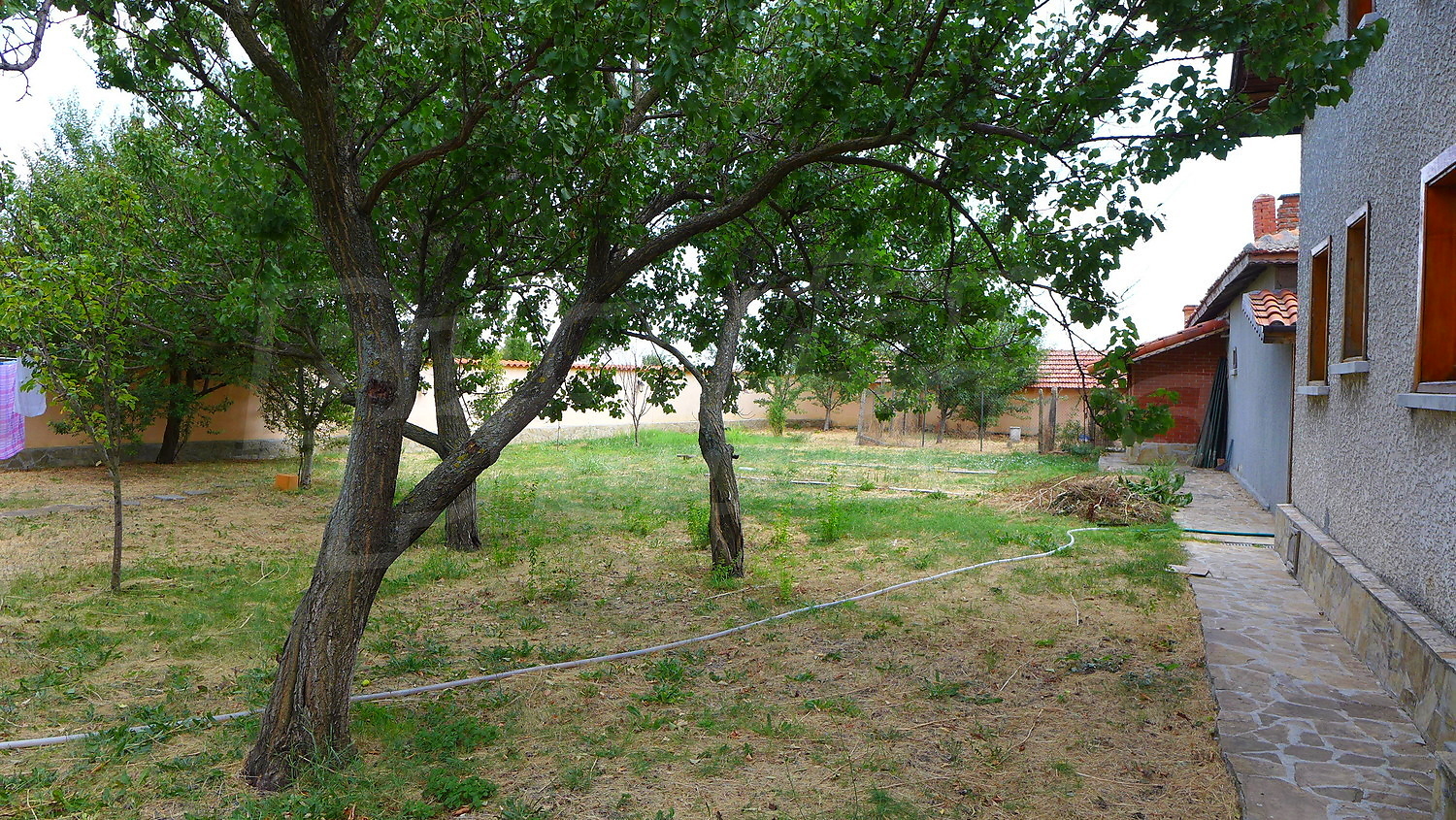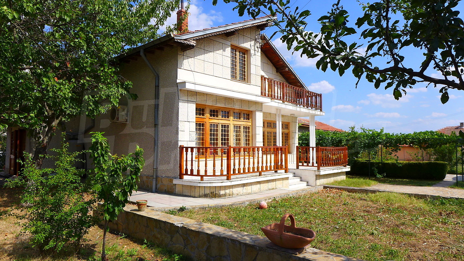 Накратко имотът се състои от голяма къща на два етажа, едноетажна къща за гости, склад, паркинг за 2 коли, гараж, стопански постройки и градина с големина 1525 кв. м.