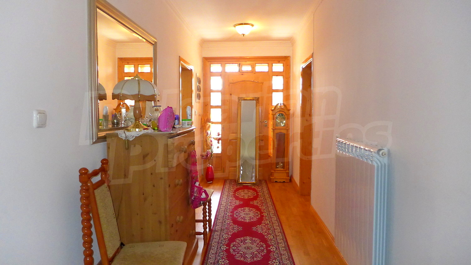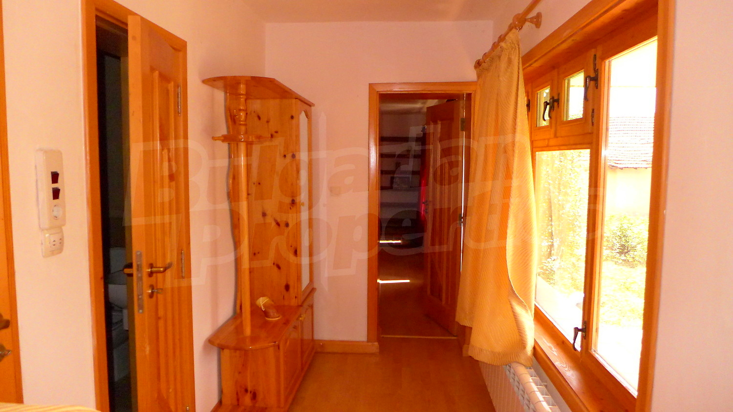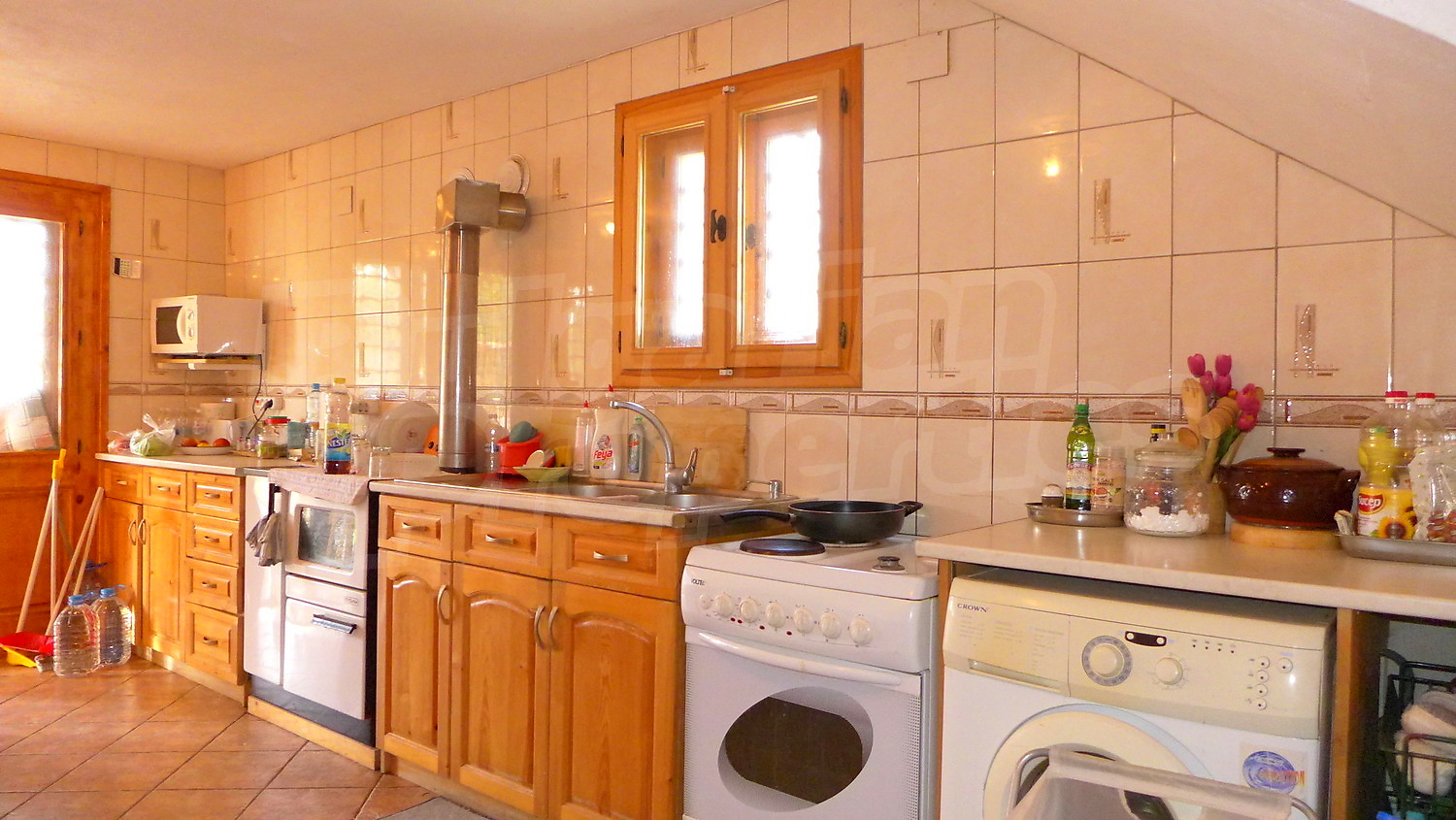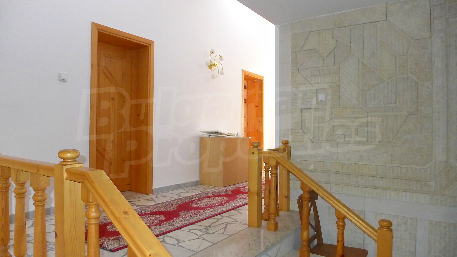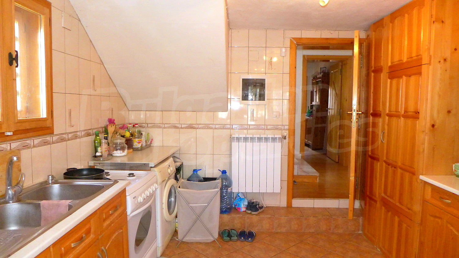 Първи етаж: Жилищната площ тук е разпределена между веранда, два коридора, хол с камина, кухня, всекидневна с камина, тоалетна и баня. В имотът има централно отопление, което се осъществява посредством котел и радиатори във всяка стая. На покрива на имота има соларни панели за отопление на вода. Стените в стаите са с латексово покритие, подът е с естествен паркет с изключение на кухнята /теракот/, а прозорците са с дървен стъклопакет. В кухнята има подово отопление.
