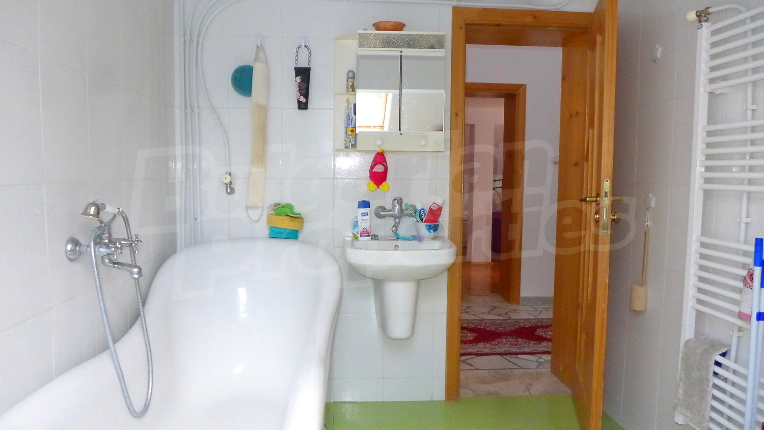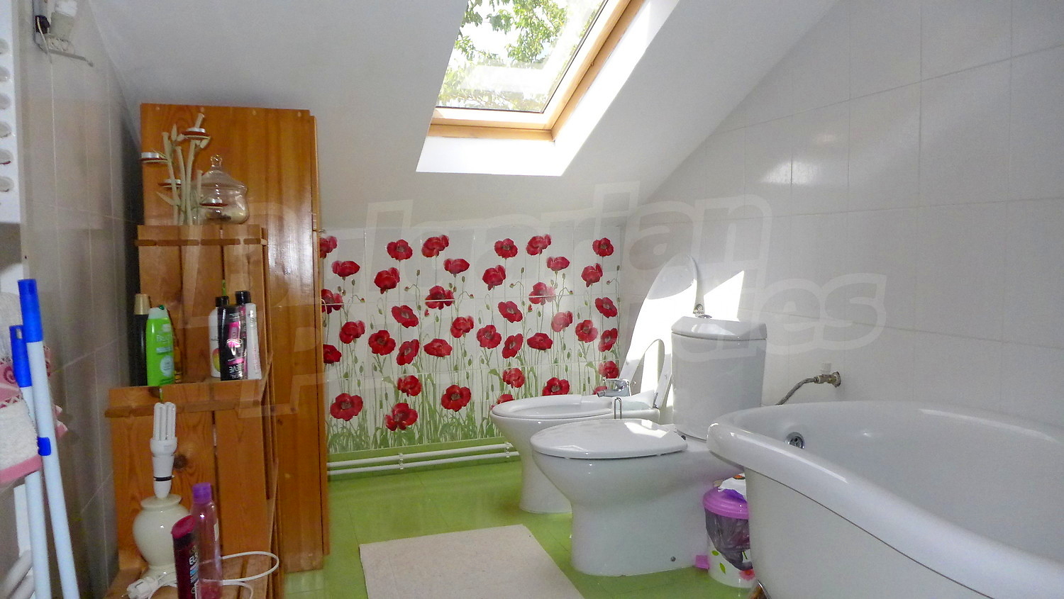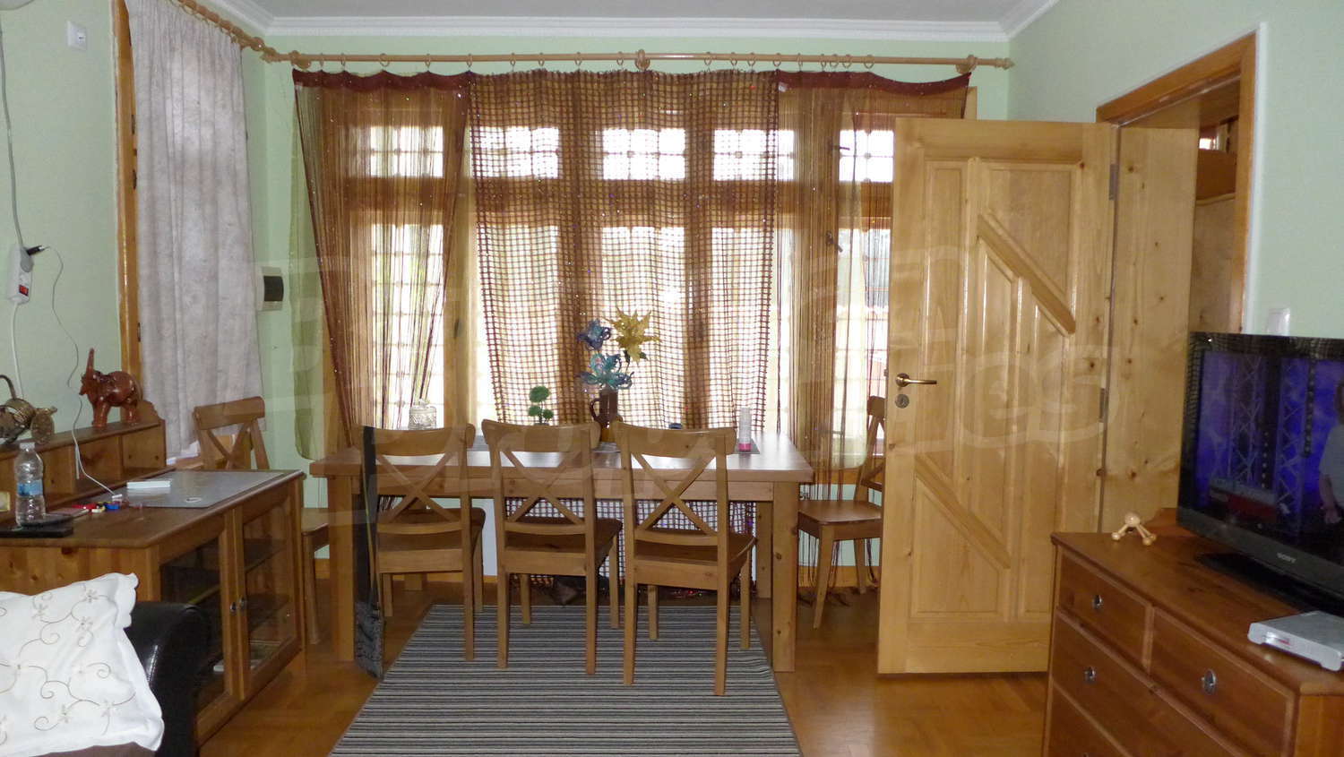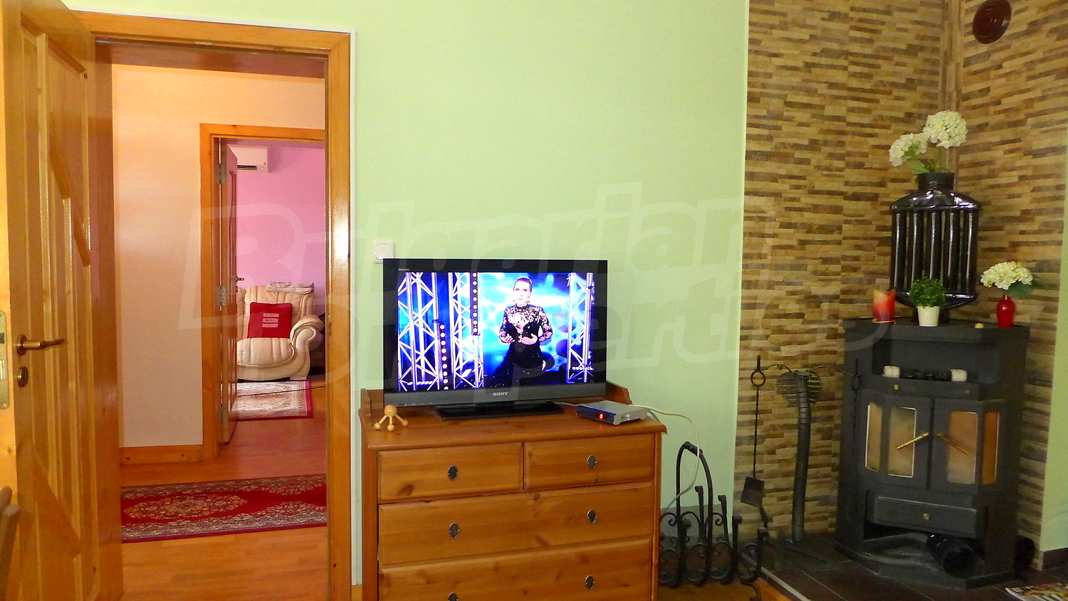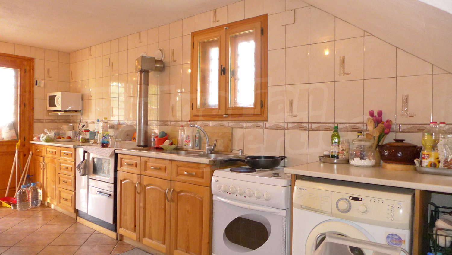 Първи етаж: Жилищната площ тук е разпределена между веранда, два коридора, хол с камина, кухня, всекидневна с камина, тоалетна и баня. В имотът има централно отопление, което се осъществява посредством котел и радиатори във всяка стая. На покрива на имота има соларни панели за отопление на вода. Стените в стаите са с латексово покритие, подът е с естествен паркет с изключение на кухнята /теракот/, а прозорците са с дървен стъклопакет. В кухнята има подово отопление.