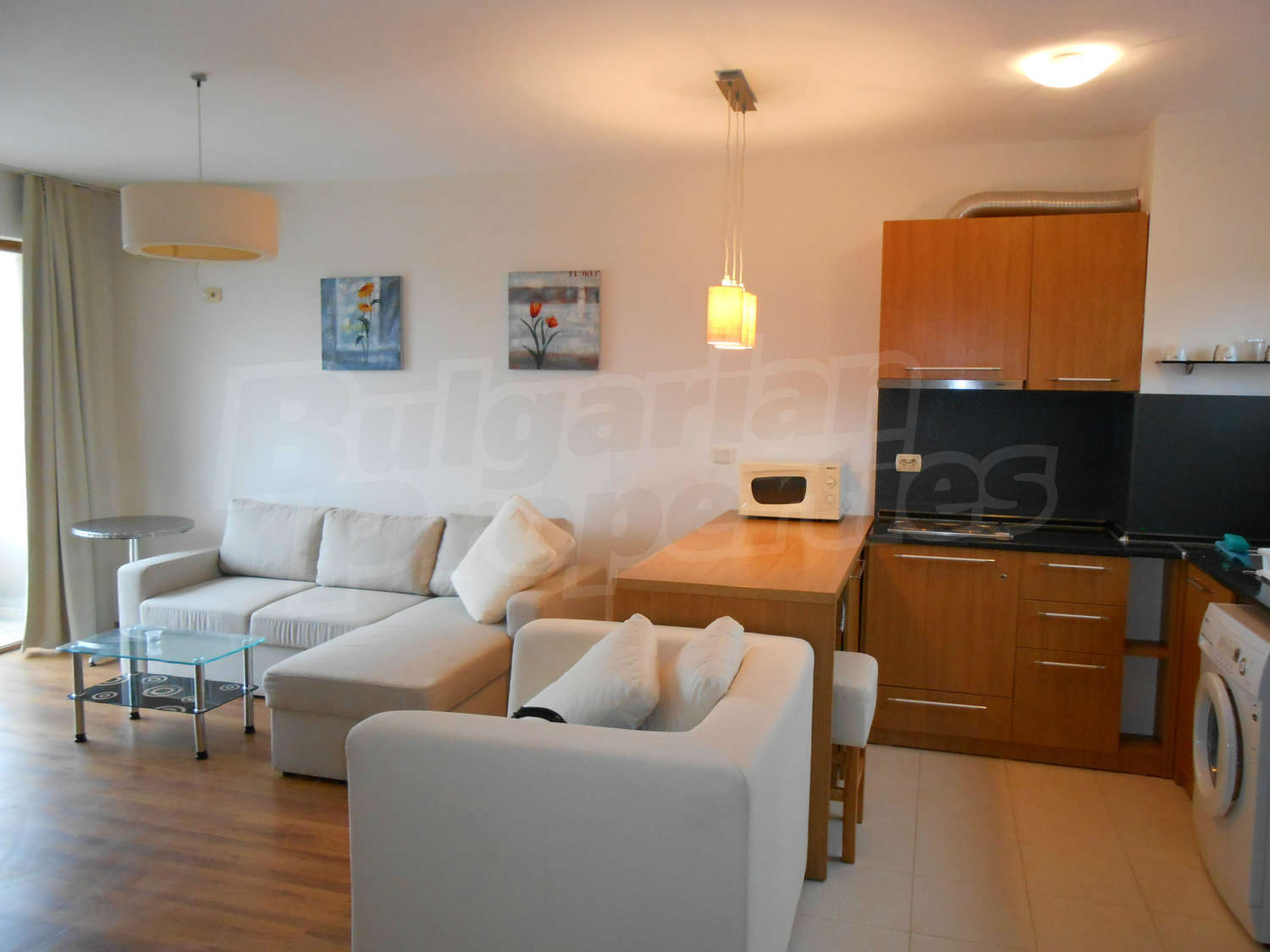 - Кухня – мивка, керамични котлони, аспиратор, фурна, пералня, микровълнова печка, хладилник;