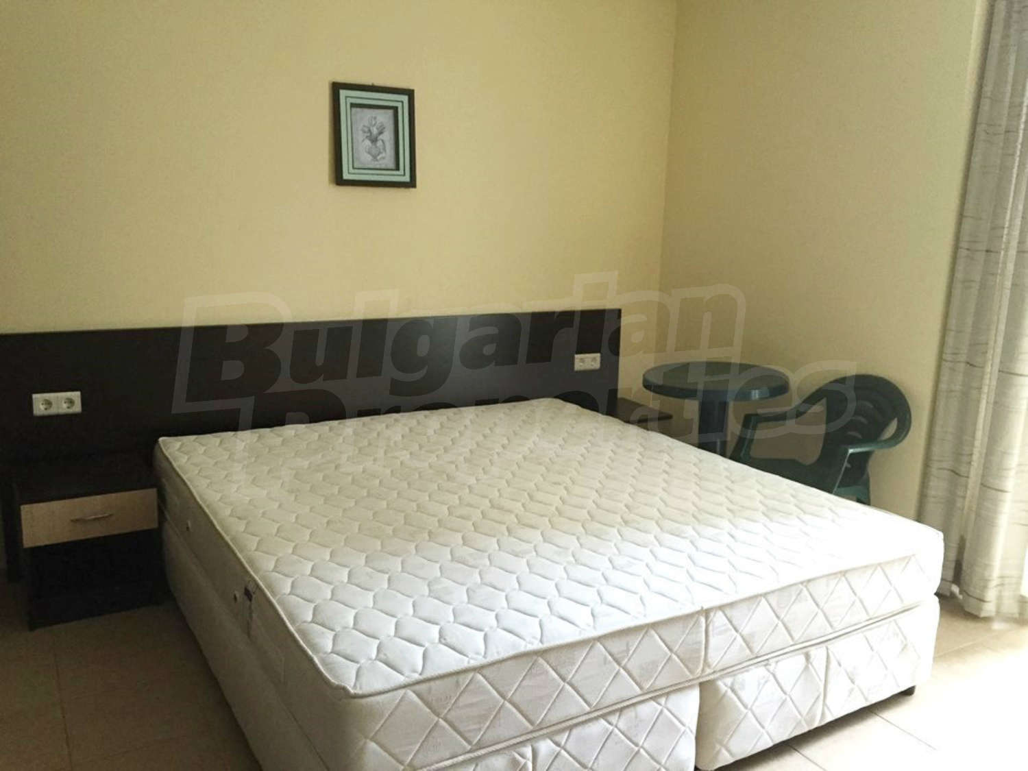 Студиото се състои от едно общо помещение с трапезарна част и кухненски бокс, спалня и баня с тоалетна и душ. Оборудването на жилището включва електрически котлони, аспиратор, хладилник, маса, двойно легло, гардероб, бюро, нощни шкафчета. Апартаментът е напълно обзаведен и готов за живеене или отдаване под наем. Намира се на партерен етаж. Годишната такса за поддръжка на комплекса е 16 Евро на кв.м.