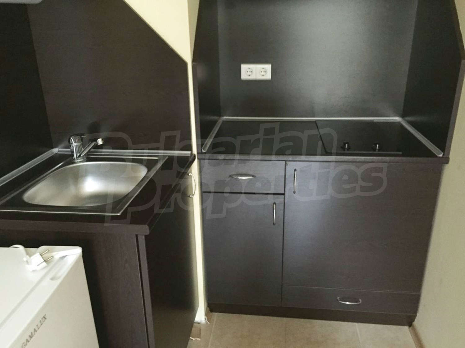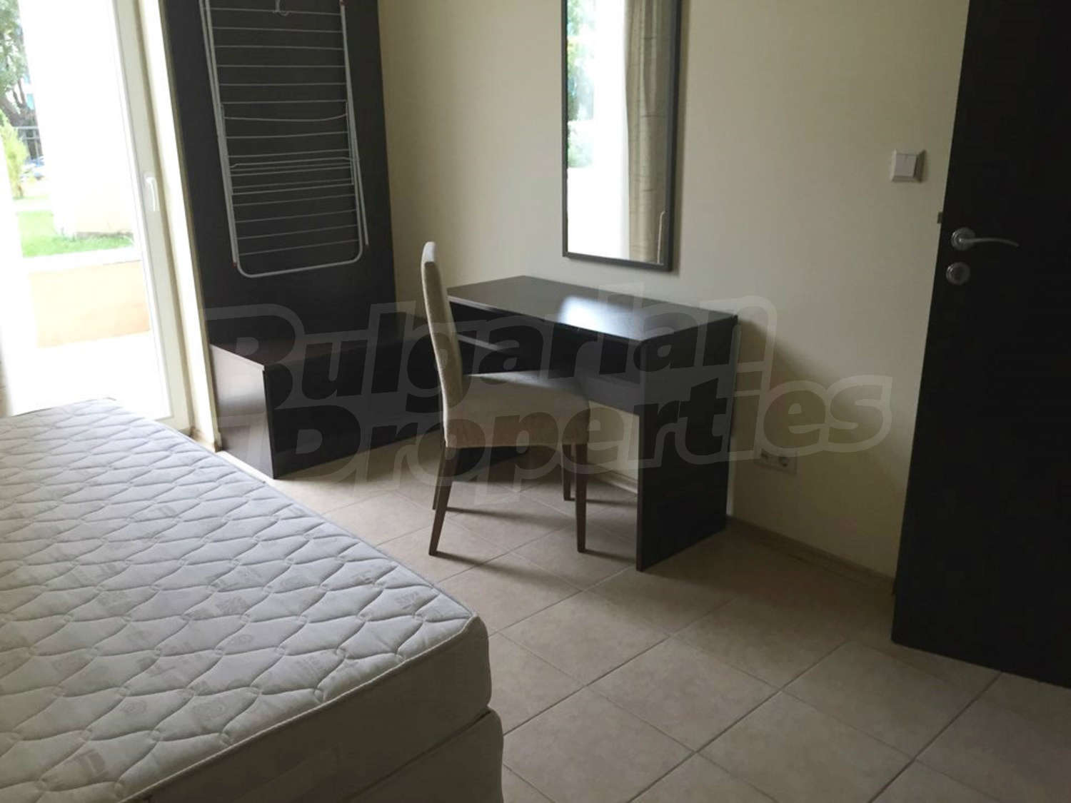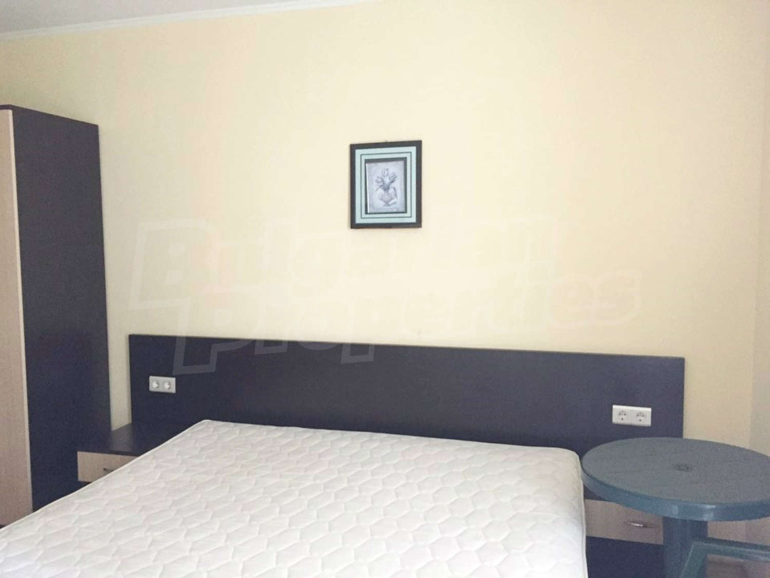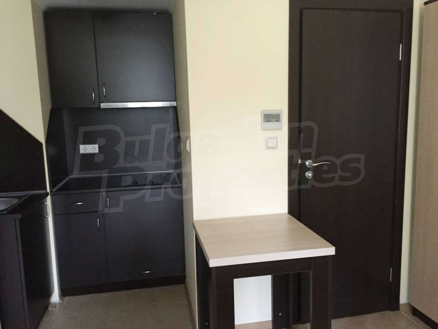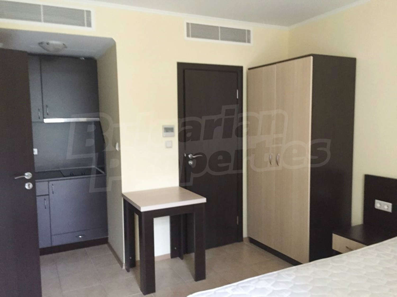 Студиото се състои от едно общо помещение с трапезарна част и кухненски бокс, спалня и баня с тоалетна и душ. Оборудването на жилището включва електрически котлони, аспиратор, хладилник, маса, двойно легло, гардероб, бюро, нощни шкафчета. Апартаментът е напълно обзаведен и готов за живеене или отдаване под наем. Намира се на партерен етаж. Годишната такса за поддръжка на комплекса е 16 Евро на кв.м.