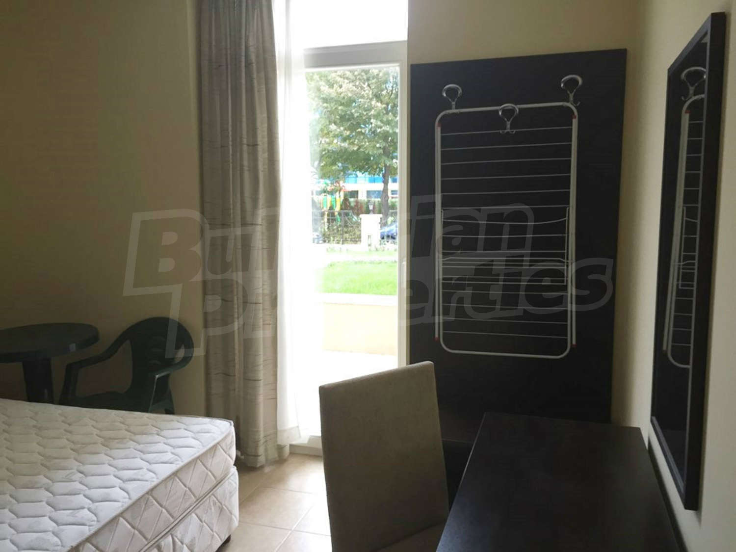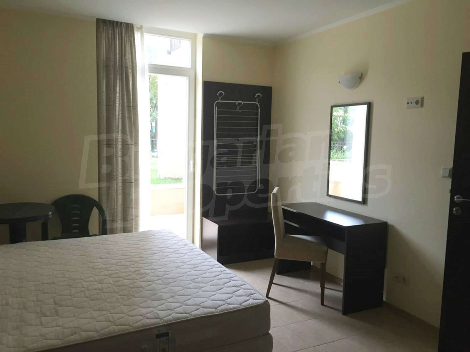Студиото се състои от едно общо помещение с трапезарна част и кухненски бокс, спалня и баня с тоалетна и душ. Оборудването на жилището включва електрически котлони, аспиратор, хладилник, маса, двойно легло, гардероб, бюро, нощни шкафчета. Апартаментът е напълно обзаведен и готов за живеене или отдаване под наем. Намира се на партерен етаж. Годишната такса за поддръжка на комплекса е 16 Евро на кв.м.