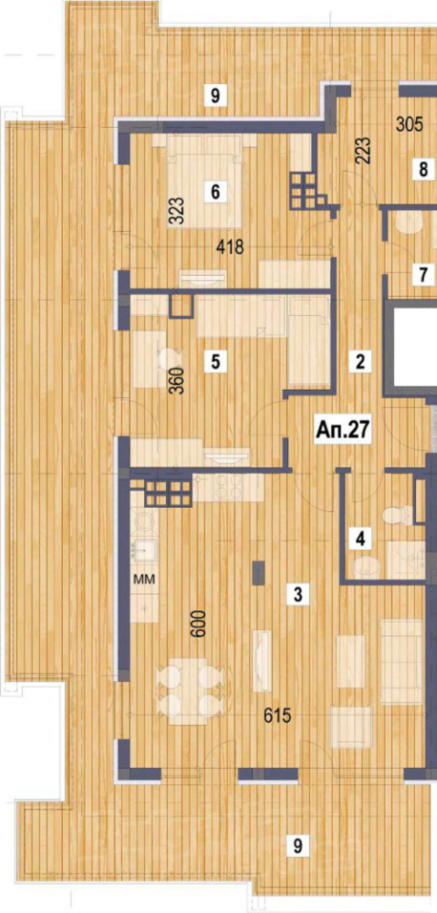Сградата се състои от различни по големина апартаменти, разположени на осем надземни етажа, магазини, паркинги и паркоместа на приземния етаж. Апартаментите се продават в степен на завършеност БДС, под – циментова замазка, стени – гипсова мазилка, тавани – гипсова мазилка, врати: външна – блиндирана, дограма - ПВЦ, изградени до точка ОВ, електрическа и ВИК инсталации.