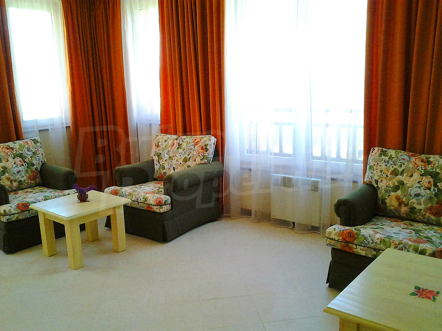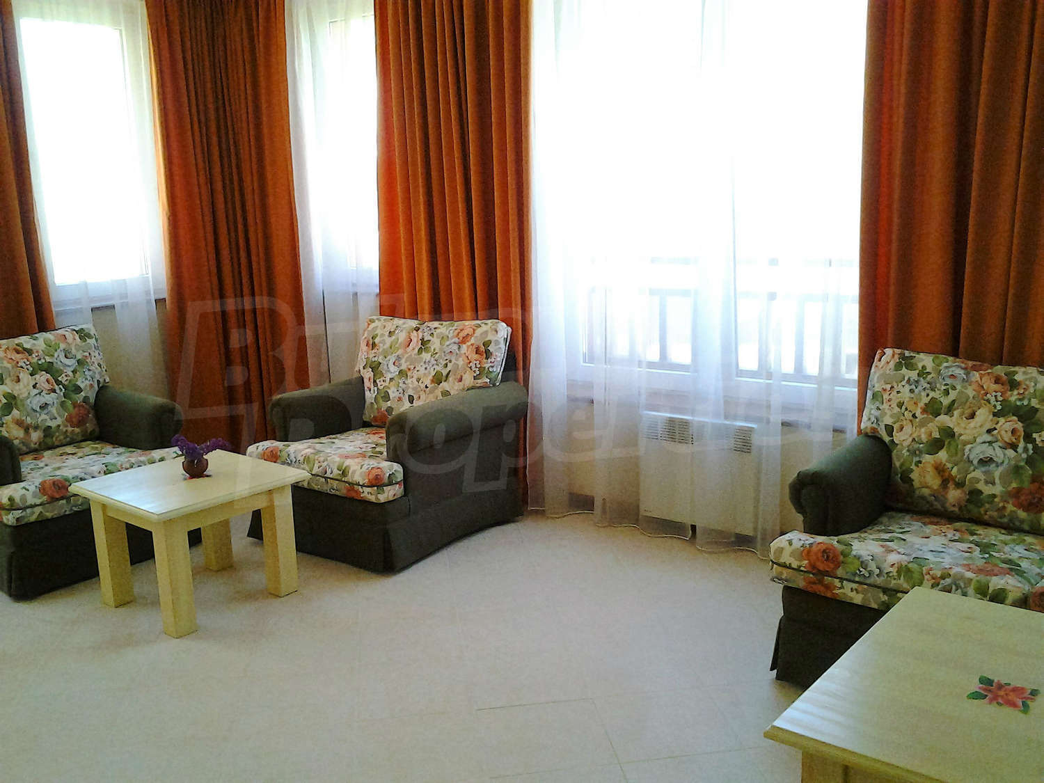 • Дневна - две единични кресла, двукрилен гардероб, разтегателен диван-легло, телевизор, поставка за телевизор, маса за хранене, 4 стола за хранене, щори;