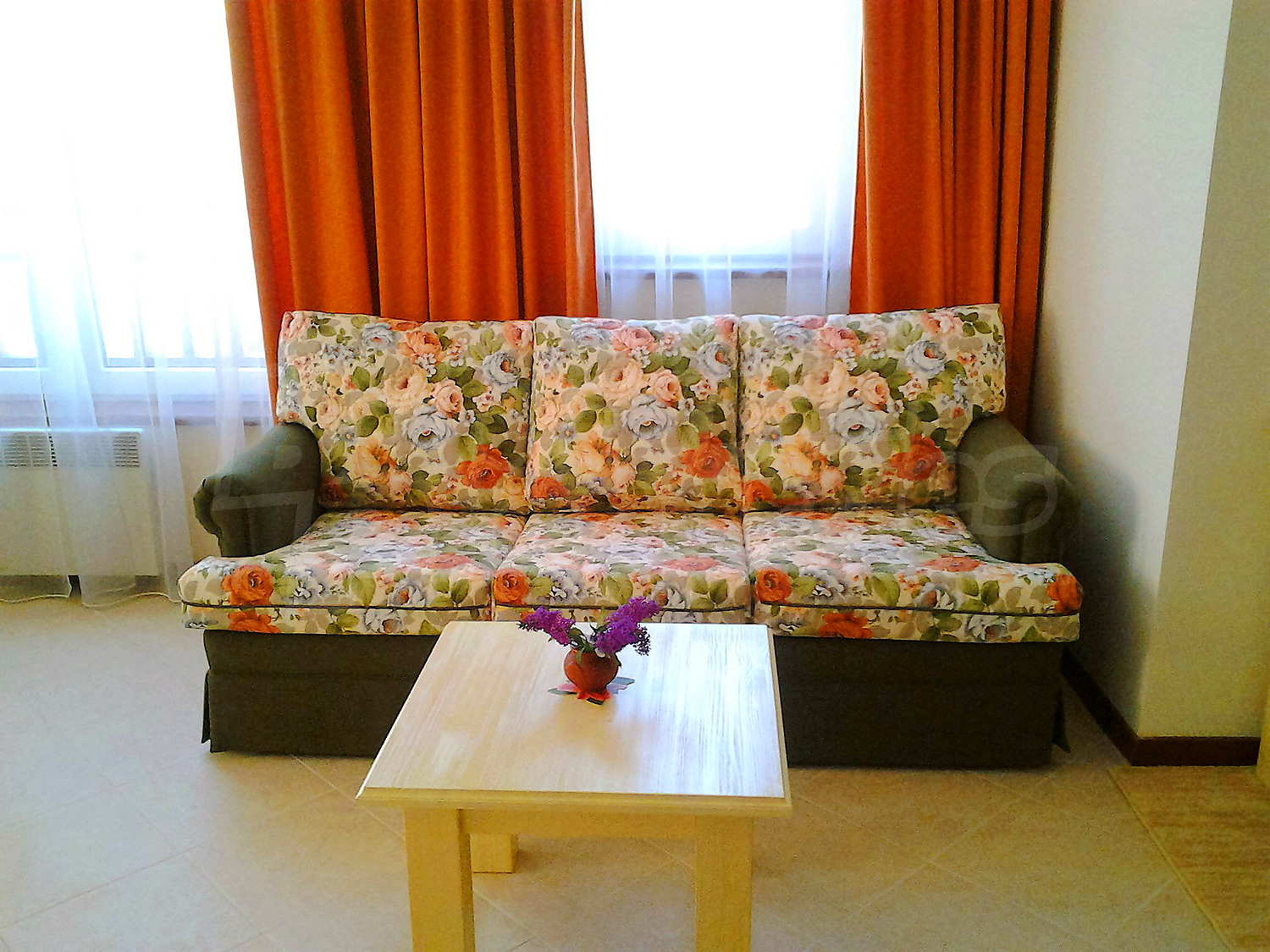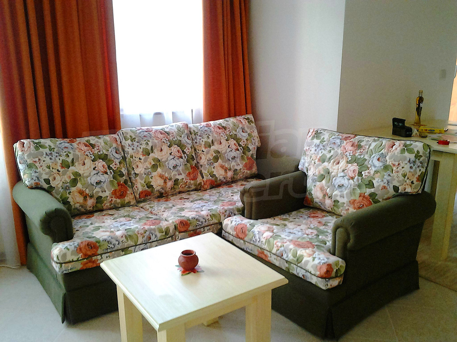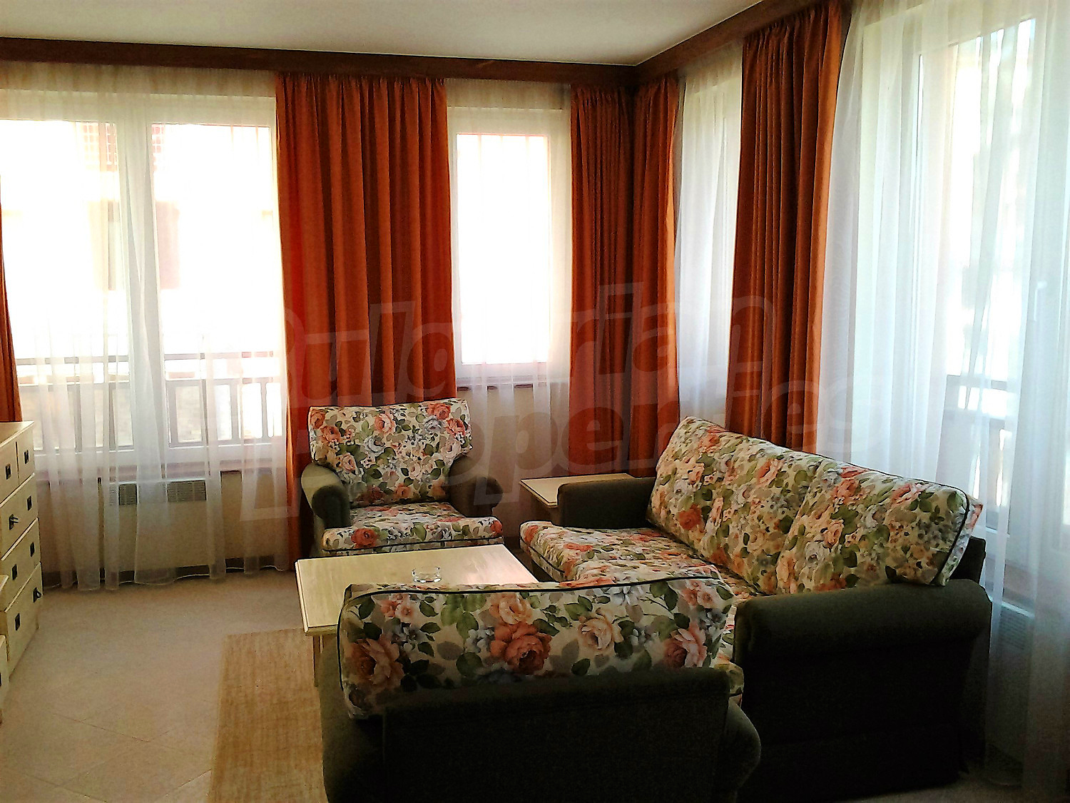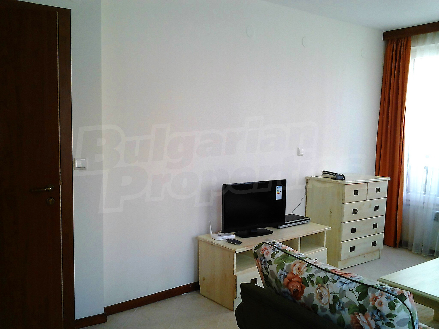 • Дневна - две единични кресла, двукрилен гардероб, разтегателен диван-легло, телевизор, поставка за телевизор, маса за хранене, 4 стола за хранене, щори;