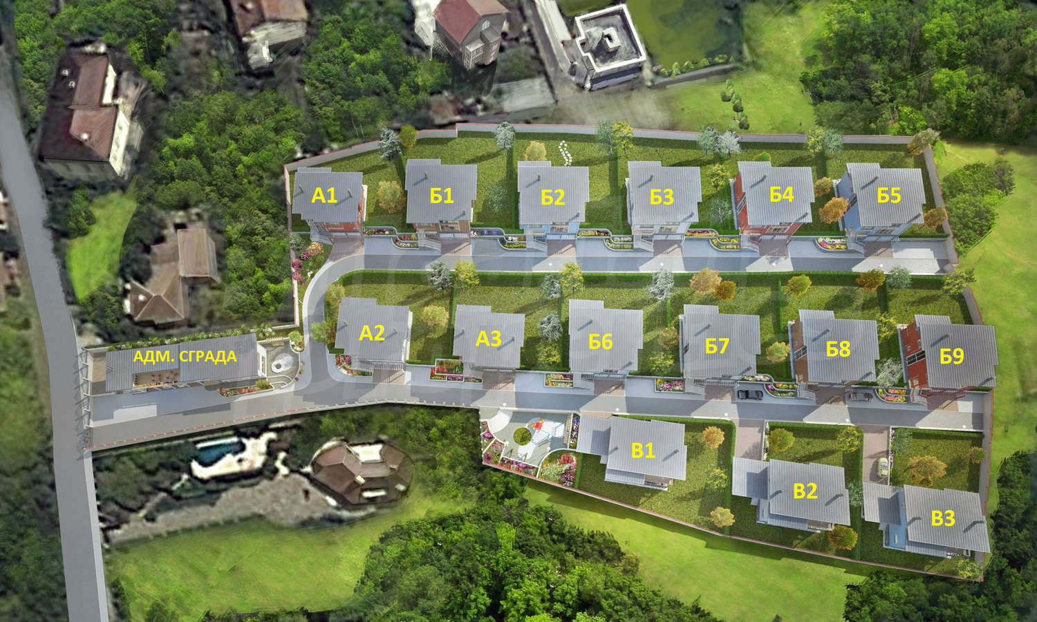 Селището е изградено върху обща площ от 12330 кв.м. Състои се от 13 еднофамилни къщи с РЗП от 348 кв.м. до 441 кв.м., обща РЗП 6215 кв.м., детска площадка и административна офис сграда с паркоместа за гости, която не е включена в общата РЗП. Къщите са три типа: тип А – 3 къщи, тип Б – 9 къщи и тип В – 1 къща, всяка със собствен парцел с размери от 650 кв.м. до 720 кв.м., с идеални части от правото на собственост и реална част ползване, обособена с отделна телена ограда и жив плет с височина 2,2м. Във всеки един от дворовете има достатъчно място за изграждане на открит басейн.Къщите се продават завършени по БДС, като са инсталирани предварително: отоплителната инсталация с подово отопление и конвектори с термопомпа, охлаждащата инсталация - термопомпа, пълна автоматизация на всички системи тип(умен дом), вградена прахосмукачка, отделен термопомпен бойлер за гореща вода 270л. и др. Имате готова възможност за избор между три дизайнерски интериорни решения, които срещу допълнителна сума, могат да бъдат изпълнени. Такса поддръжка 1 ( едно евро ) на квадратен метър на месец.