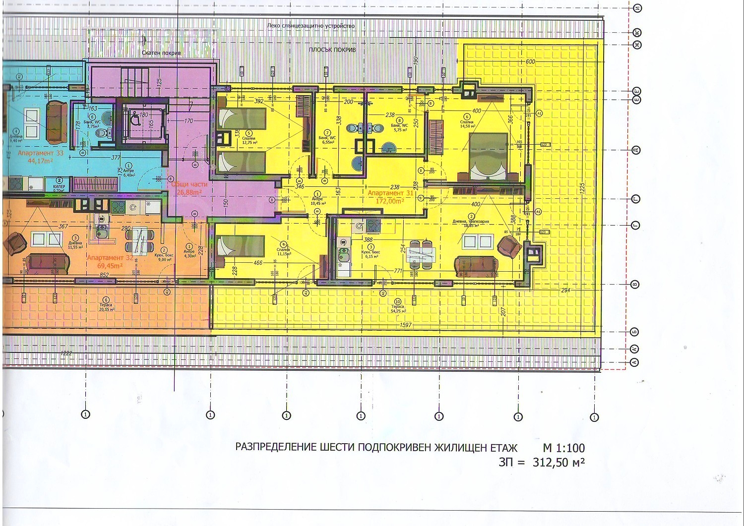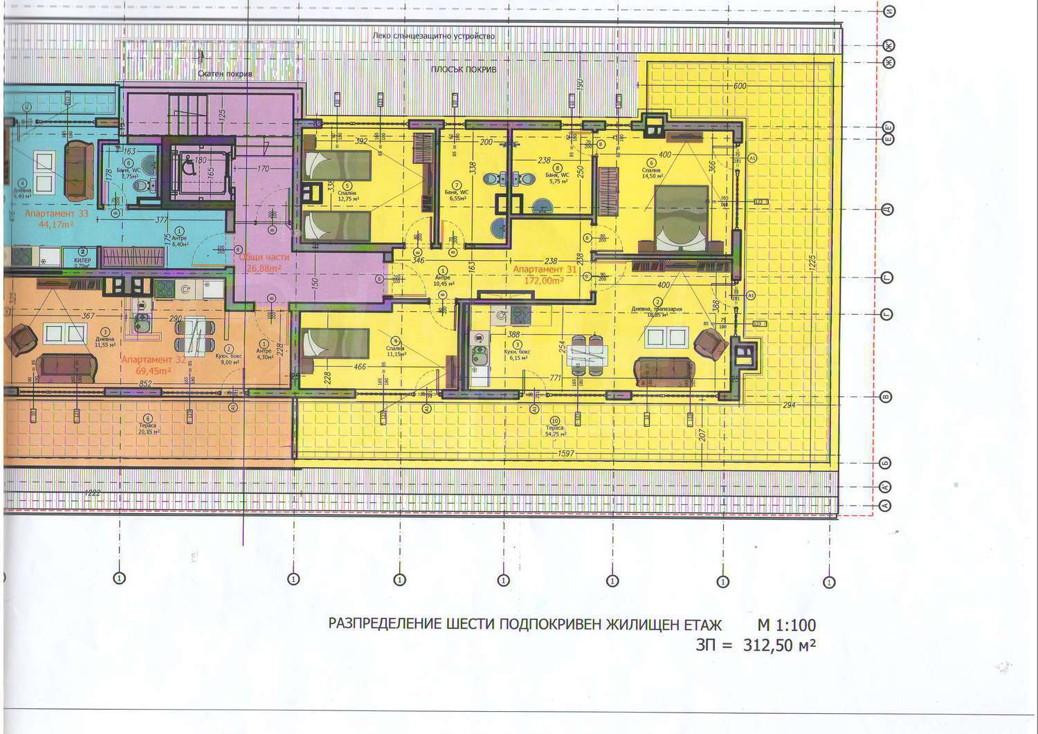Тристаен апартамент в нова сграда в Студентски град, недалеч от Зимния Дворец. Жилището е с обща площ от 252 кв.м. (застроена площ 172 кв.м.), намира се на пети жилищен етаж над партер, изложението е югоизток. Предава се в следната степен на завършеност: