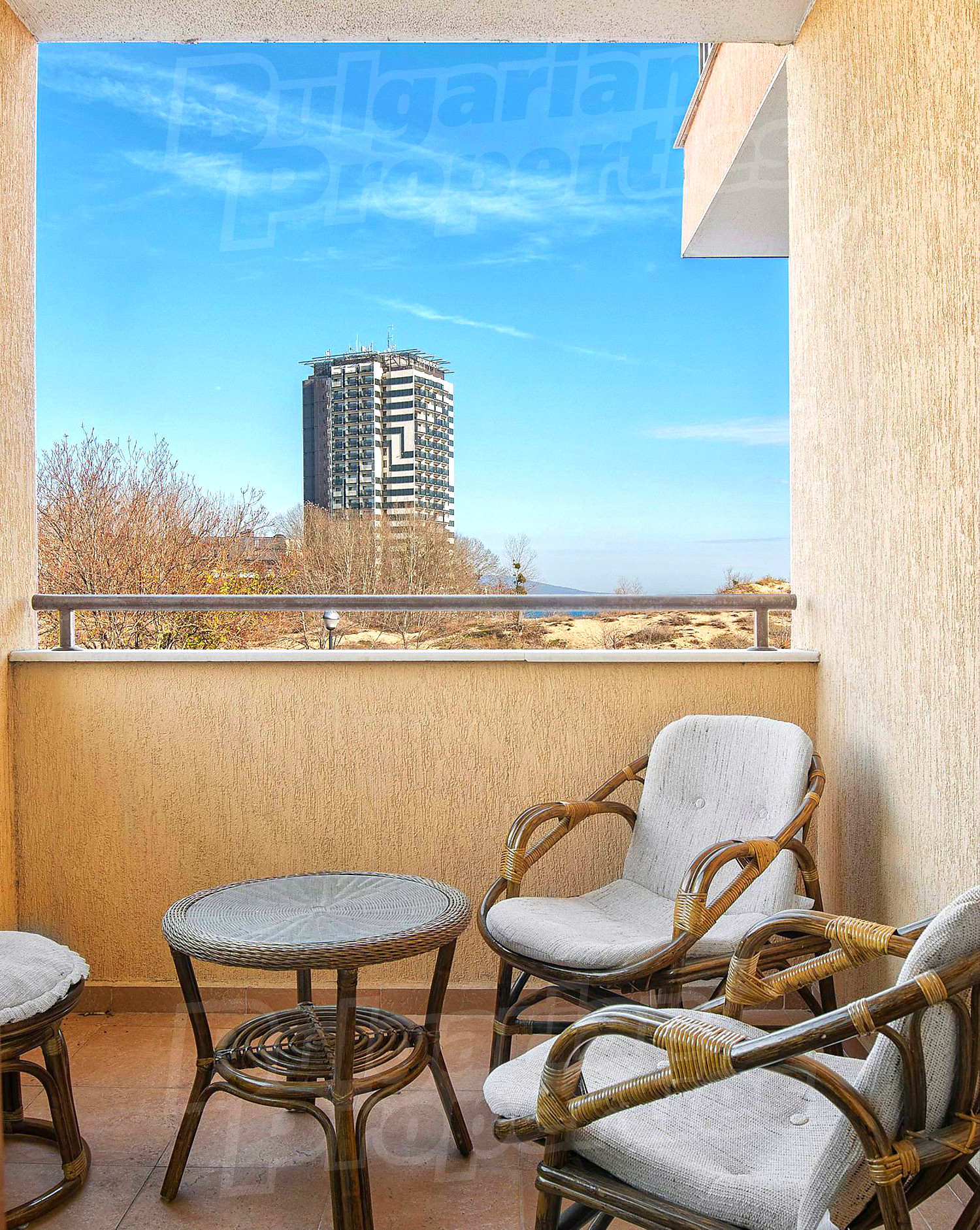 Предлагаме на вашето внимание стилен и светъл двустаен апартамент в затворен комплекс Golden Beach, разположен непосредствено до хотел "Тиара Бийч" и красивите естествени пясъчни дюни, с прекрасна морска панорама. В същото време, комплексът е и в непосредствена близост до центъра на курорта с множеството ресторанти, клубове и атракции. Наистина много добра локация!