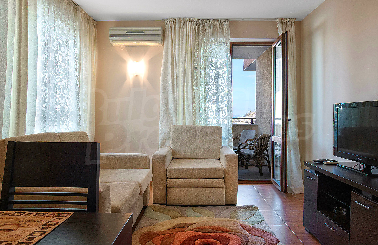 Жилището с обща площ от 66.69 кв.м. и чиста площ 57 кв.м., намира се на втори етаж. Състои се от една спалня, дневна с кухненски бокс, баня с душ кабина и тоалетна и балкон. Апартаментът е много удобен и има всичко необходимо за комфортен престой - телевизор във всяка стая, сешоар, пералня, климатик, фурна, електрически котлони, аспиратор, маса за хранене със четири стола. От балкона се разкрива гледка към вътрешния двор на комплекса с басейна и към морето. Имотът се предлага със следната степен на завършеност: PVC дограма, двоен стъклопакет, интериорни врати, подове с теракот и стени боядисани с латекс. Годишната такса за поддръжка на комплекса е 9.5 Евро на кв. м.